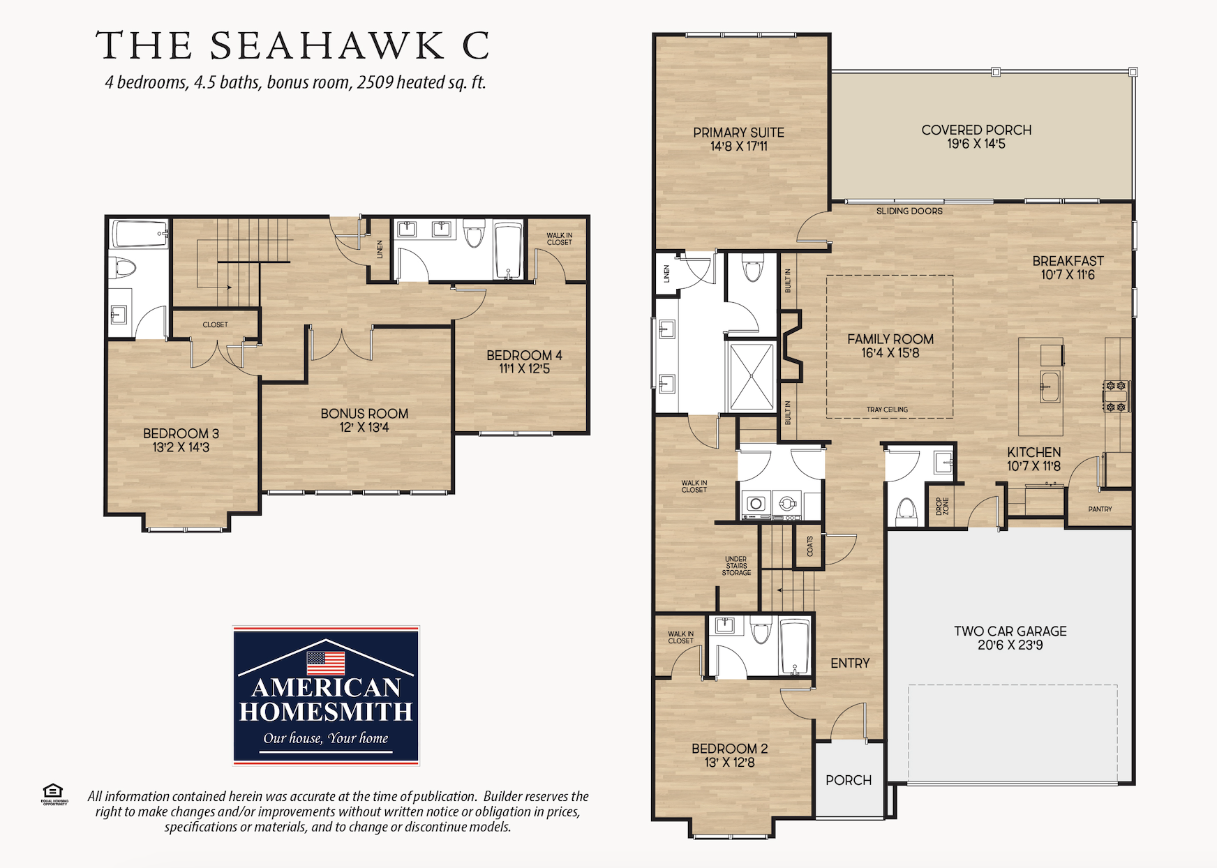 The Seahawk offers a perfect blend of style, comfort, and functionality with 4 bedrooms, 4.5 baths, and 2,509 heated sq. ft. of thoughtfully designed living space. The inviting front porch leads into an open-concept layout, where the spacious family room flows seamlessly into the kitchen and breakfast area. A large center island, walk-in pantry, and easy access to the covered back porch make this kitchen ideal for entertaining.