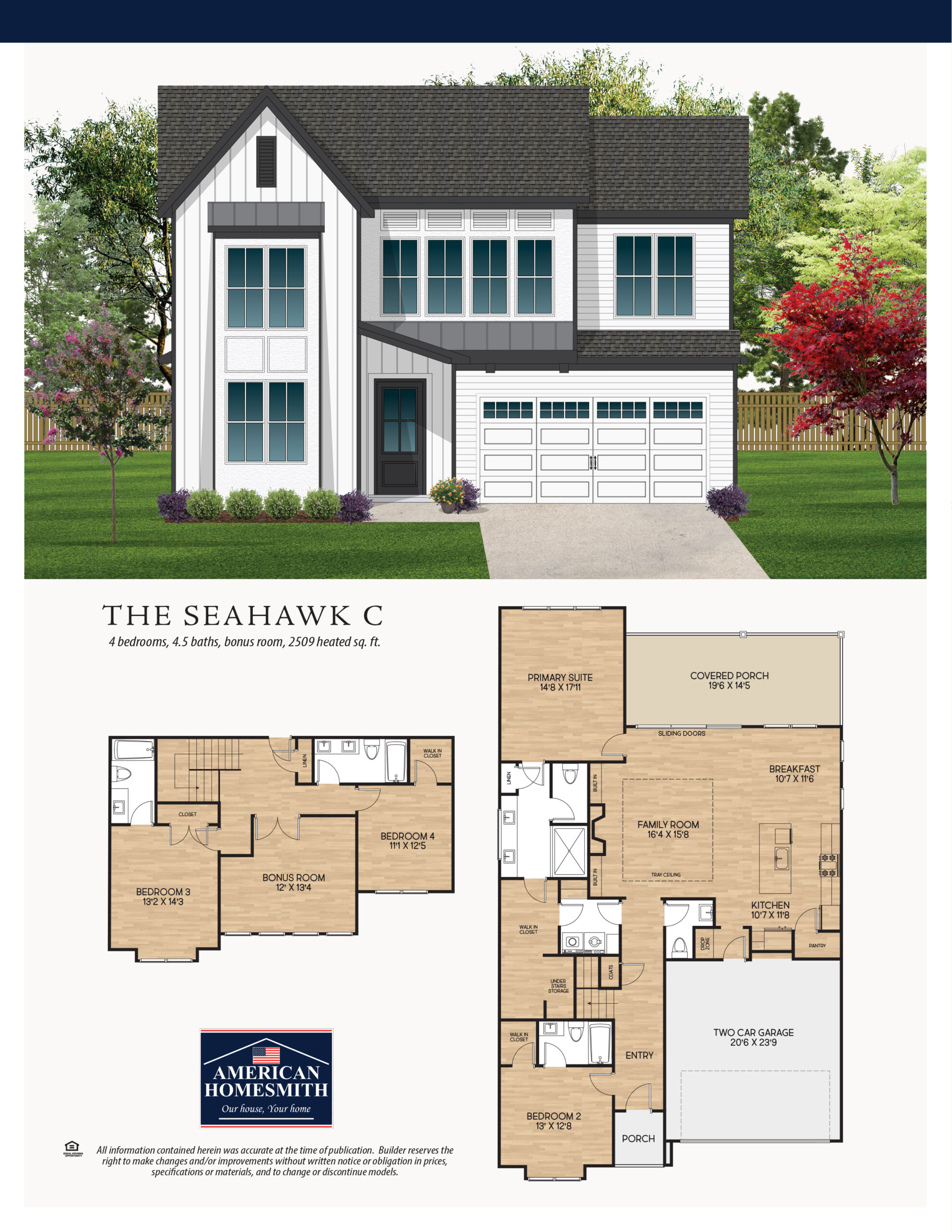 Additional highlights include a two-car garage, a convenient powder room, and abundant storage throughout. Designed for modern living, The Seahawk combines timeless curb appeal with the quality craftsmanship you expect from American Homesmith—nestled within the desirable Magnolia Reserve community.