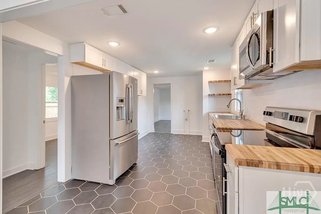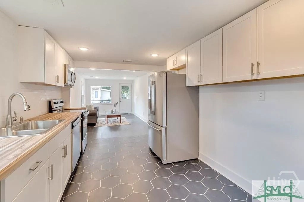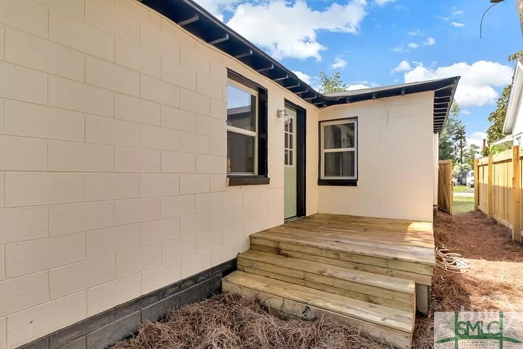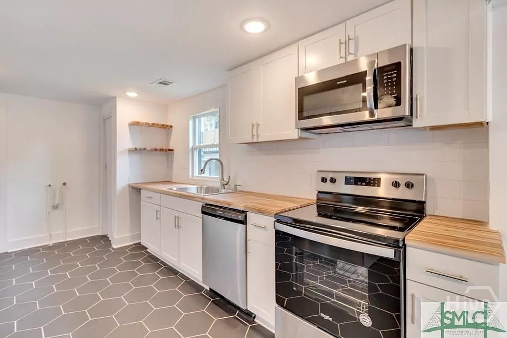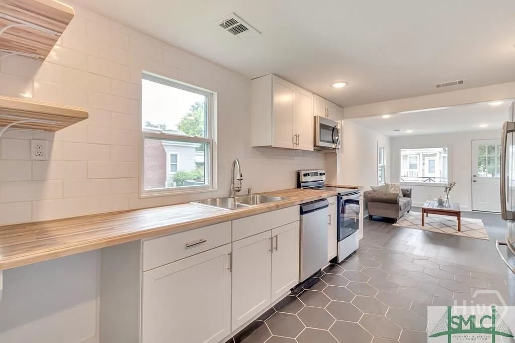 NEWLY REDUCED PRICE! Beautifully restored bungalow, with off street parking, windows, and luxury vinyl plank flooring throughout. Updated kitchen with butcher block countertops, new cabinets, tile backsplash, and new stainless appliances. There are 3 spacious bedrooms and updated full bath with trendy tile in the tub/shower. The front porch will provide the perfect place to sit and enjoy the evening air or a morning cup of coffee. Private fenced backyard and new deck. Great neighborhood and area of active renovation. Great location, 5 min from historic downtown Savannah and SCAD, and close to the area beaches! Schedule your showing today!