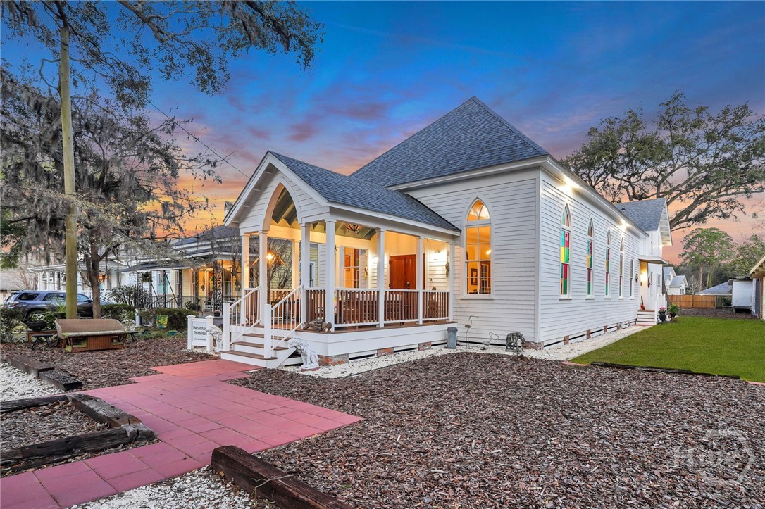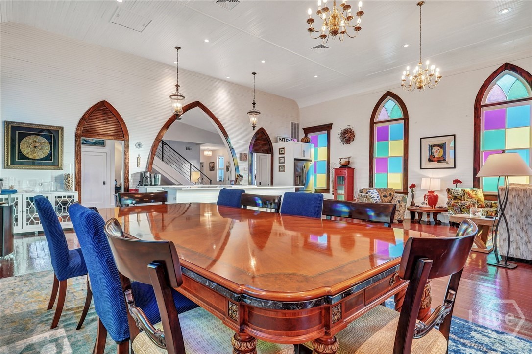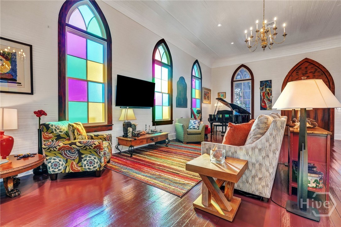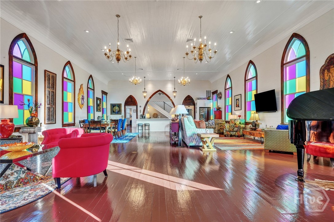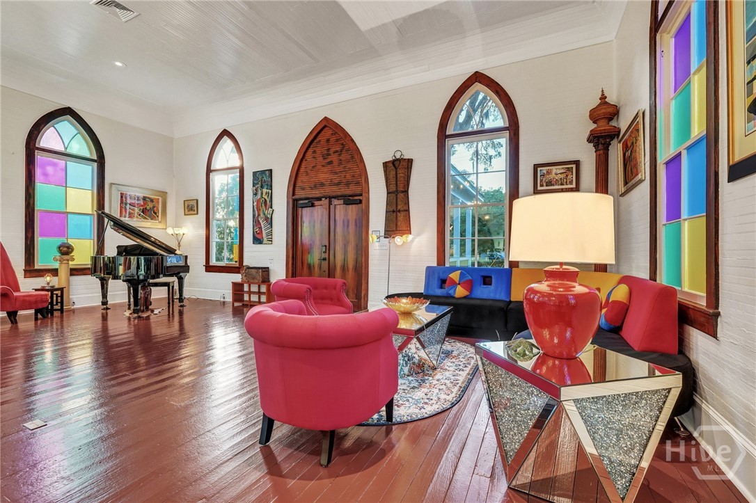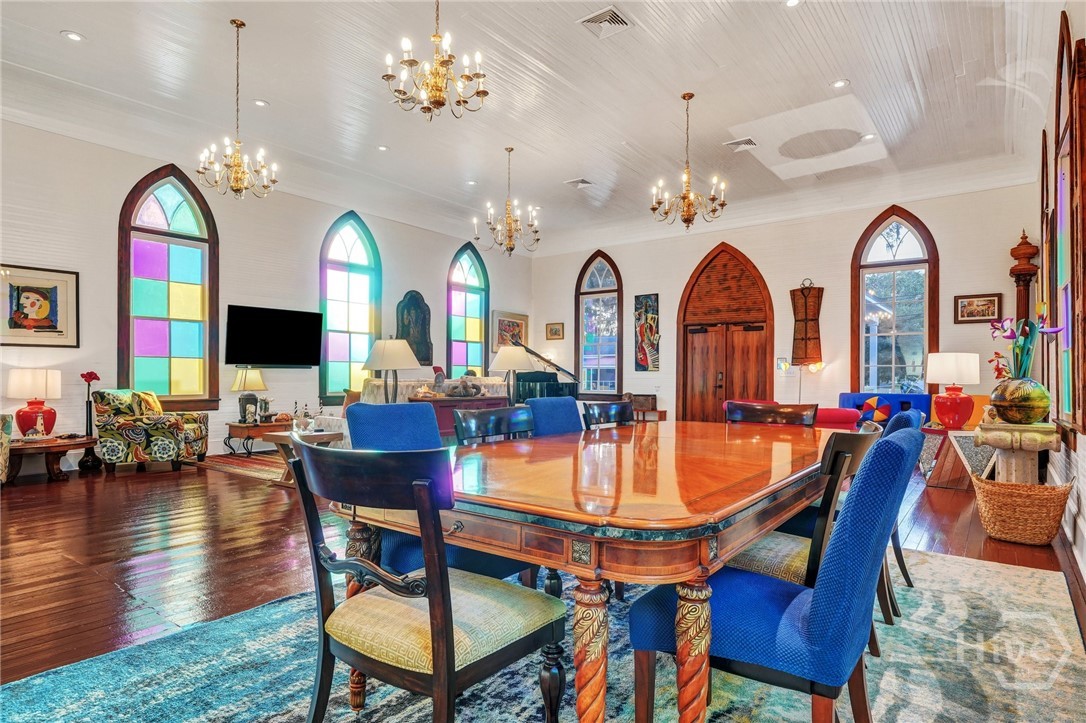 A rare gem, this historic 1902 church has been exquisitely transformed into a stunning architectural masterpiece. Once a modest clapboard Southern-style church, it now stands as a breathtaking 4-bedroom luxury residence. This award-winning restoration masterfully preserves the church’s original charm, including its soaring stained-glass windows, while seamlessly incorporating a sleek, contemporary addition. The expansive open-concept living area is bathed in colorful light, with a state-of-the-art chef’s kitchen at its center, featuring an innovative pass-through design with seating on both sides. The modern wing offers a serene retreat with a den, two downstairs bedroom suites, and two upstairs suites, each with spa-like baths. Outside, a sprawling private backyard with a majestic ancient oak creates an idyllic setting for entertaining. Nestled in Thunderbolt, a walkable riverfront community, this heavenly haven offers the perfect blend of historic elegance and modern luxury.