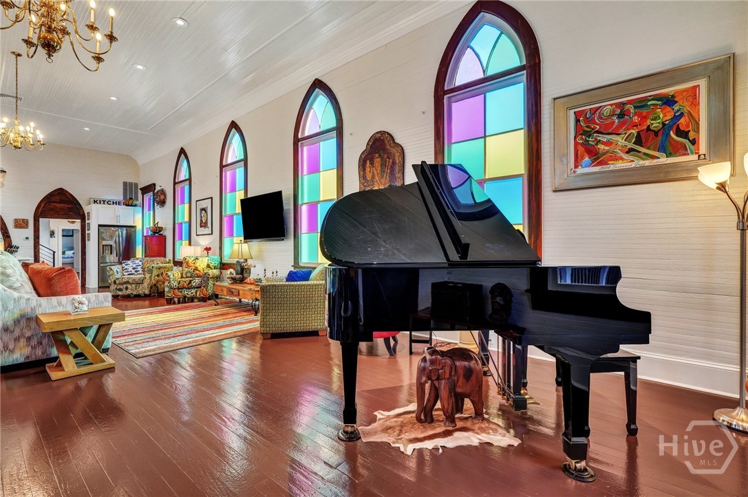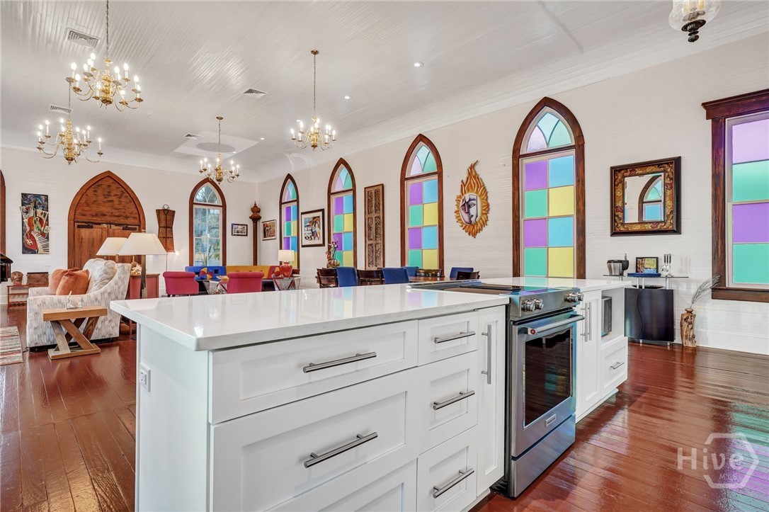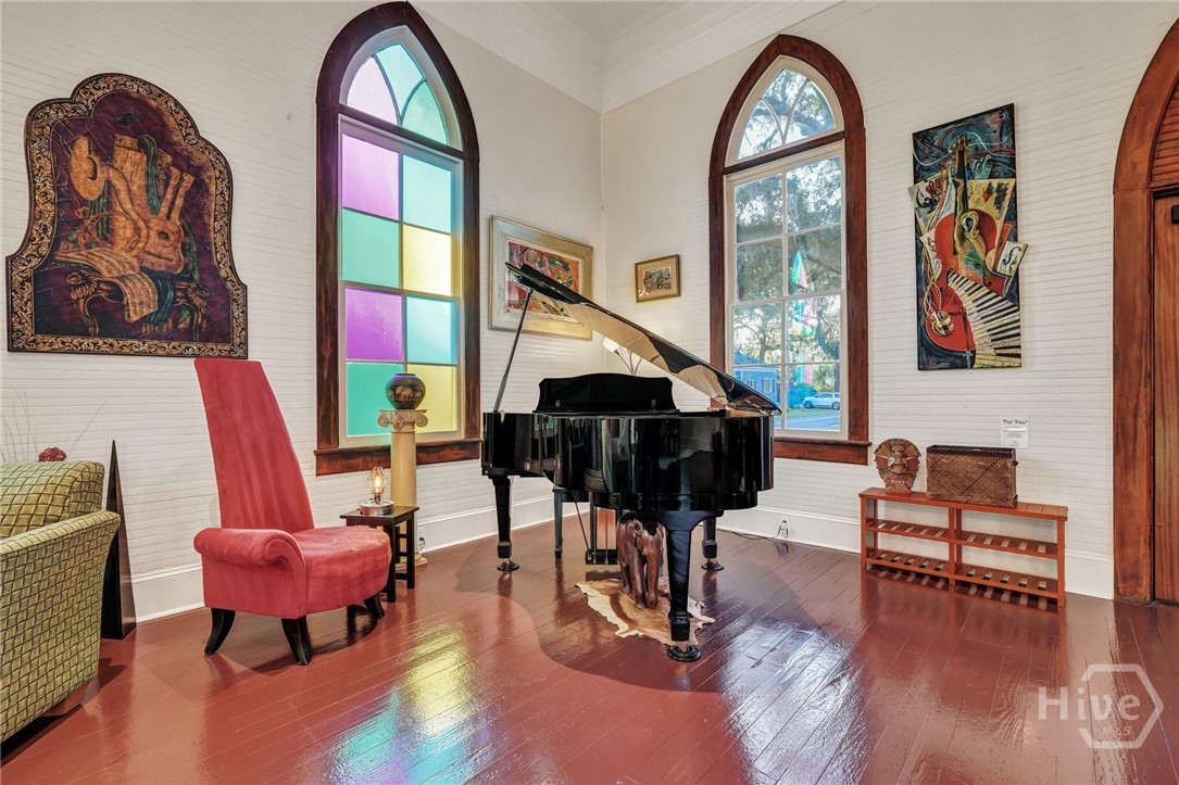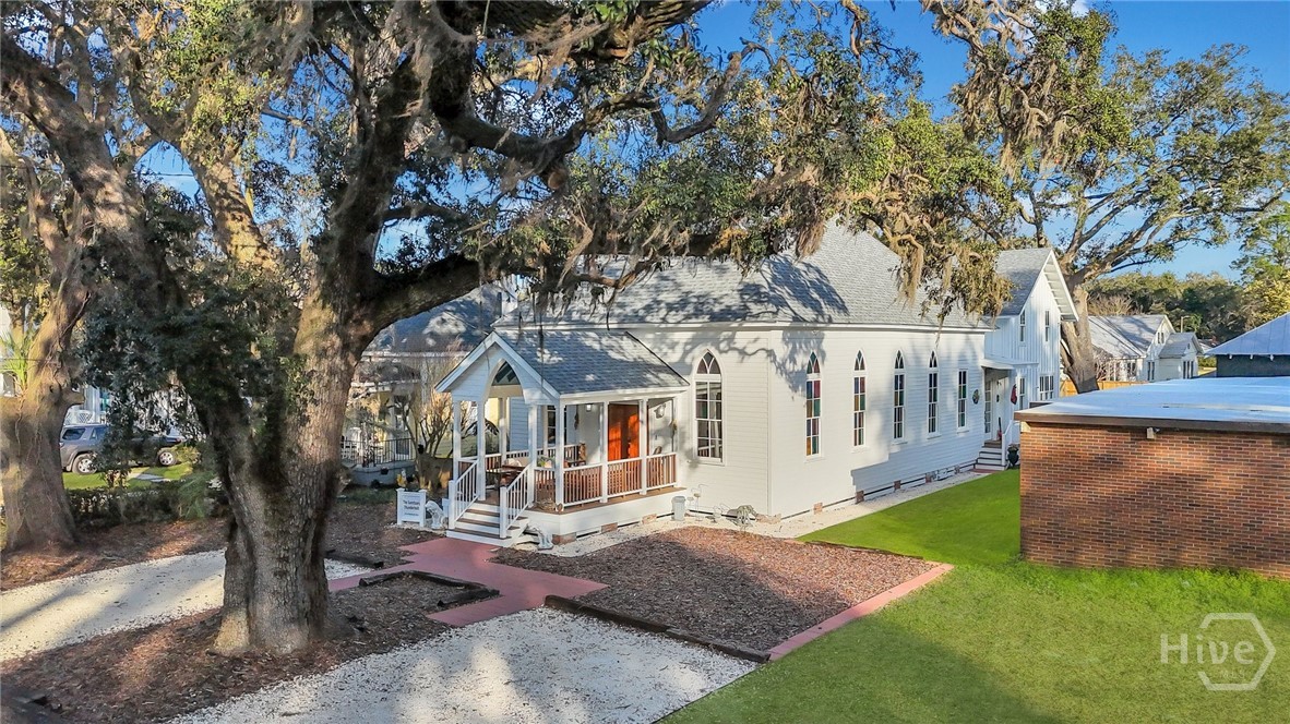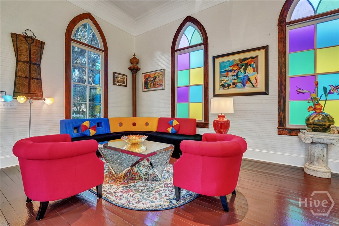 A rare gem, this historic 1902 church has been exquisitely transformed into a stunning architectural masterpiece. Once a modest clapboard Southern-style church, it now stands as a breathtaking 4-bedroom luxury residence. This award-winning restoration masterfully preserves the church’s original charm, including its soaring stained-glass windows, while seamlessly incorporating a sleek, contemporary addition. The expansive open-concept living area is bathed in colorful light, with a state-of-the-art chef’s kitchen at its center, featuring an innovative pass-through design with seating on both sides. The modern wing offers a serene retreat with a den, two downstairs bedroom suites, and two upstairs suites, each with spa-like baths. Outside, a sprawling private backyard with a majestic ancient oak creates an idyllic setting for entertaining. Nestled in Thunderbolt, a walkable riverfront community, this heavenly haven offers the perfect blend of historic elegance and modern luxury.