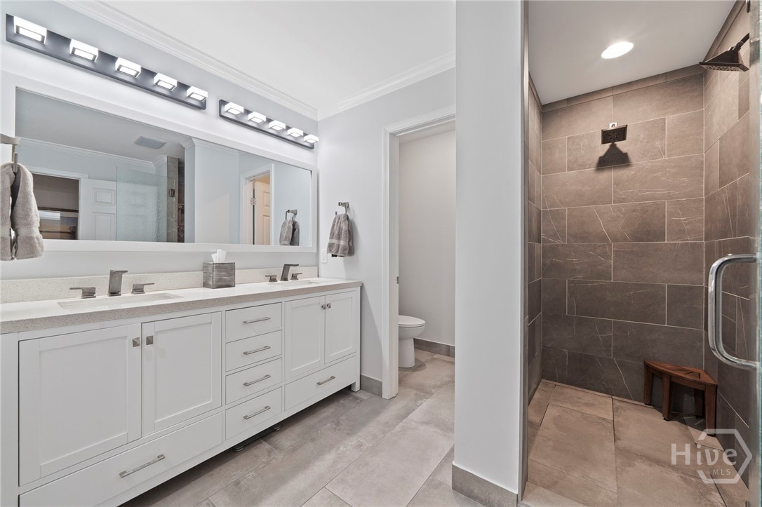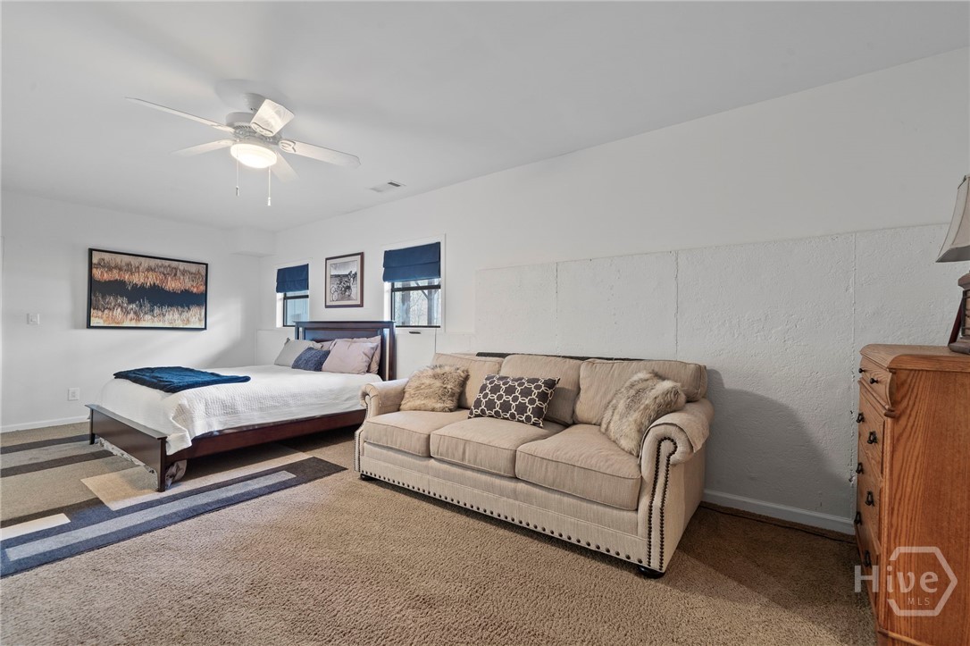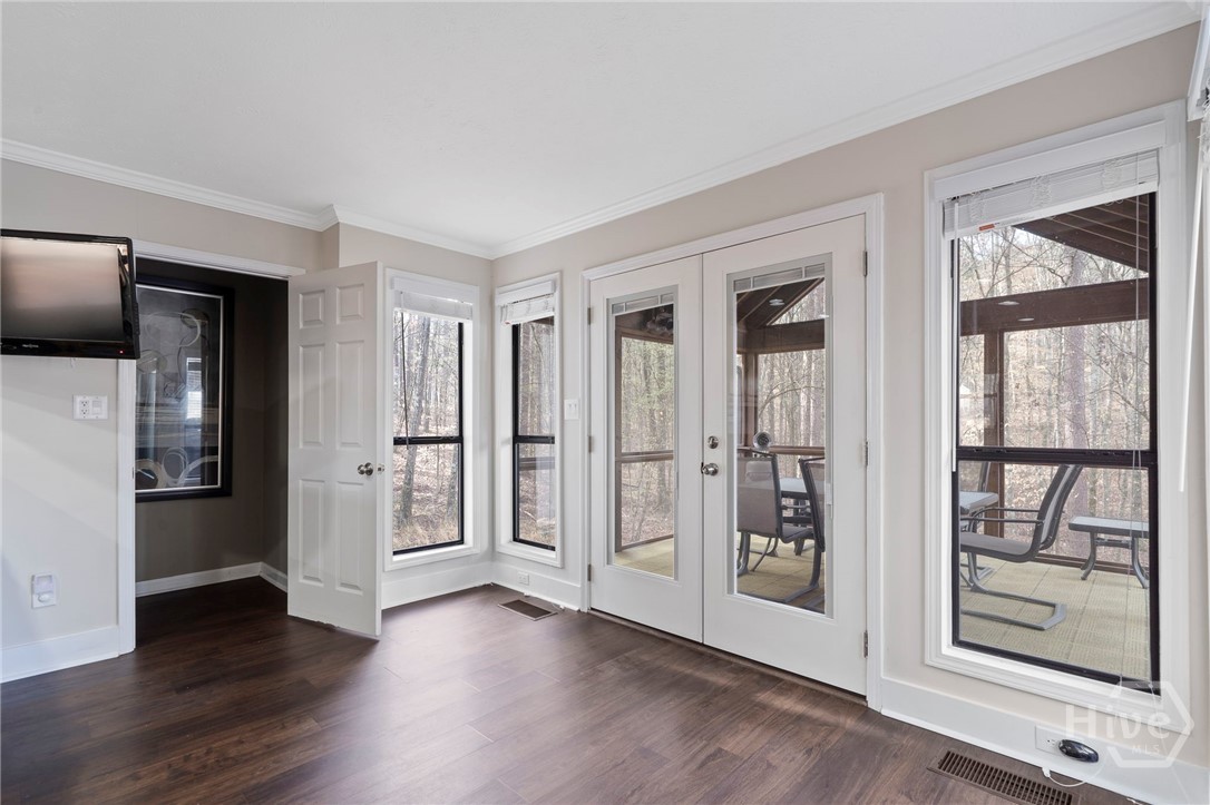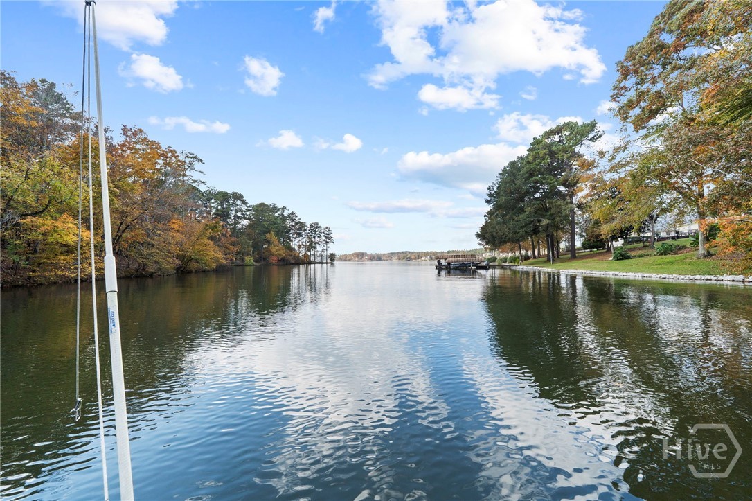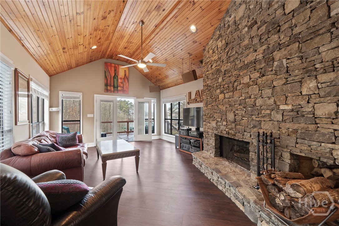 Ranch-style 5 BR, 3.5 BA on Long Shoals cove with Georgia Power buffer for privacy. Open plan with stacked-stone fireplace, updated kitchen, renovated baths, and whole-home audio (62 speakers). Full-length deck + screened porch for sunset dining. Terrace level offers theater, game room, wet bar, patio to dock. 2-car attached + RV garage fits wake boat. Near Long Shoals Boat Ramp and Crooked Creek Marina.
