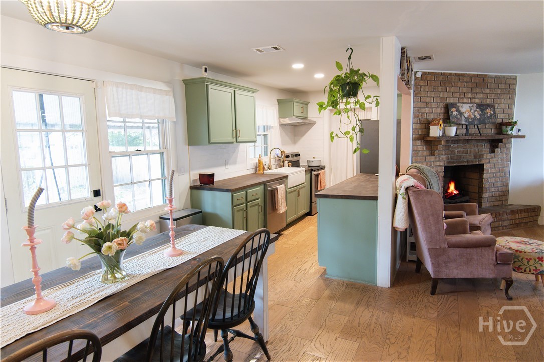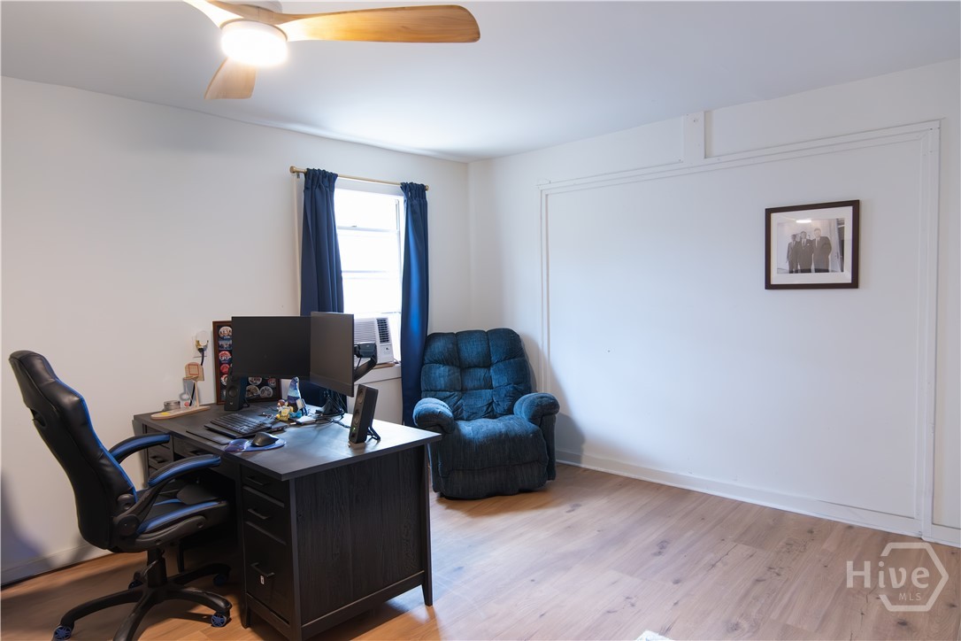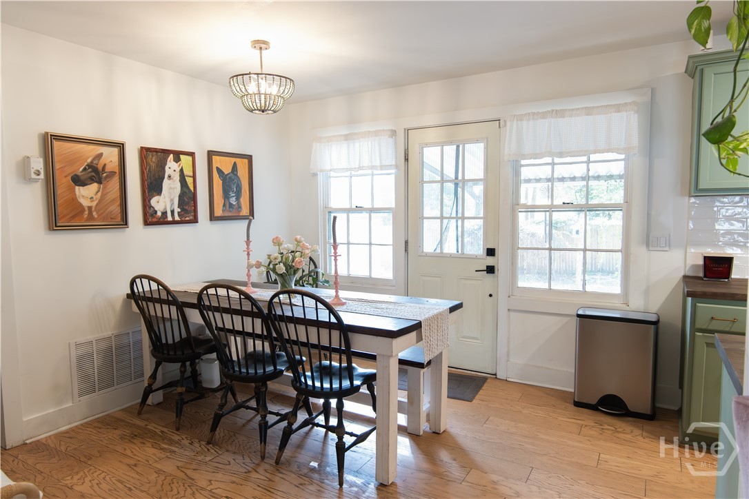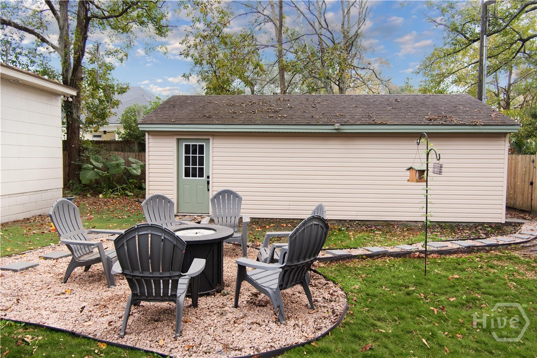 Renovated just two years ago, this thoughtfully updated 3 bedroom, 2 bath property blends classic charm with modern comfort. The main home features 2 bedrooms and beautifully refreshed living spaces, while the converted garage offers a private guest suite with its own bedroom and office area, rear alley access, and room to add a kitchen and bath—ideal for extended guests or future rental income. Inside, the living room centers around a warm brick fireplace, creating an inviting focal point. The kitchen showcases custom cabinetry, detailed trim work, upgraded doors and hardware, modern lighting, updated appliances, and a farmhouse sink. Both bathrooms were renovated with updated tile, vanities, lighting, toilets, and custom glass finishes. Mechanical upgrades completed two years ago include HVAC, ductwork, and a tankless water heater. The fenced backyard offers a peaceful retreat with mature oaks and a thriving muscadine vine. Minutes from Bonaventure Cemetery and Victory Heights Park.