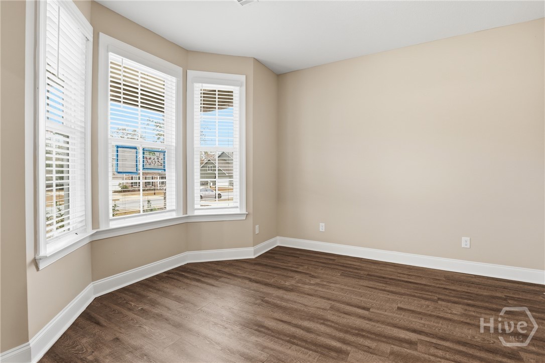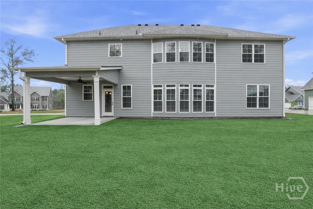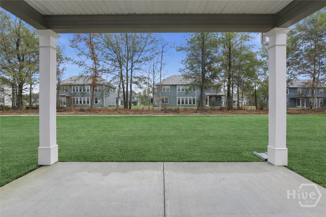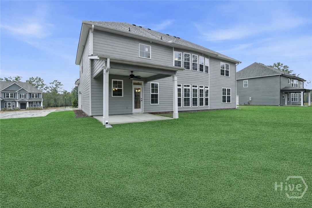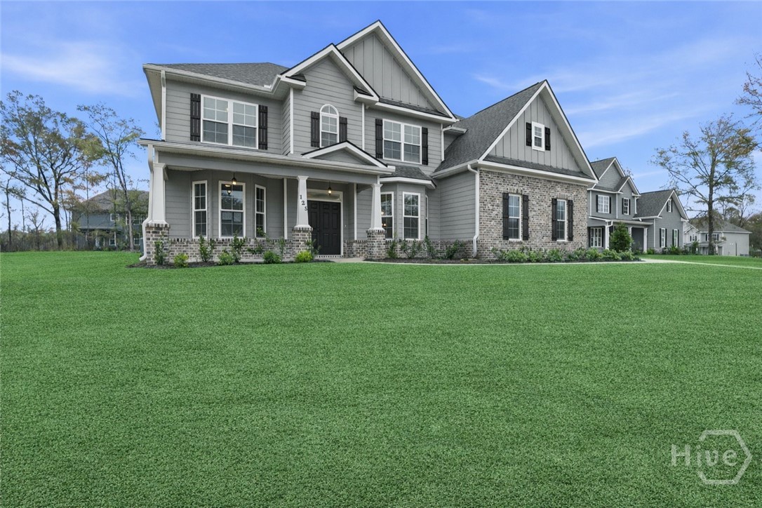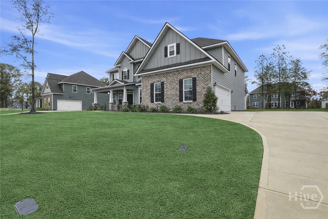 This exceptional new construction home, located in Guyton, features one of the most highly sought after floor plans, offering elegance and functionality throughout. A covered front porch welcomes you into a grand foyer that immediately sets the tone. To the left, the formal dining room showcases coffered ceilings and a charming bay window, while to the right, a private office with French doors and its own bay window creates an ideal work from home space. The thoughtfully placed staircase leads into a stunning living room filled with natural light from a wall of rear windows. A tray ceiling and fireplace anchor the space, while architectural columns define the living room, breakfast area, and kitchen without sacrificing the open feel. Designed for gathering, the kitchen features an island with bar seating, granite countertops, double ovens, a cooktop, walk in pantry, and a built in desk nook. A main level guest or in law suite with an adjoining full bathroom offers comfort and flexibility, with convenient access from the main living area. Upstairs, you will find four bedrooms total, including the expansive primary suite featuring a tray ceiling, fireplace, sitting area, and a spa like ensuite with dual vanities, garden tub, walk in shower, and walk in closet. Two additional bedrooms share a full bathroom, while the fourth upstairs bedroom includes its own private bathroom, making it ideal for guests or teens. A spacious bonus room completes the upper level, offering endless possibilities for a media room, playroom, or additional living space. The home includes fresh sod in both the front and back yards and is finished with a covered back patio, delivering space, elegance, and thoughtful design at every turn.