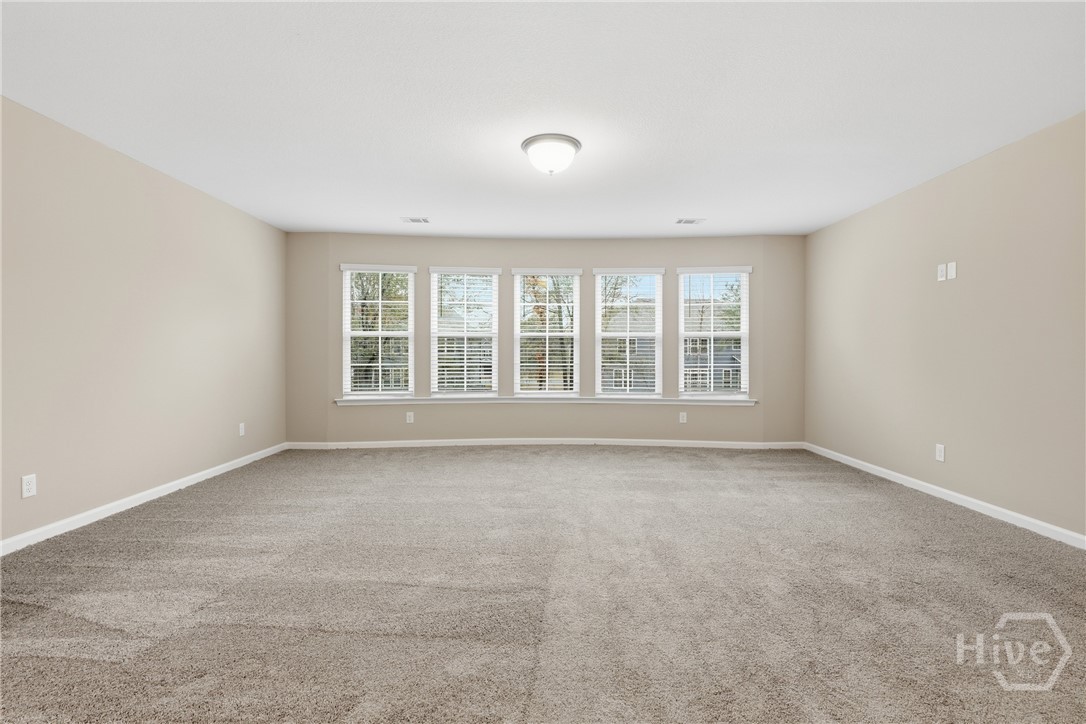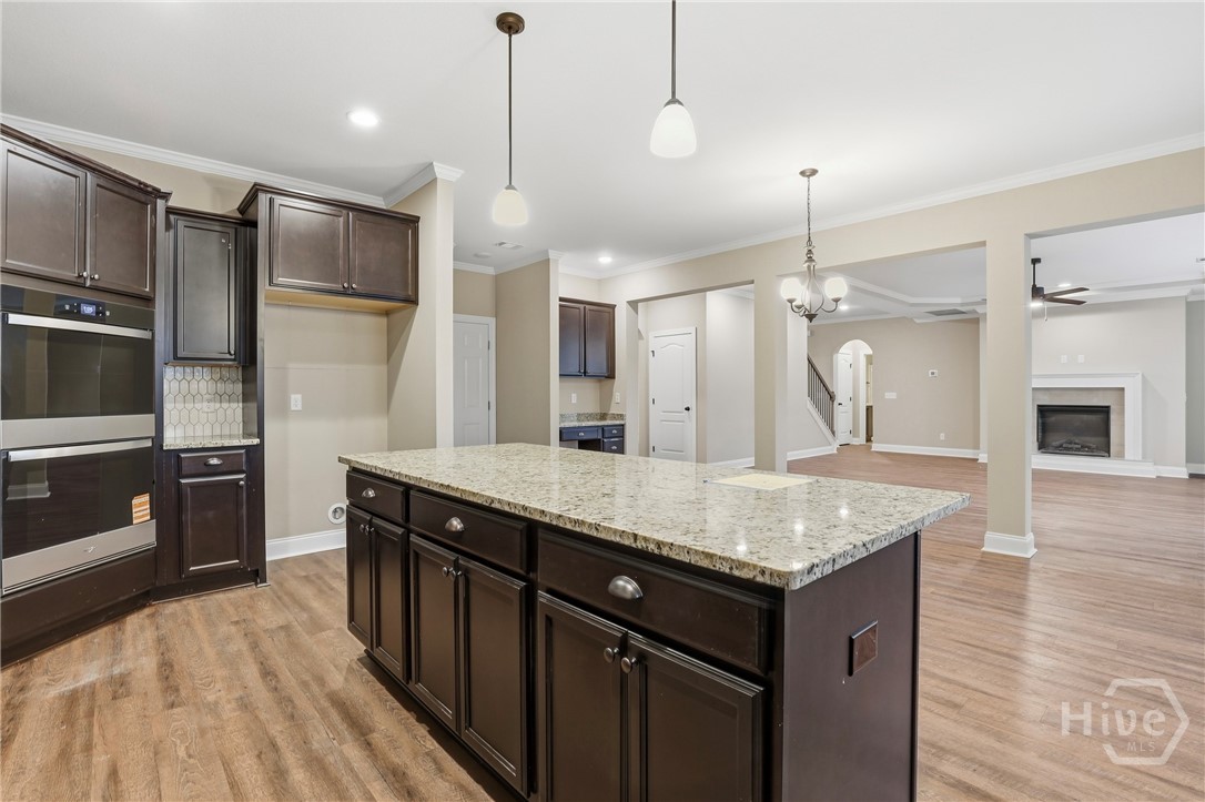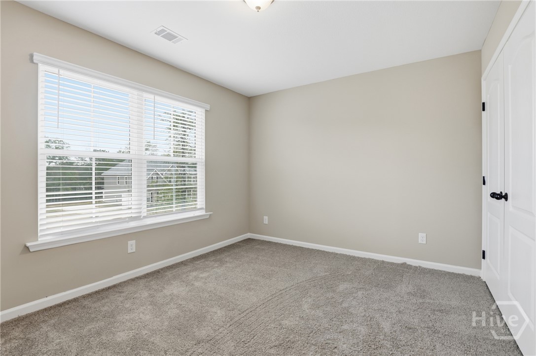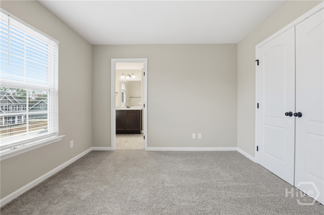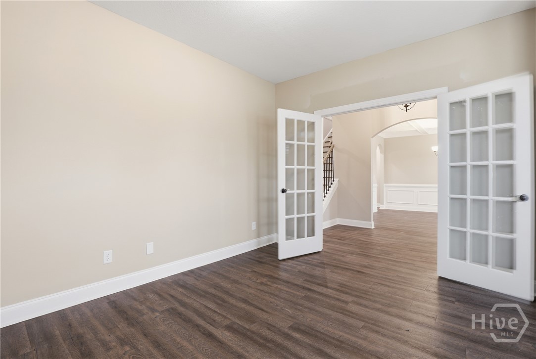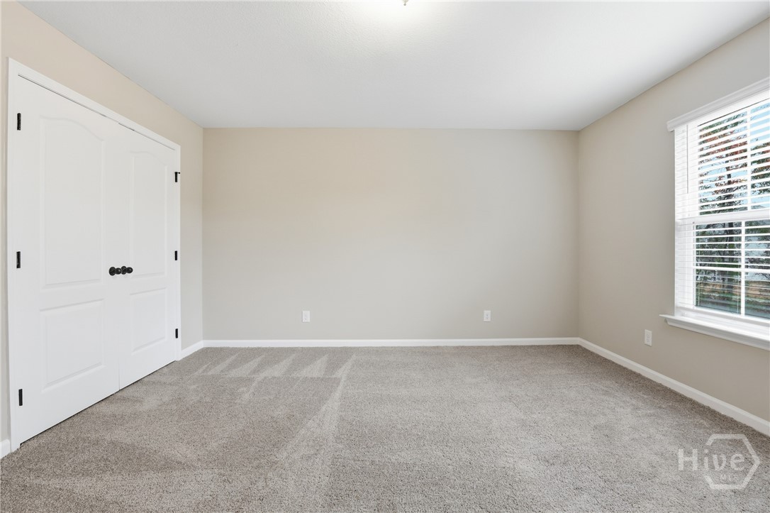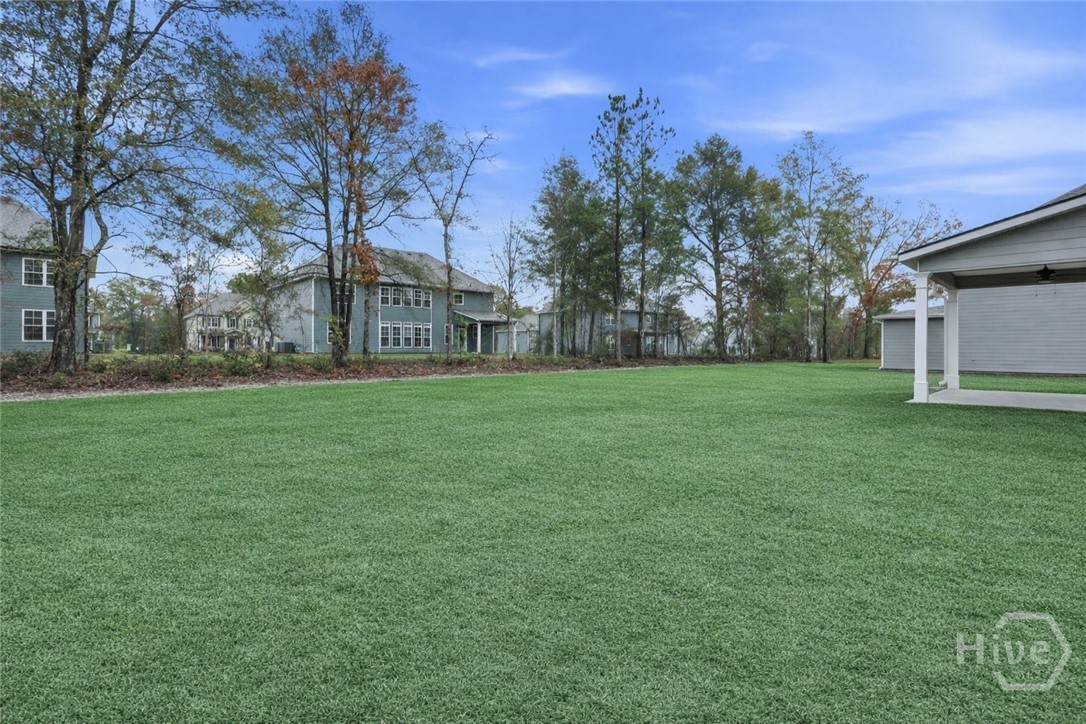 This exceptional new construction home, located in Guyton, features one of the most highly sought after floor plans, offering elegance and functionality throughout. A covered front porch welcomes you into a grand foyer that immediately sets the tone. To the left, the formal dining room showcases coffered ceilings and a charming bay window, while to the right, a private office with French doors and its own bay window creates an ideal work from home space. The thoughtfully placed staircase leads into a stunning living room filled with natural light from a wall of rear windows. A tray ceiling and fireplace anchor the space, while architectural columns define the living room, breakfast area, and kitchen without sacrificing the open feel. Designed for gathering, the kitchen features an island with bar seating, granite countertops, double ovens, a cooktop, walk in pantry, and a built in desk nook. A main level guest or in law suite with an adjoining full bathroom offers comfort and flexibility, with convenient access from the main living area. Upstairs, you will find four bedrooms total, including the expansive primary suite featuring a tray ceiling, fireplace, sitting area, and a spa like ensuite with dual vanities, garden tub, walk in shower, and walk in closet. Two additional bedrooms share a full bathroom, while the fourth upstairs bedroom includes its own private bathroom, making it ideal for guests or teens. A spacious bonus room completes the upper level, offering endless possibilities for a media room, playroom, or additional living space. The home includes fresh sod in both the front and back yards and is finished with a covered back patio, delivering space, elegance, and thoughtful design at every turn.