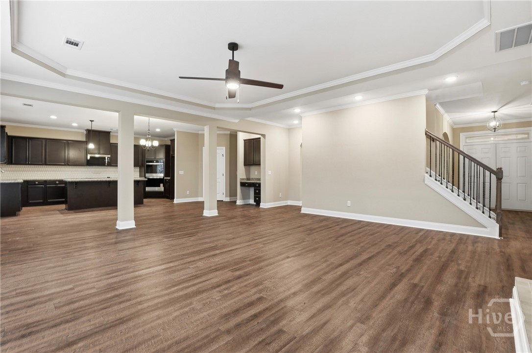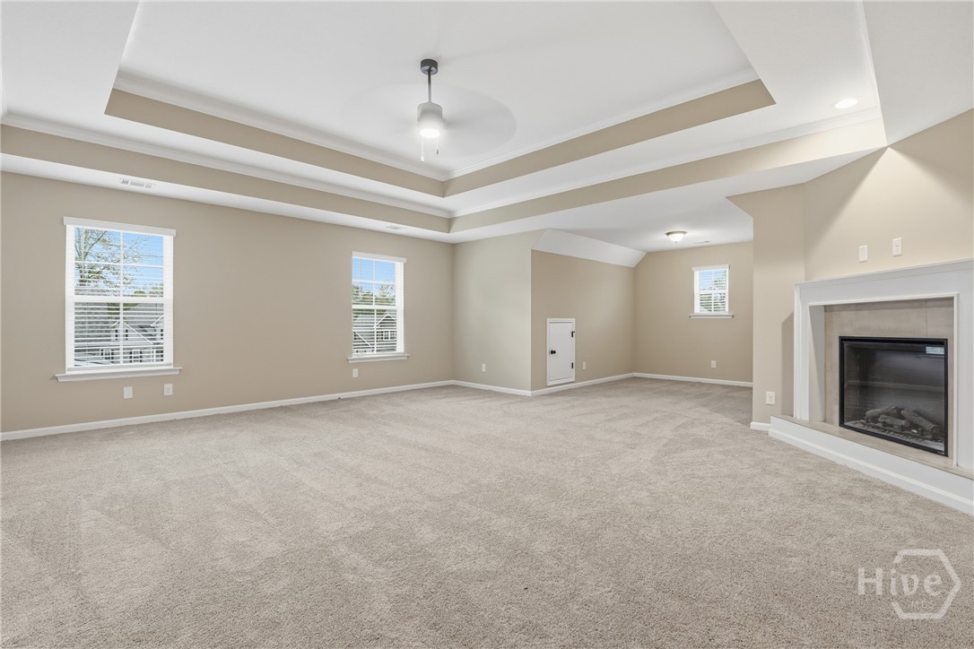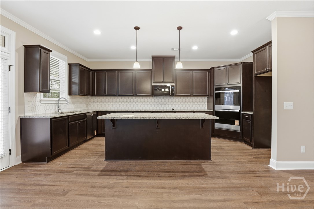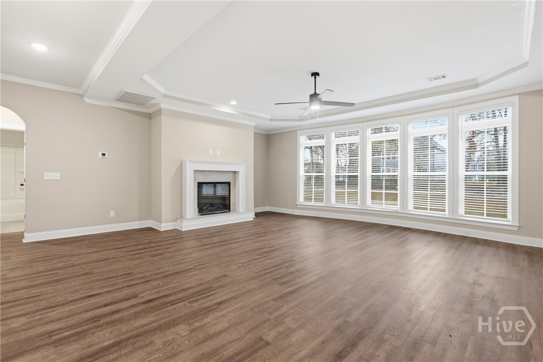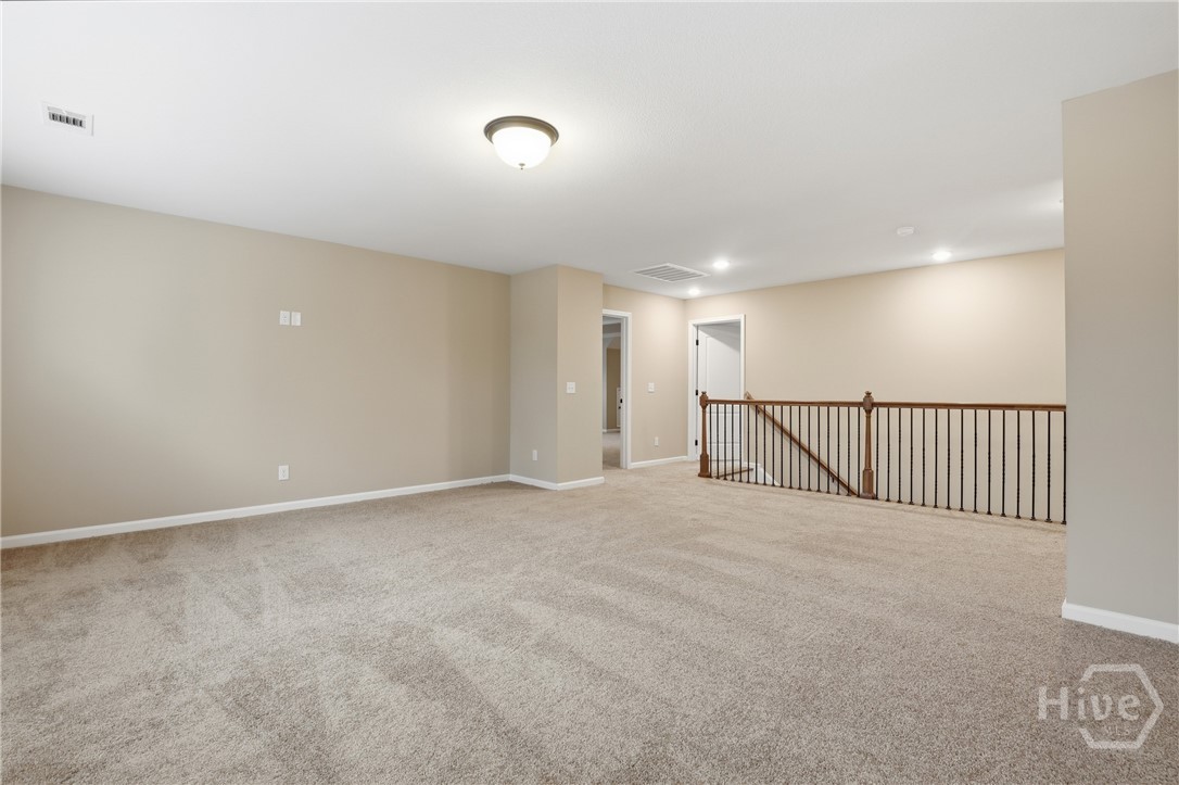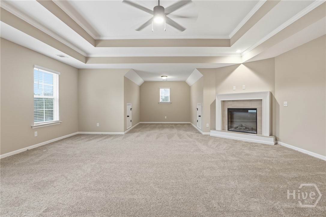 This exceptional new construction home, located in Guyton, features one of the most highly sought after floor plans, offering elegance and functionality throughout. A covered front porch welcomes you into a grand foyer that immediately sets the tone. To the left, the formal dining room showcases coffered ceilings and a charming bay window, while to the right, a private office with French doors and its own bay window creates an ideal work from home space. The thoughtfully placed staircase leads into a stunning living room filled with natural light from a wall of rear windows. A tray ceiling and fireplace anchor the space, while architectural columns define the living room, breakfast area, and kitchen without sacrificing the open feel. Designed for gathering, the kitchen features an island with bar seating, granite countertops, double ovens, a cooktop, walk in pantry, and a built in desk nook. A main level guest or in law suite with an adjoining full bathroom offers comfort and flexibility, with convenient access from the main living area. Upstairs, you will find four bedrooms total, including the expansive primary suite featuring a tray ceiling, fireplace, sitting area, and a spa like ensuite with dual vanities, garden tub, walk in shower, and walk in closet. Two additional bedrooms share a full bathroom, while the fourth upstairs bedroom includes its own private bathroom, making it ideal for guests or teens. A spacious bonus room completes the upper level, offering endless possibilities for a media room, playroom, or additional living space. The home includes fresh sod in both the front and back yards and is finished with a covered back patio, delivering space, elegance, and thoughtful design at every turn.