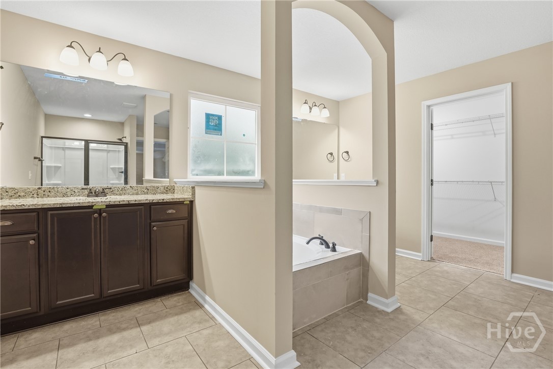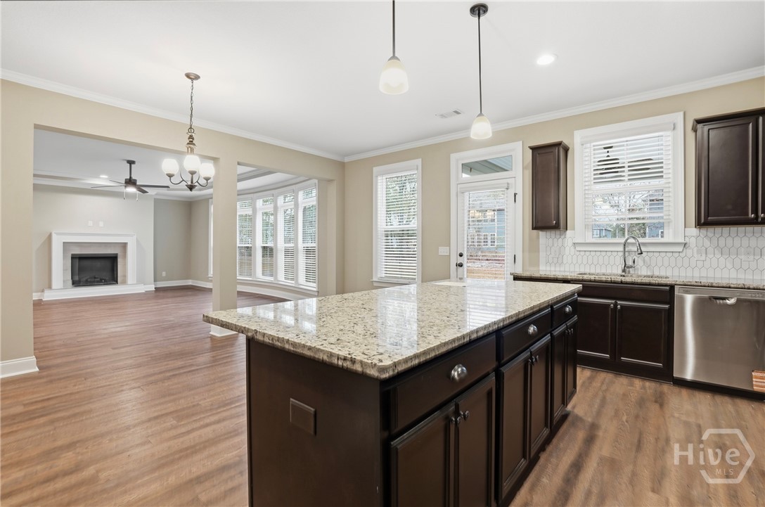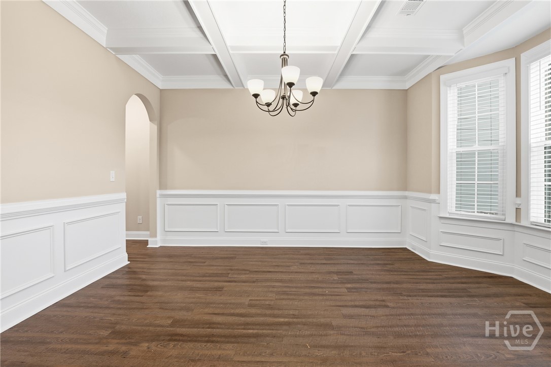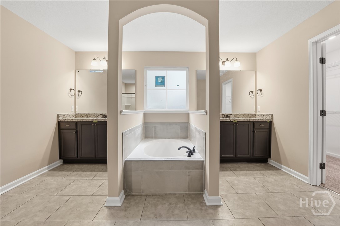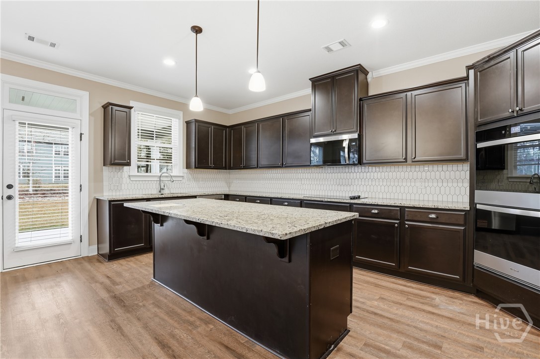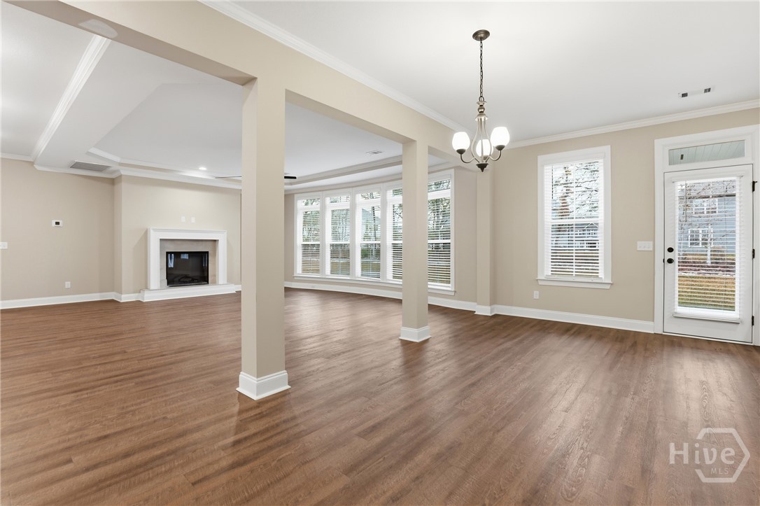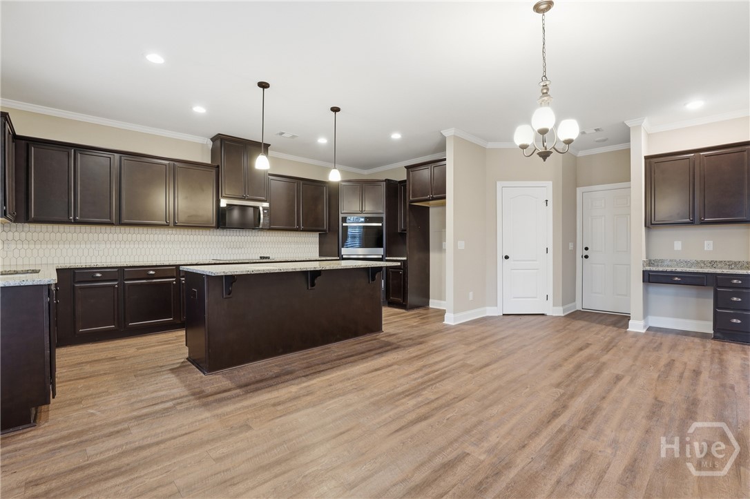 This exceptional new construction home, located in Guyton, features one of the most highly sought after floor plans, offering elegance and functionality throughout. A covered front porch welcomes you into a grand foyer that immediately sets the tone. To the left, the formal dining room showcases coffered ceilings and a charming bay window, while to the right, a private office with French doors and its own bay window creates an ideal work from home space. The thoughtfully placed staircase leads into a stunning living room filled with natural light from a wall of rear windows. A tray ceiling and fireplace anchor the space, while architectural columns define the living room, breakfast area, and kitchen without sacrificing the open feel. Designed for gathering, the kitchen features an island with bar seating, granite countertops, double ovens, a cooktop, walk in pantry, and a built in desk nook. A main level guest or in law suite with an adjoining full bathroom offers comfort and flexibility, with convenient access from the main living area. Upstairs, you will find four bedrooms total, including the expansive primary suite featuring a tray ceiling, fireplace, sitting area, and a spa like ensuite with dual vanities, garden tub, walk in shower, and walk in closet. Two additional bedrooms share a full bathroom, while the fourth upstairs bedroom includes its own private bathroom, making it ideal for guests or teens. A spacious bonus room completes the upper level, offering endless possibilities for a media room, playroom, or additional living space. The home includes fresh sod in both the front and back yards and is finished with a covered back patio, delivering space, elegance, and thoughtful design at every turn.