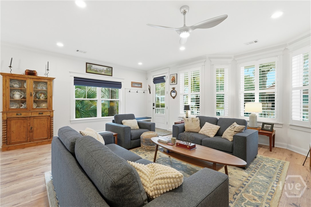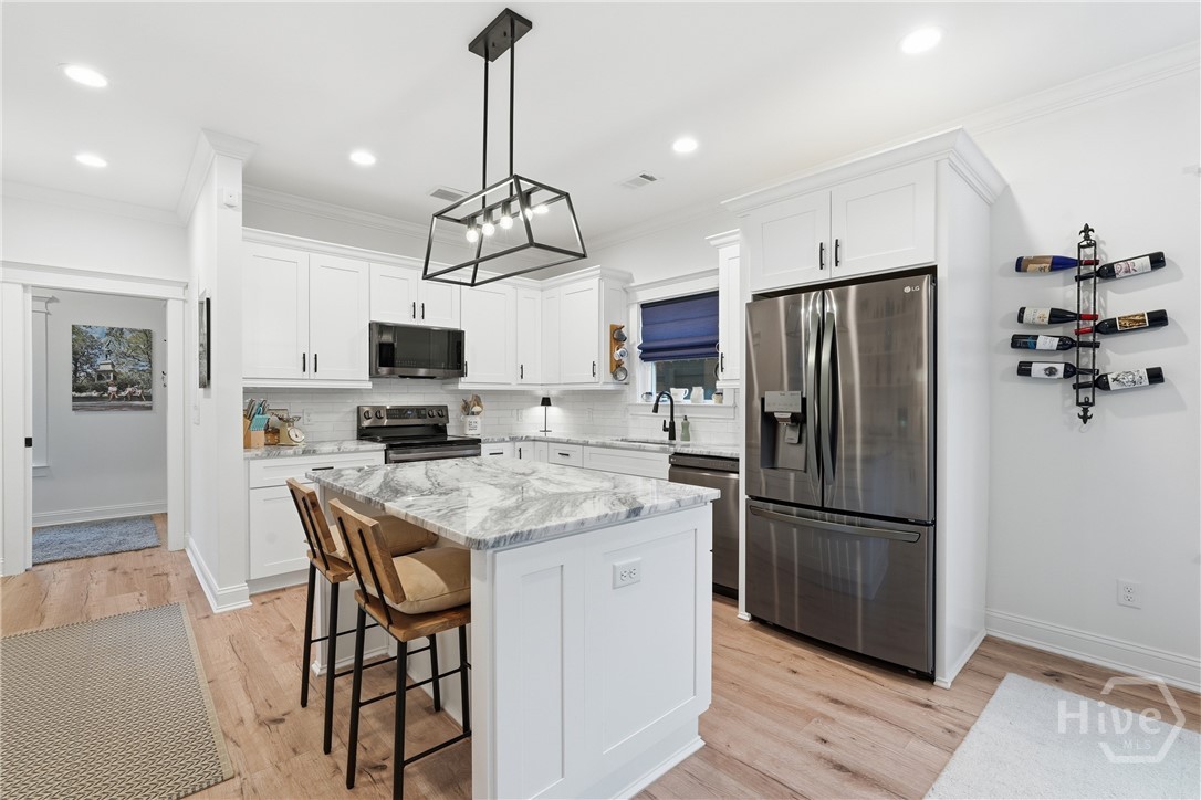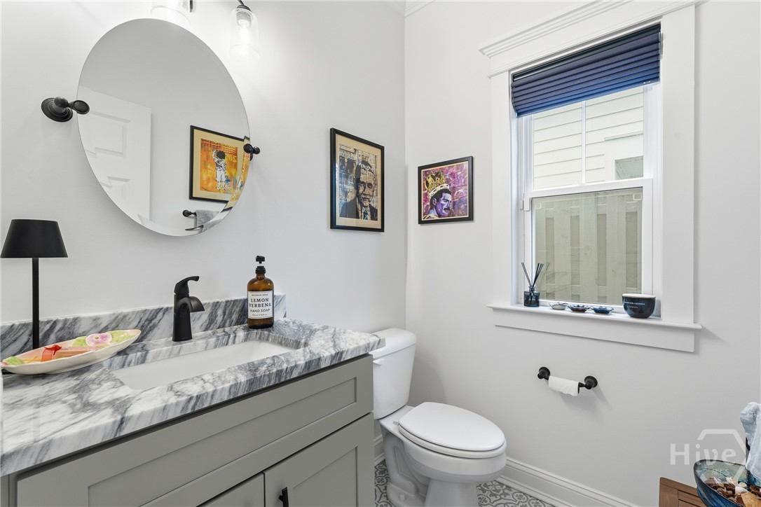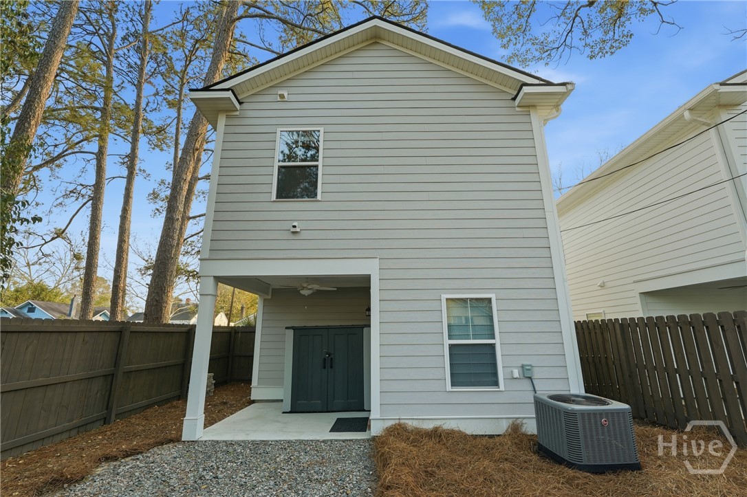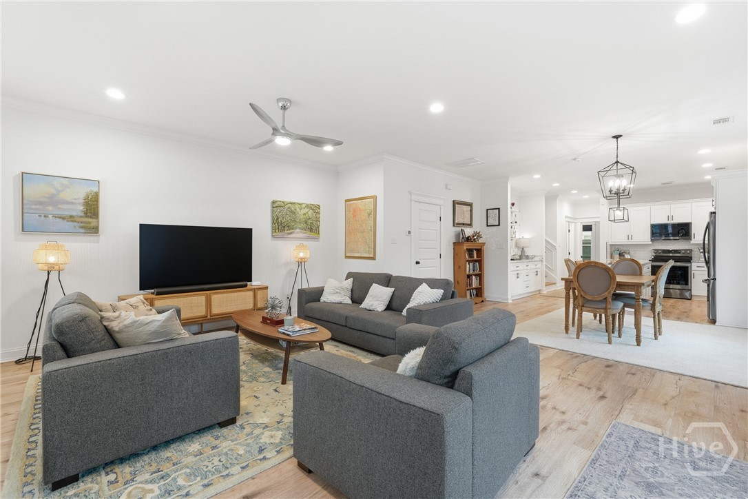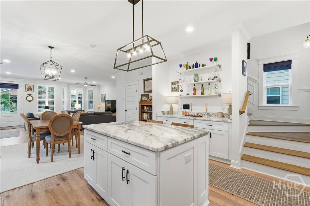 Better-than-new and barely lived in, this 3-bedroom, 2.5-bath home blends Victorian charm with modern comfort. A thoughtfully designed open layout offers tall ceilings, excellent natural light, and high end finishes throughout. The spacious great room flows into the dining area and a stunning island kitchen with stainless steel appliances, upgraded countertops, and abundant cabinetry—including a recessed bank of cabinets with open shelving, ideal for serving or a casual bar area. Fabulous layout offers excellent storage and functionality. A roomy guest bath, oversized walk-in pantry, keeping room, and a combined mudroom and laundry area complete the down stairs level. The primary suite includes access to a private balcony and a generous walk-in closet. The ensuite bath features dual vanities and a large custom tile shower with built-in seating. Guest bedrooms share a spacious bath with double vanities and a beautifully tiled tub/shower. Quality craftsmanship is evident throughout, with custom wood closets and built-ins, plantation shutters, recessed lighting, upgraded fixtures, and 10’+ ceilings. Outside, the privacy-fenced backyard includes a covered patio, alley access, and off-street parking. Rocking-chair porches on each floor overlook a charming, tree-lined street. Highly desirable location is central to everything —minutes from Forsyth Park, Daffin Park, the Starland District, and Downtown Savannah, with easy walking access to local favorites including The Laundry Diner, PERC, Cotton & Rye, Hop Atomica, and more.