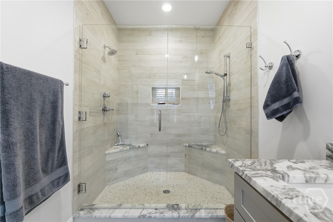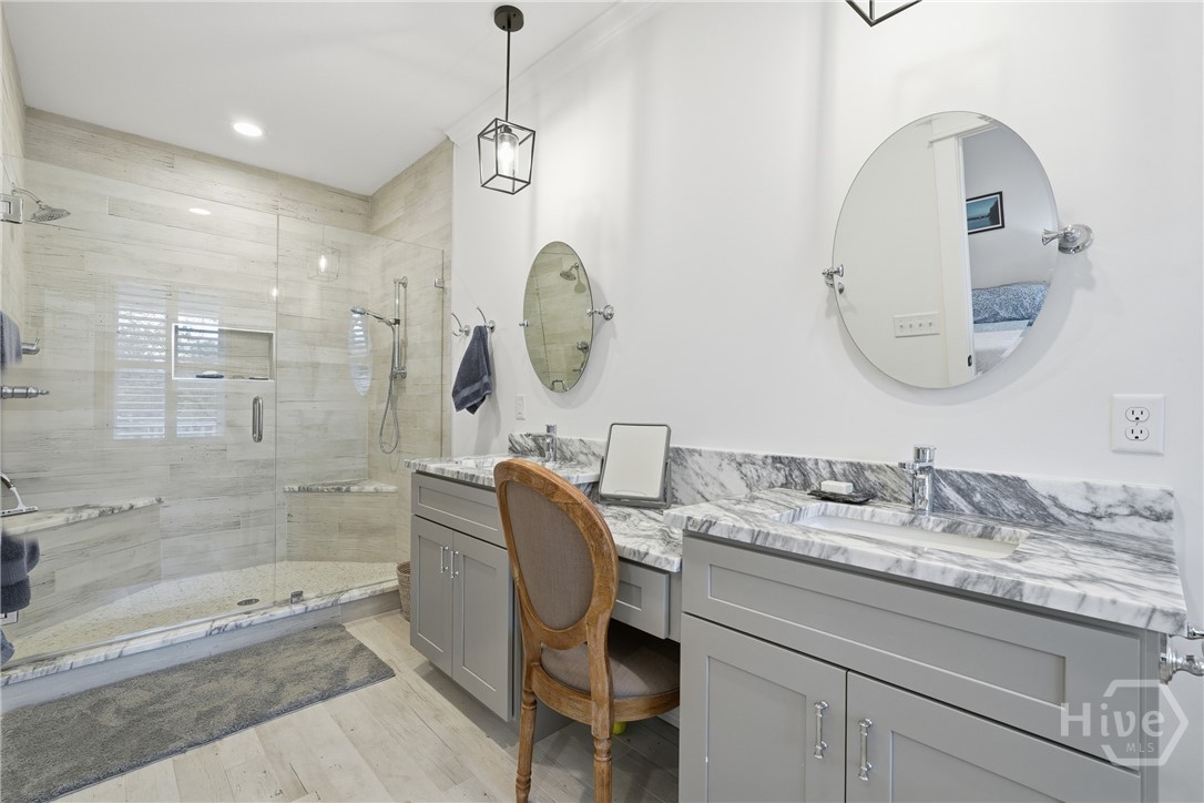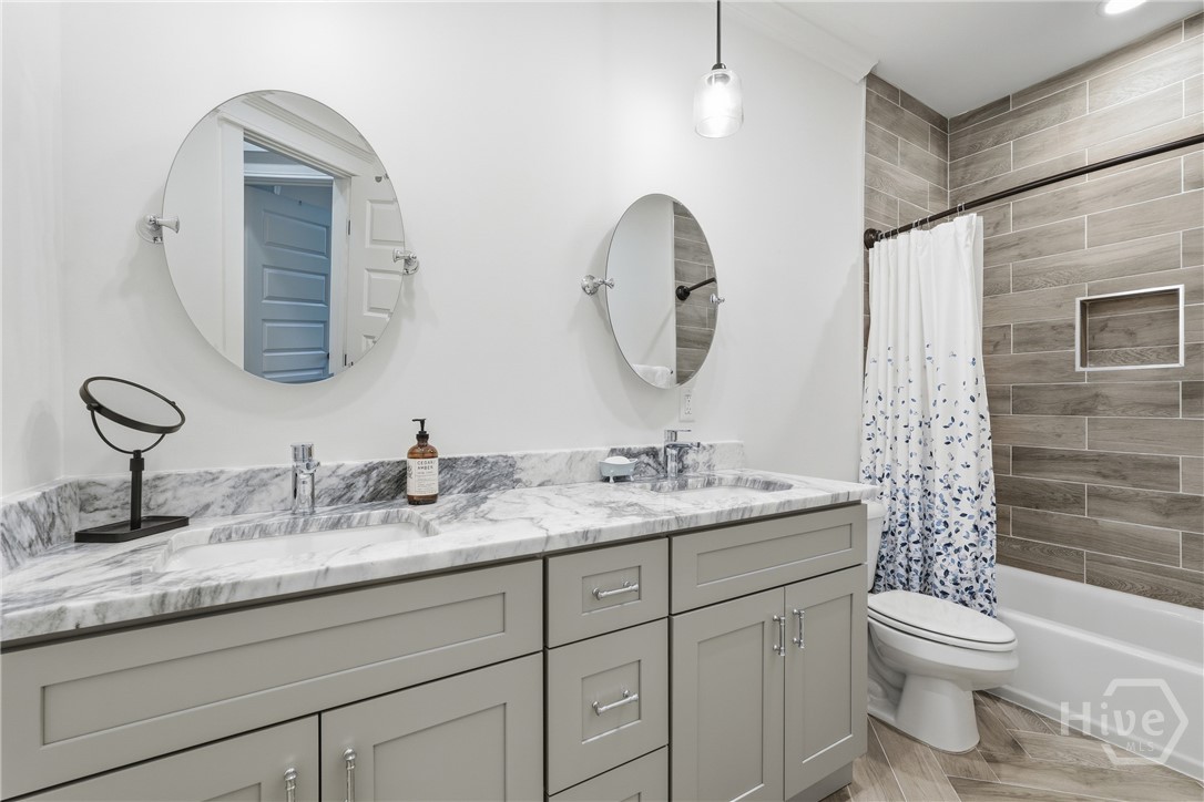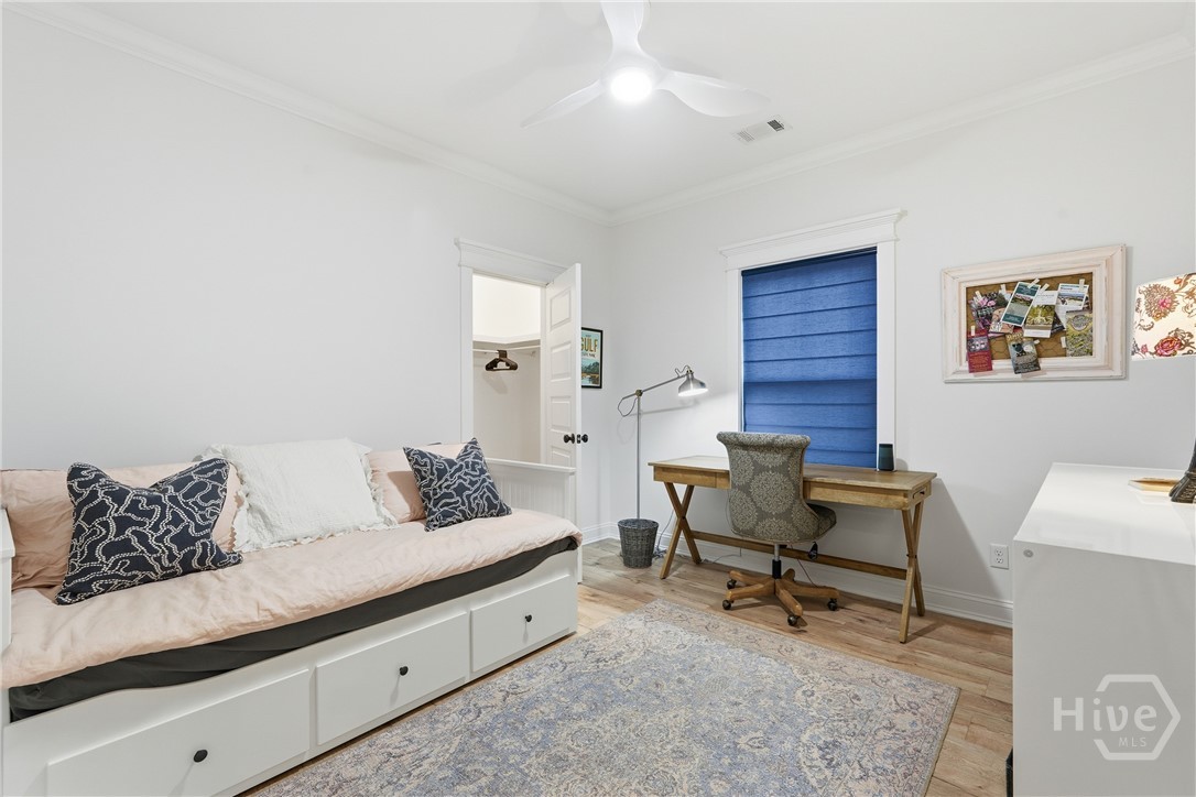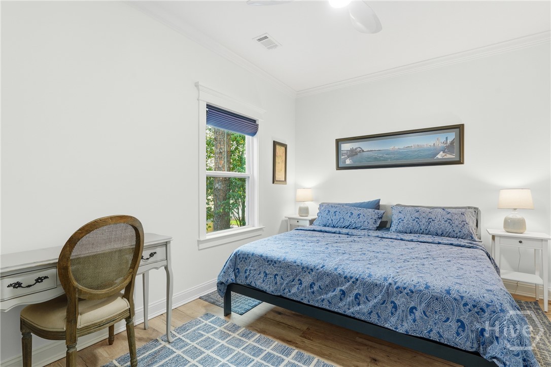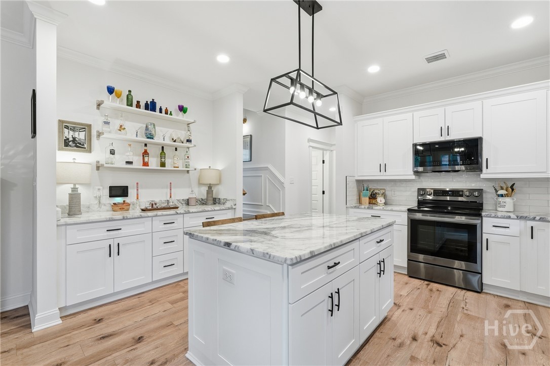 Better-than-new and barely lived in, this 3-bedroom, 2.5-bath home blends Victorian charm with modern comfort. A thoughtfully designed open layout offers tall ceilings, excellent natural light, and high end finishes throughout. The spacious great room flows into the dining area and a stunning island kitchen with stainless steel appliances, upgraded countertops, and abundant cabinetry—including a recessed bank of cabinets with open shelving, ideal for serving or a casual bar area. Fabulous layout offers excellent storage and functionality. A roomy guest bath, oversized walk-in pantry, keeping room, and a combined mudroom and laundry area complete the down stairs level. The primary suite includes access to a private balcony and a generous walk-in closet. The ensuite bath features dual vanities and a large custom tile shower with built-in seating. Guest bedrooms share a spacious bath with double vanities and a beautifully tiled tub/shower. Quality craftsmanship is evident throughout, with custom wood closets and built-ins, plantation shutters, recessed lighting, upgraded fixtures, and 10’+ ceilings. Outside, the privacy-fenced backyard includes a covered patio, alley access, and off-street parking. Rocking-chair porches on each floor overlook a charming, tree-lined street. Highly desirable location is central to everything —minutes from Forsyth Park, Daffin Park, the Starland District, and Downtown Savannah, with easy walking access to local favorites including The Laundry Diner, PERC, Cotton & Rye, Hop Atomica, and more.