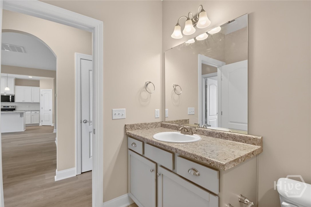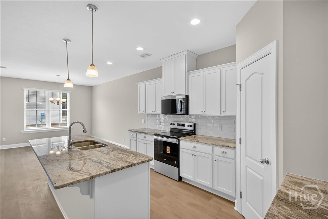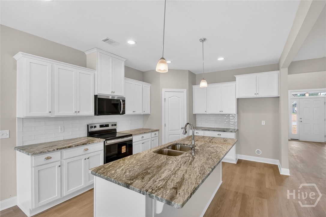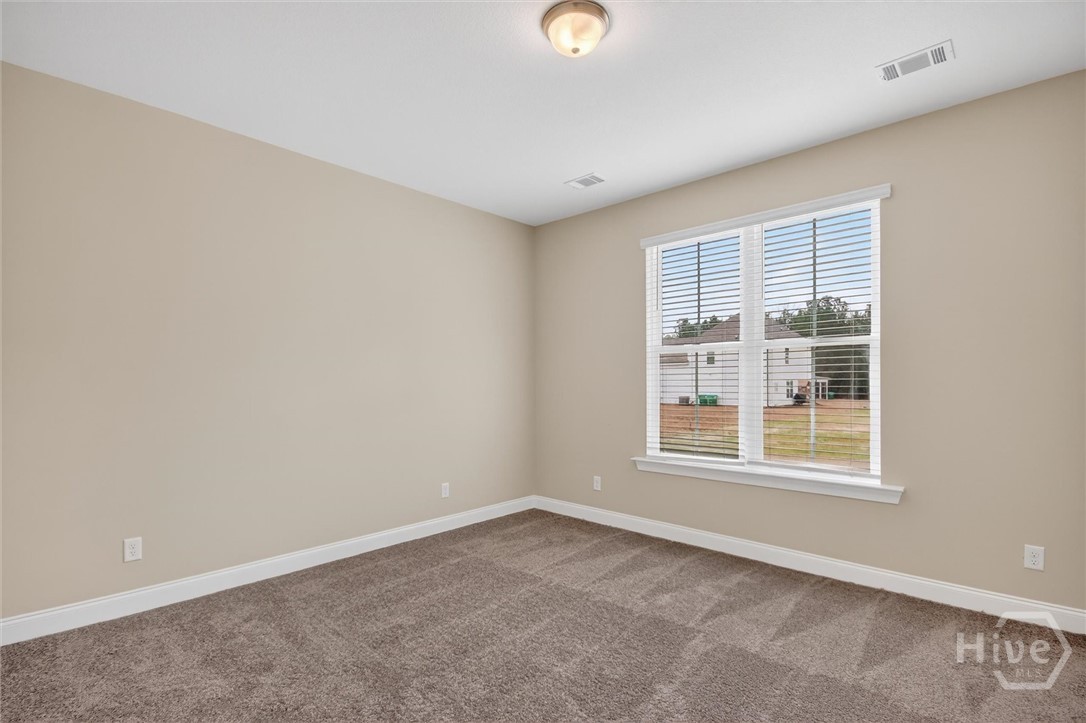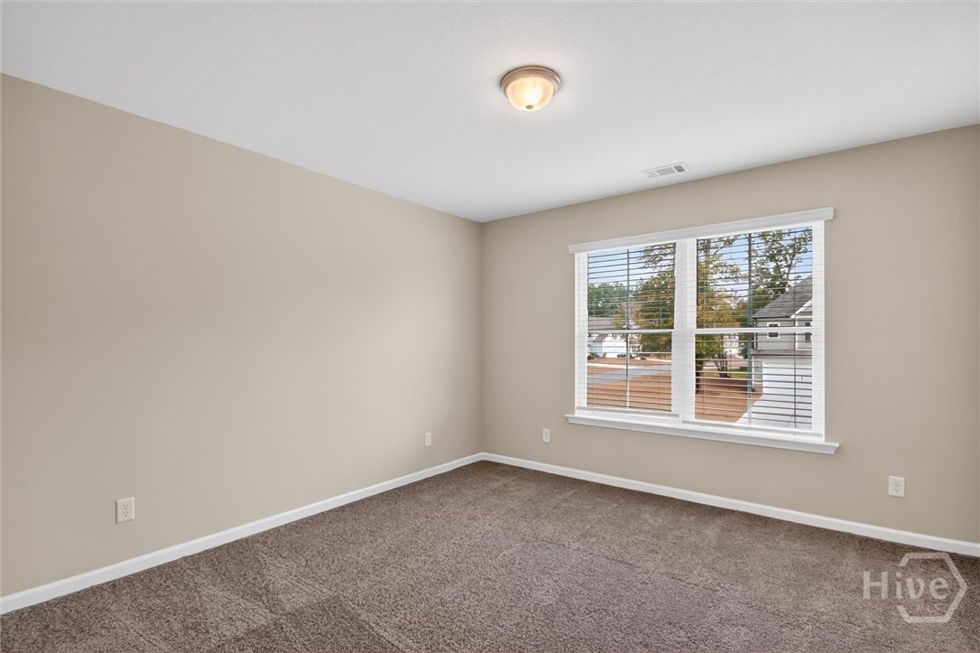 Welcome to Mossy Hollow! The popular 2738 plan by Faircloth Homes offers 5 bedrooms and 3 full bathrooms with a well-designed layout. A two-story foyer welcomes you inside. LVP flooring runs through the formal dining room, great room, kitchen, and breakfast area. The kitchen features granite countertops, a tile backsplash, island offering plenty of workspace, while a coffered ceiling adds elegance to the dining room. The main level also includes a guest bedroom and full bathroom, ideal for visitors. Upstairs you will find the remaining bedrooms, including the primary suite, along with the conveniently located laundry room. The primary bathroom offers dual vanities with granite countertops, two walk-in closets, and a separate tub and shower. Additional features include 2-inch faux wood blinds, a covered rear patio with fan, sodded yard to the corners of the home with a zoned irrigation system, and gutters on the front and back of the home.