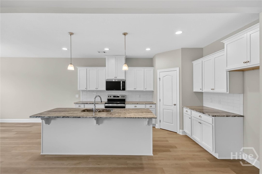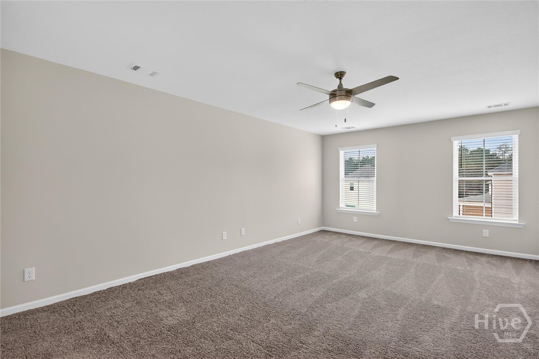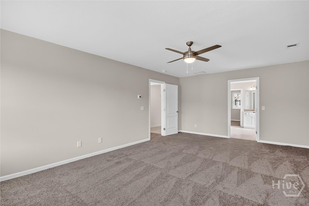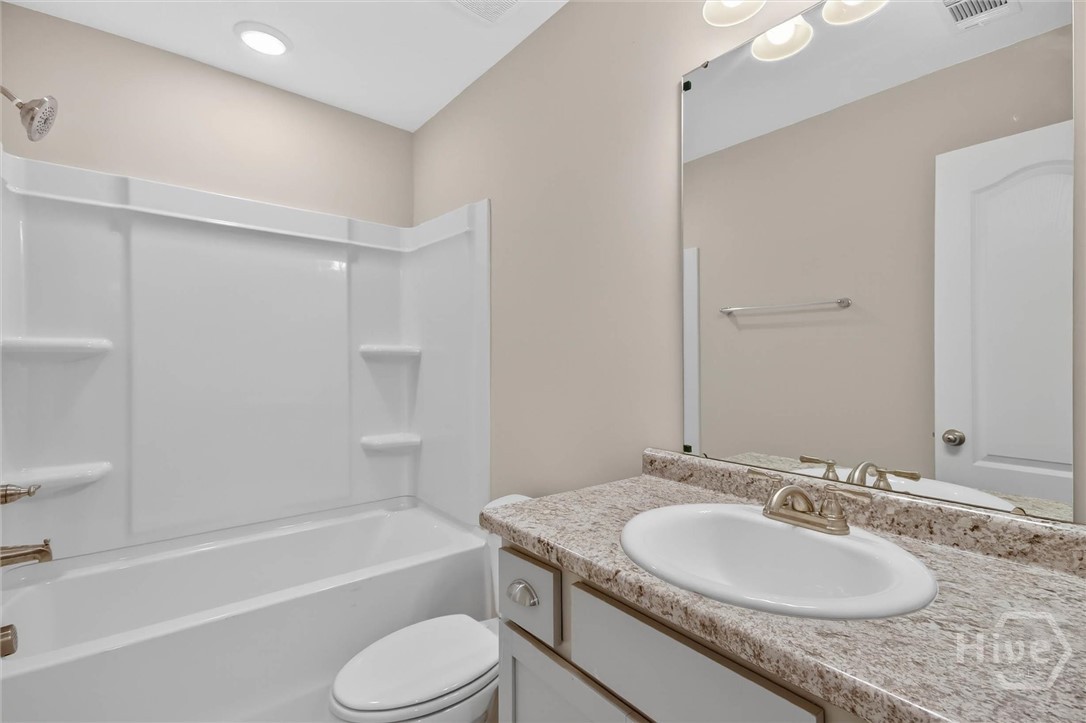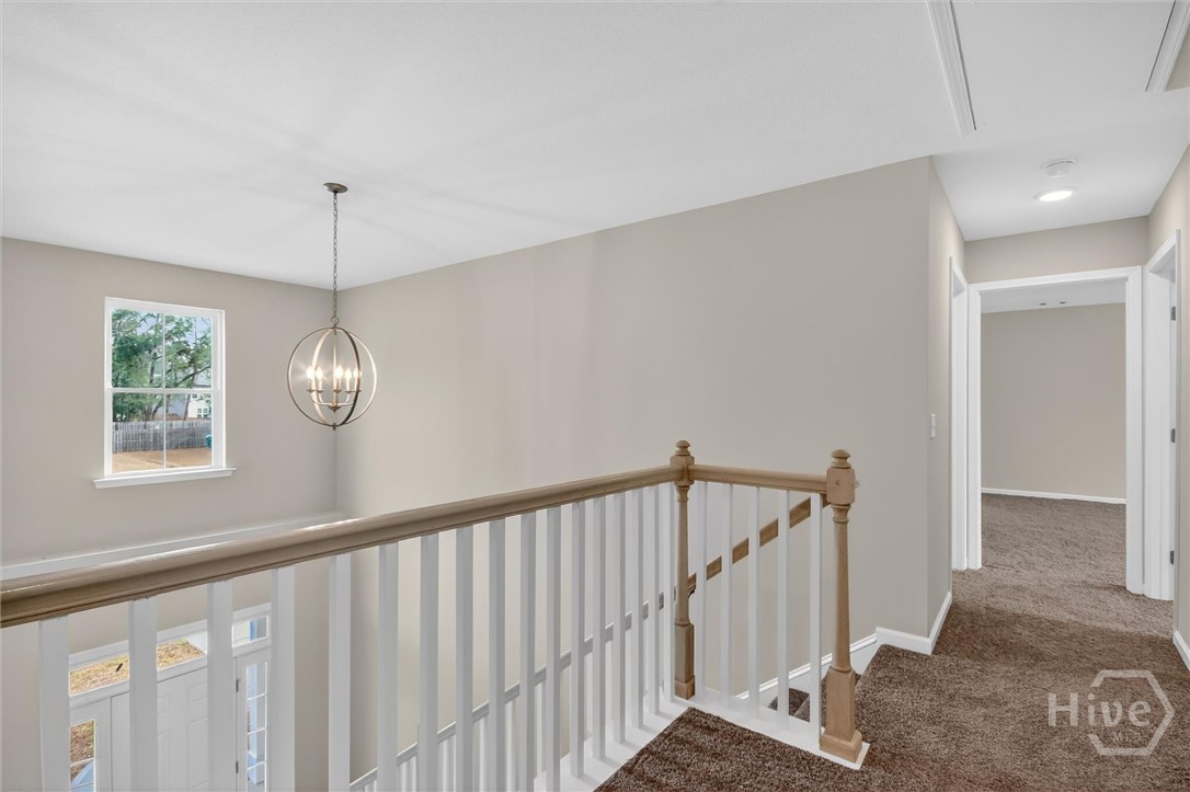 Welcome to Mossy Hollow! The popular 2738 plan by Faircloth Homes offers 5 bedrooms and 3 full bathrooms with a well-designed layout. A two-story foyer welcomes you inside. LVP flooring runs through the formal dining room, great room, kitchen, and breakfast area. The kitchen features granite countertops, a tile backsplash, island offering plenty of workspace, while a coffered ceiling adds elegance to the dining room. The main level also includes a guest bedroom and full bathroom, ideal for visitors. Upstairs you will find the remaining bedrooms, including the primary suite, along with the conveniently located laundry room. The primary bathroom offers dual vanities with granite countertops, two walk-in closets, and a separate tub and shower. Additional features include 2-inch faux wood blinds, a covered rear patio with fan, sodded yard to the corners of the home with a zoned irrigation system, and gutters on the front and back of the home.