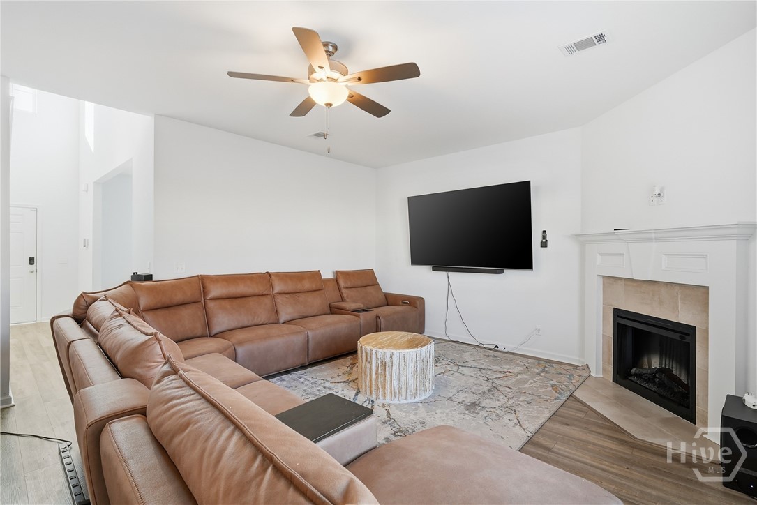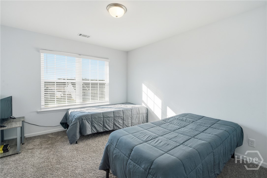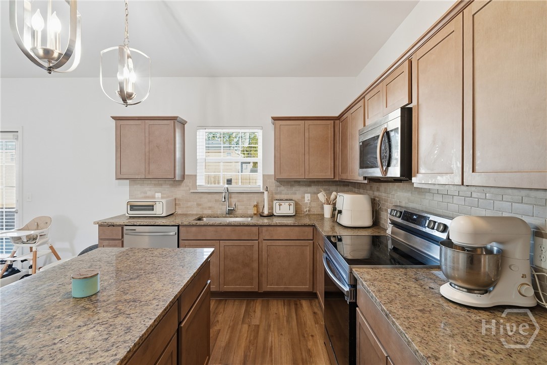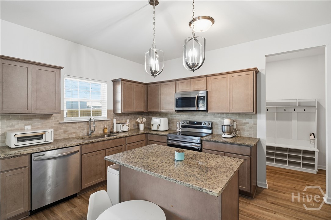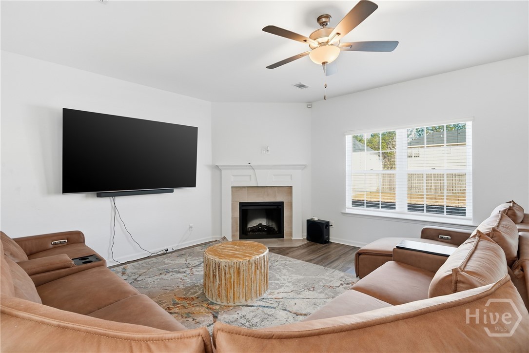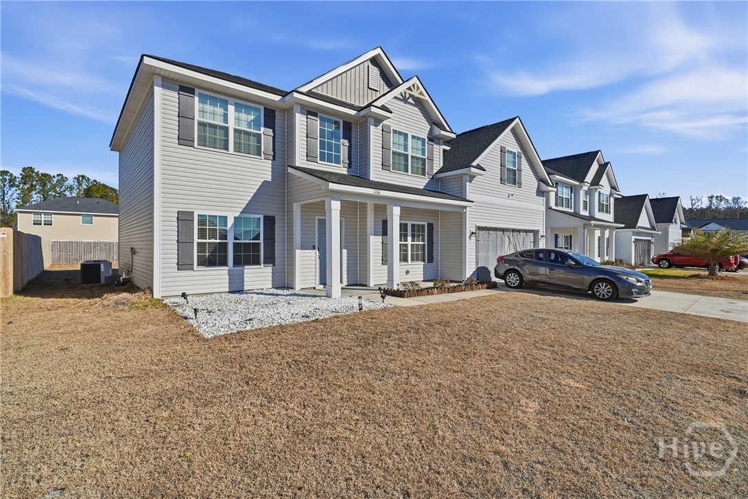 Located in the Tranquil South community, this beautifully designed 4-bedroom, 2.5-bath home features a two-story foyer, 9' ceilings on the main level, and a vaulted primary suite with a sitting area and two custom walk-in closets. Primary bath offers dual vanities, garden tub, and separate shower. The kitchen offers granite countertops, stained cabinetry, tile backsplash, and stainless steel appliances. Resilient vinyl flooring in wet areas including foyer, kitchen, baths, laundry and mudroom, ceiling fans in the family room and primary bedroom, and carpeted living spaces. The family room features a cozy fireplace, and the garage includes durable epoxy flooring. Spacious backyard with a covered patio, perfect for entertaining and relaxing outdoors! Conveniently located just minutes away from I-95, shopping, dining, and Fort Stewart.