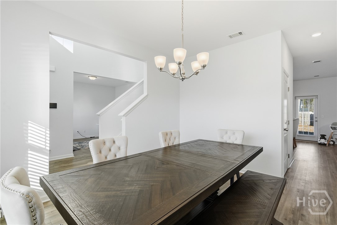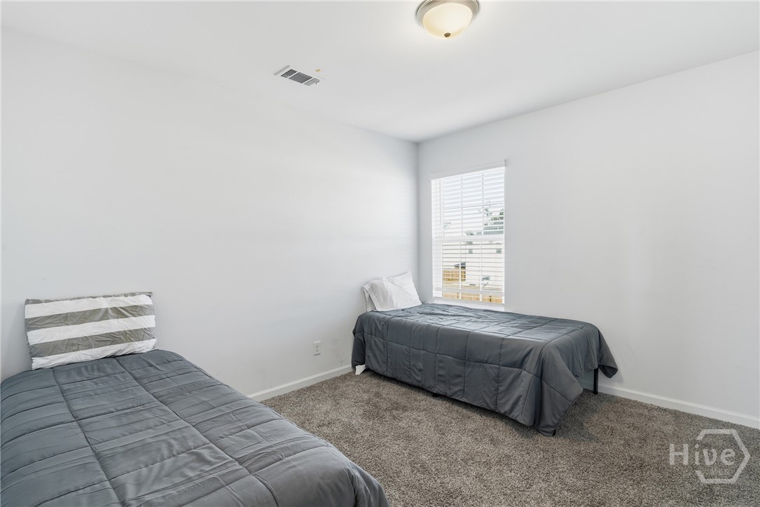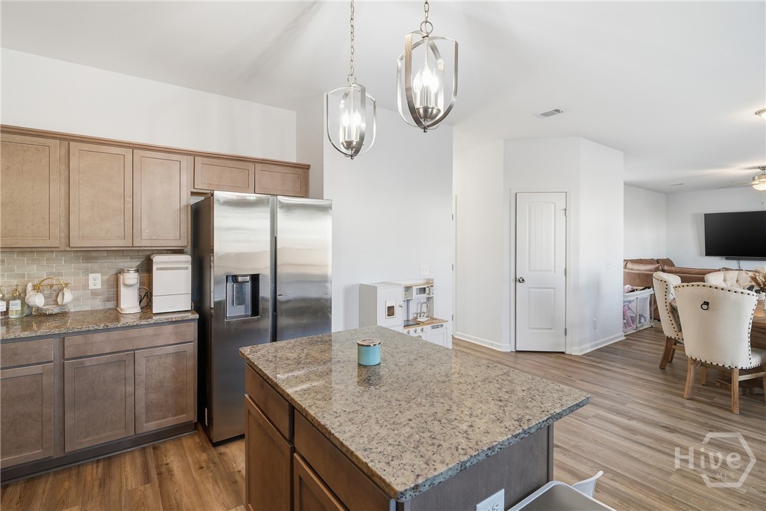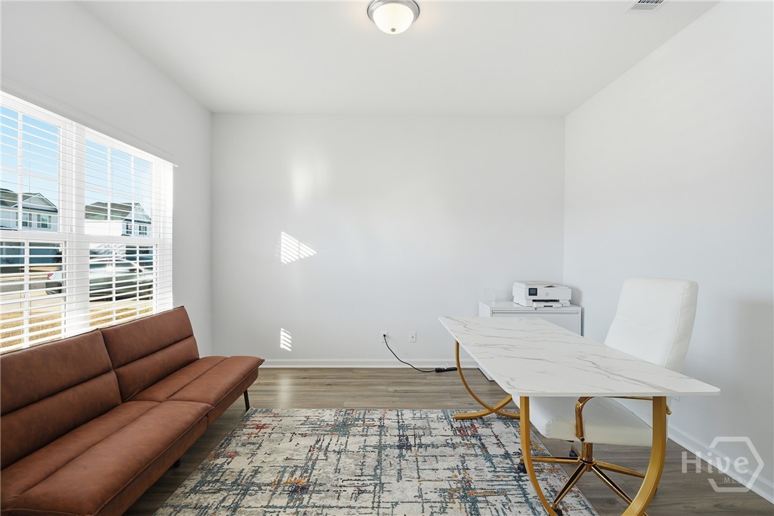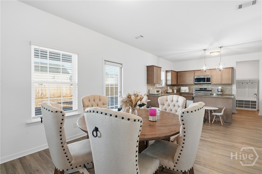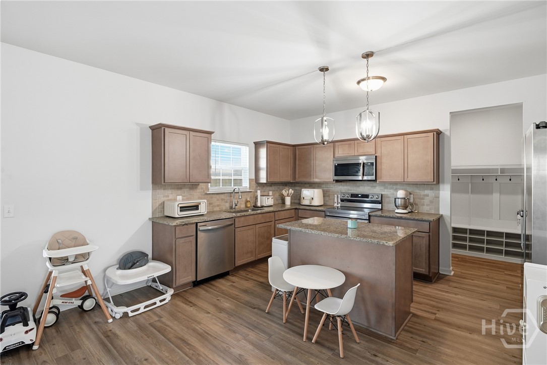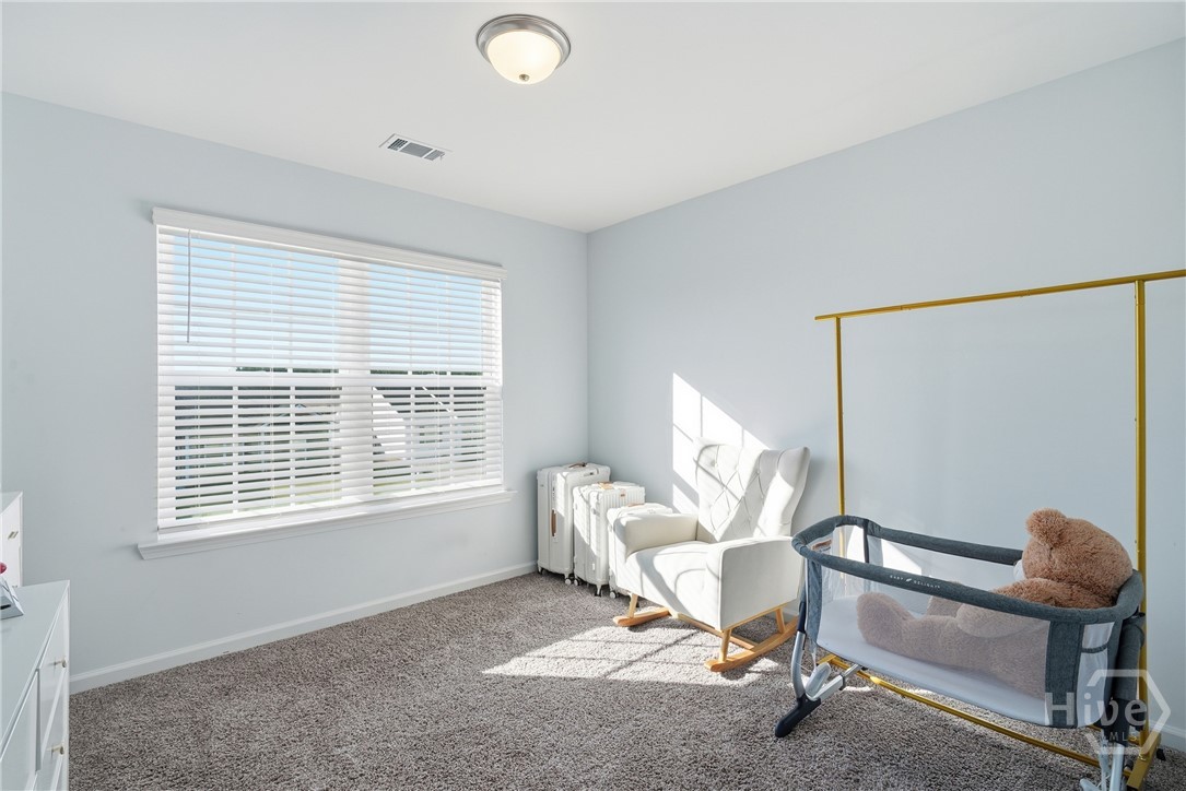 Located in the Tranquil South community, this beautifully designed 4-bedroom, 2.5-bath home features a two-story foyer, 9' ceilings on the main level, and a vaulted primary suite with a sitting area and two custom walk-in closets. Primary bath offers dual vanities, garden tub, and separate shower. The kitchen offers granite countertops, stained cabinetry, tile backsplash, and stainless steel appliances. Resilient vinyl flooring in wet areas including foyer, kitchen, baths, laundry and mudroom, ceiling fans in the family room and primary bedroom, and carpeted living spaces. The family room features a cozy fireplace, and the garage includes durable epoxy flooring. Spacious backyard with a covered patio, perfect for entertaining and relaxing outdoors! Conveniently located just minutes away from I-95, shopping, dining, and Fort Stewart.