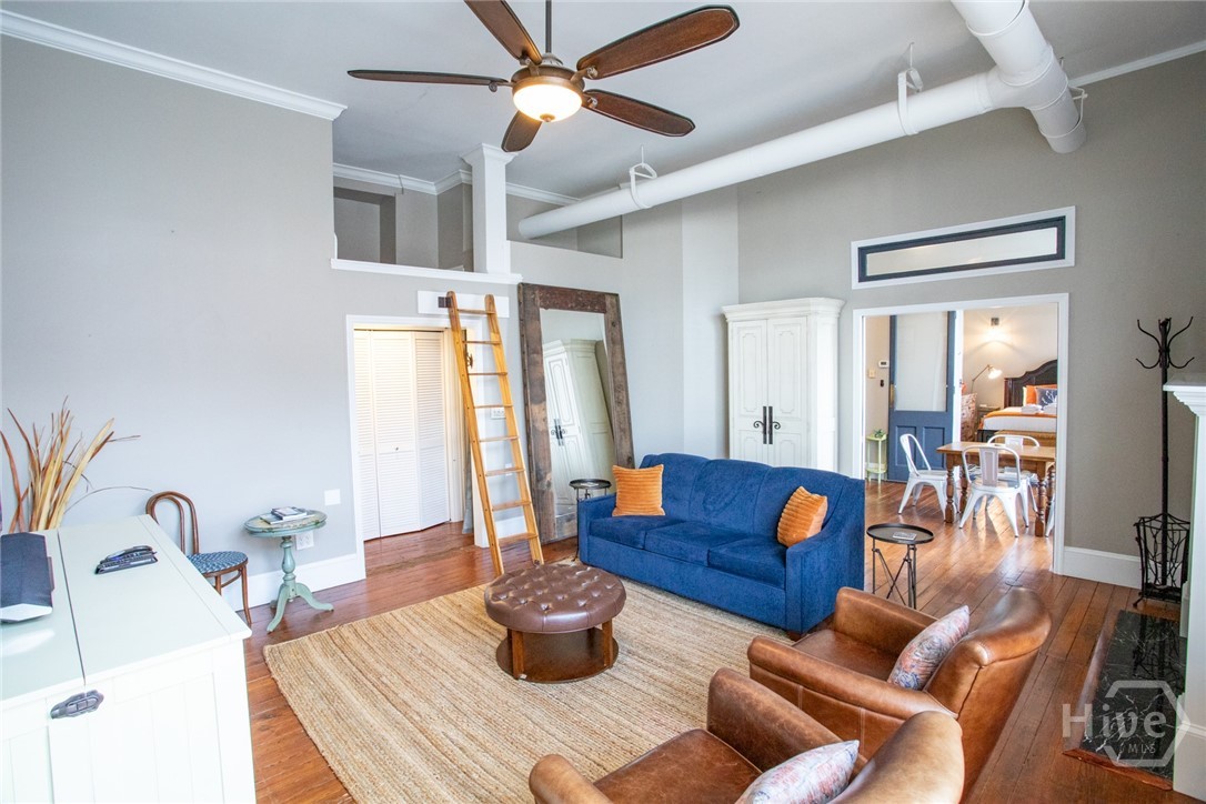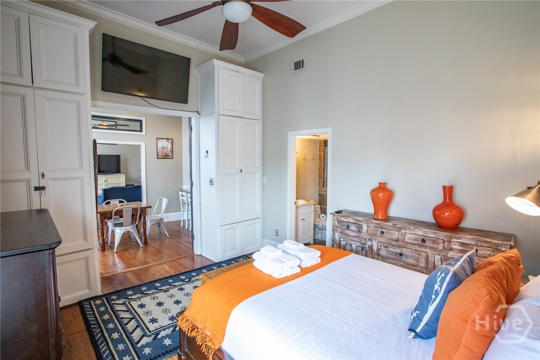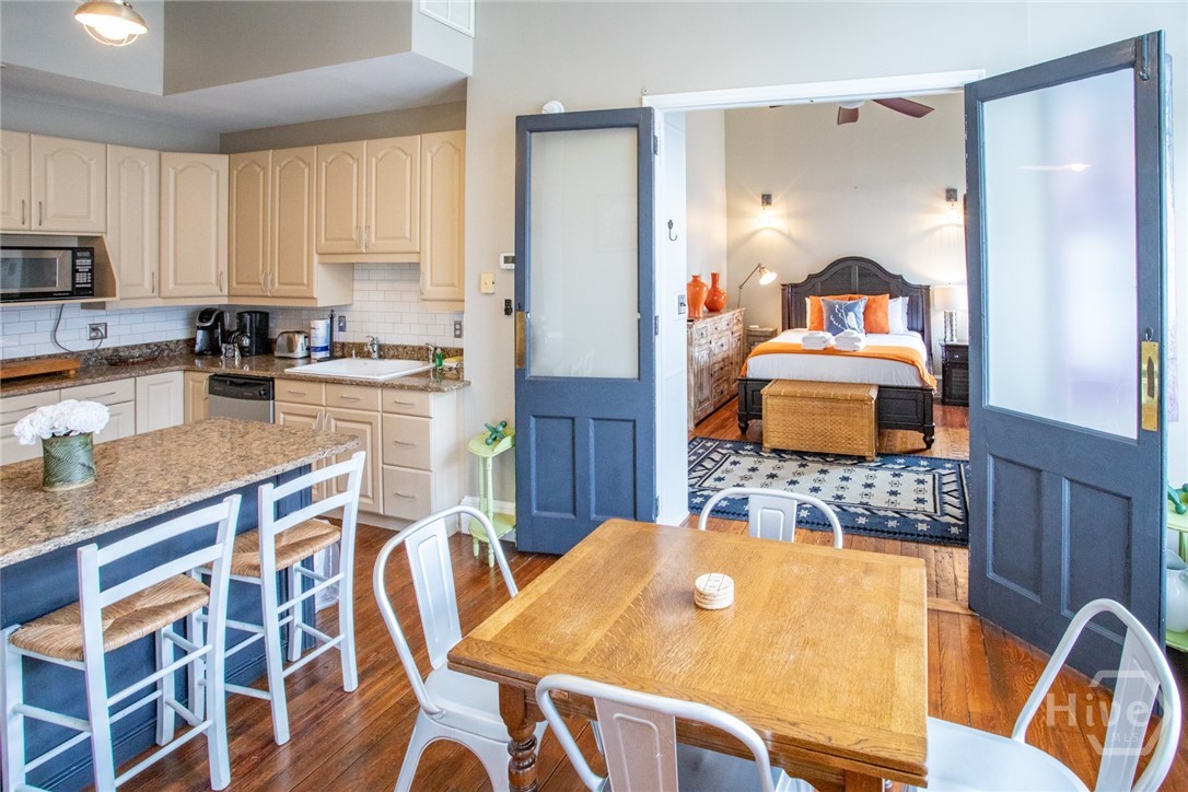 Lovely historic condo in prime location in Downtown Savannah. Condo is 1 bedroom with an en suite bathroom with an additional full bath in the hallway. TV stand in Living room is a Murphy bed and the sofa in the Living room is a fold out bed. Property can be sold furnished minus a few personal items. Condo is perfect for a second home, main residence or full time vacation rental (owner has STVR certificate). Kitchen is perfect for entertaining with double ovens, built in microwave, breakfast bar, granite countertops and more. Kitchen opens to large Living Room with fireplace, 11 foot ceilings throughout, as well as original heart pine floors throughout. Condo boasts incredible views of Downtown Savannah through its large historic windows. Lots of natural light and exposed brick throughout. Prime Location in heart of shopping, restaurants of all cuisines, and much more!