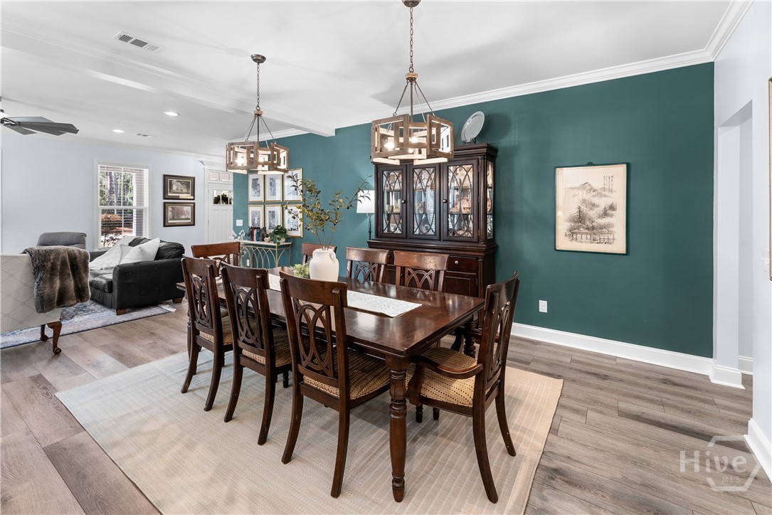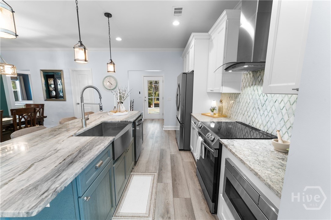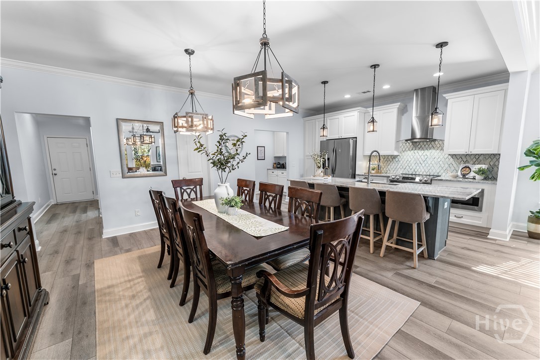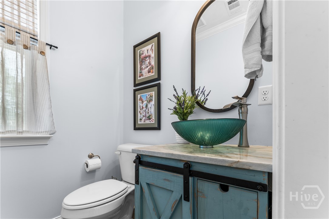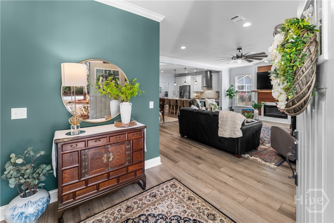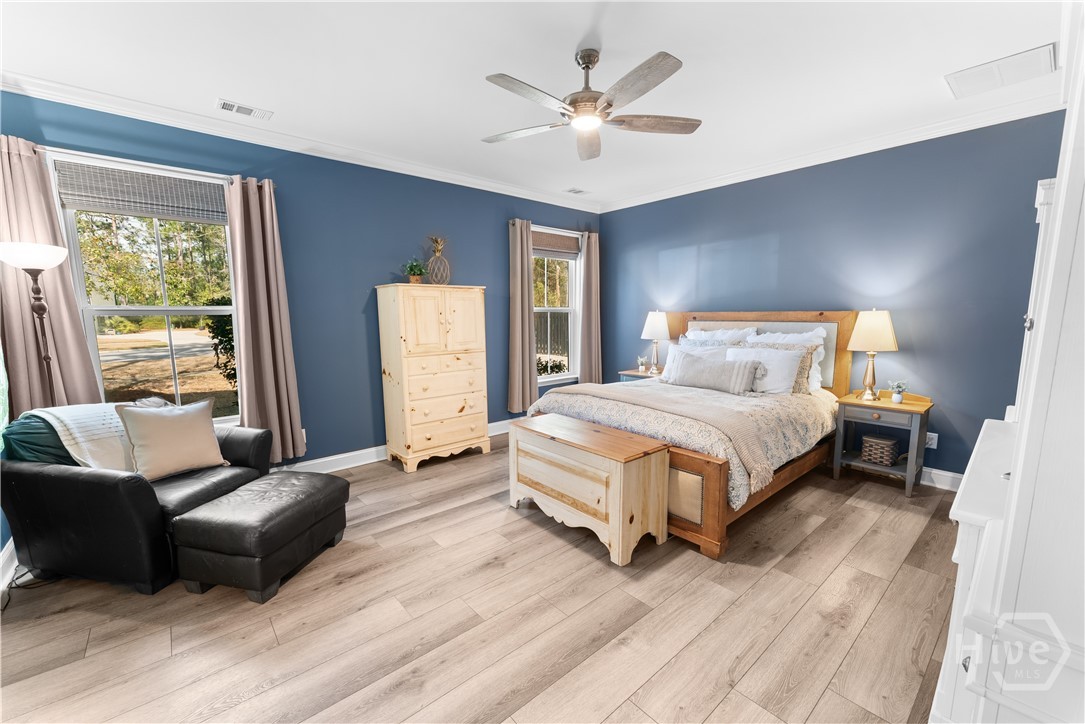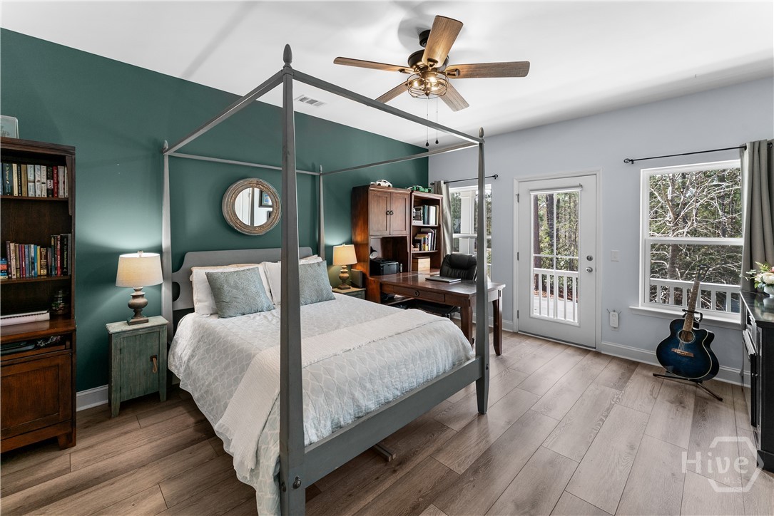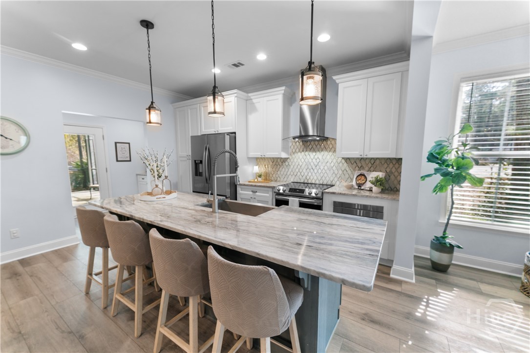 Located in the desirable Waterways Township, this stunning home showcases high-end finishes, thoughtful design, elegant coastal style throughout. Step inside to a welcoming foyer that opens to a bright and inviting open-concept floor plan, perfect for both everyday living and entertaining. The heart of the home features a beautifully designed kitchen with a sophisticated backsplash, designer lighting, and chic paint colors that create a warm and inviting atmosphere. The spacious living area is anchored by a heart pine accent electric fireplace, adding character and Lowcountry charm. Owner’s suite on main level offers comfort & privacy, creating a relaxing retreat within the home. Upstairs, you’ll find four additional bedrooms and two full baths, including a private guest suite with its own bath and walk-in closet—perfect for visitors or extended family. One of the most enchanting features of the home is the fairytale-style second-level porch, offering a peaceful space to relax and enjoy the surrounding beauty. A welcoming foyer introduces the home’s bright and airy open floor plan, where thoughtful design and elegant details create a warm, sophisticated atmosphere. Additional features include, butler pantry/coffee bar and desk area that opens onto a private screened porch that flows into a fenced backyard area, also the side entry double car garage that has a private entrance with builtin bench and cubbies plus a huge laundry with cabnetry and sink area. Fresh paint, floors, window coverings and well cared for home that makes this home ready for you. A perfect blend of modern style with timeless Southern character, Residents of Waterways enjoy incredible amenities and a lifestyle surrounded by nature, all just a short drive to Savannah, airport, historical Coastal Georgia Coastline to enjoy and beyond!