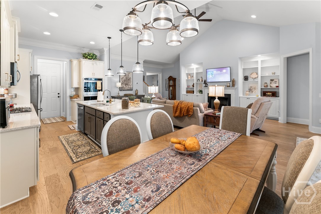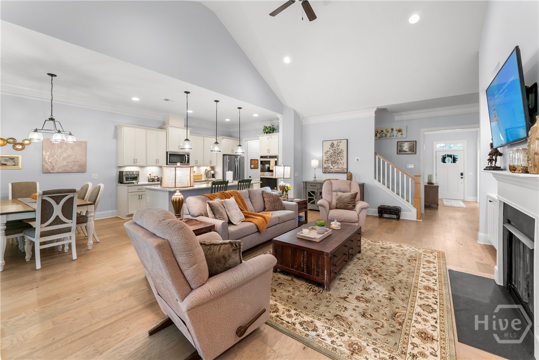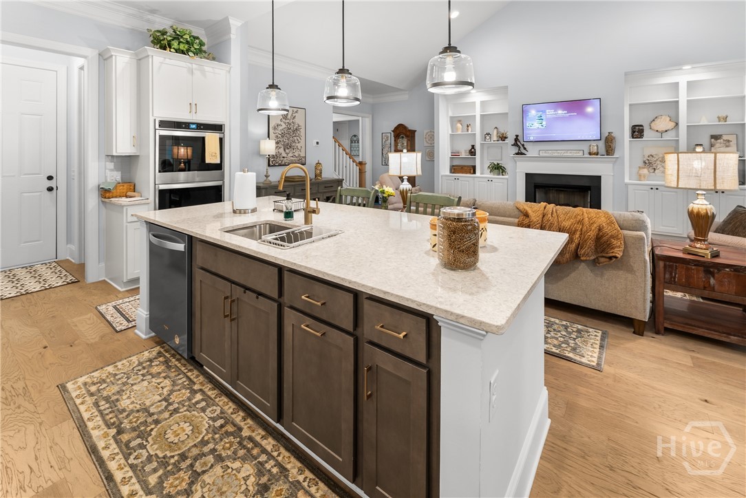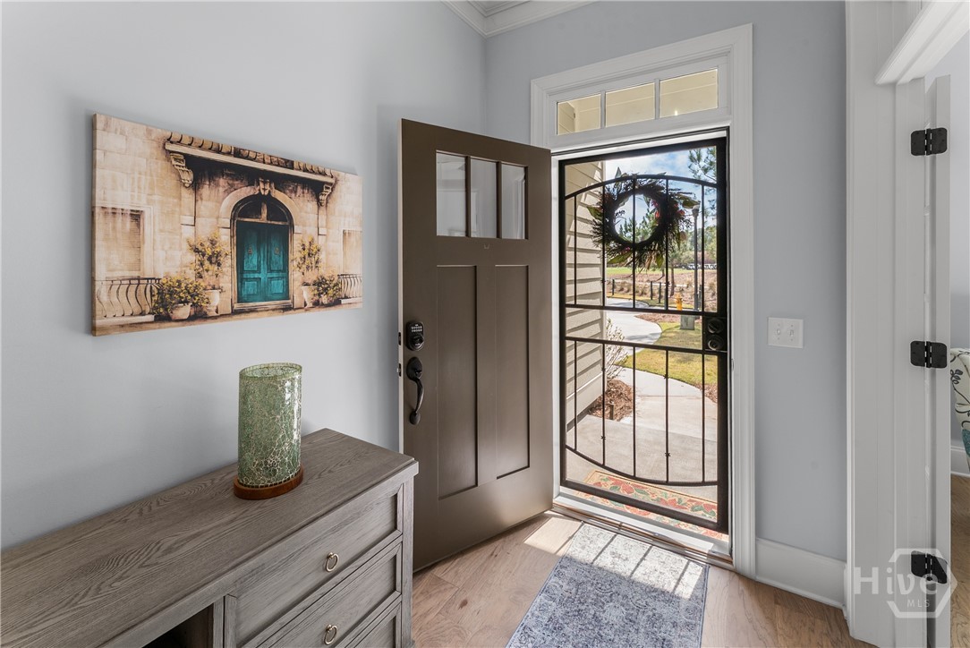 Enjoy elevated Lowcountry living in this thoughtfully designed luxury villa end-unit with protected nature preserve views—just steps from the Savannah Quarters Clubhouse, premier amenities, and championship golf in Savannah Quarters. The beautiful Seagrass floor plan offers 3 bedrooms and 3 full baths with abundant natural light, spacious living areas, and added privacy, enhanced by refined architectural details including 10’ ceilings, 8’ doors, and elegant double crown molding. The open-concept living area showcases soaring 12+ ft vaulted ceilings and a stunning gas fireplace flanked by custom built-in bookcases. Specialty wood flooring adds warmth and character throughout the main living space. The well-appointed kitchen features upscale finishes, gas cooktop, double ovens, and generous workspace flowing seamlessly into the dining and living areas. A dedicated office/study provides the perfect work-from-home space or quiet retreat. The flexible floor plan also offers a private second-floor bonus room or guest bedroom. Telescopic sliding glass doors open from the great room to an expansive screened lanai and patio—ideal for year-round indoor-outdoor living while enjoying peaceful preserve views. Additional highlights include custom plantation shutters, custom closet systems, abundant storage, and a spacious two-car garage—completing this beautifully designed home in one of Pooler’s most sought-after communities.