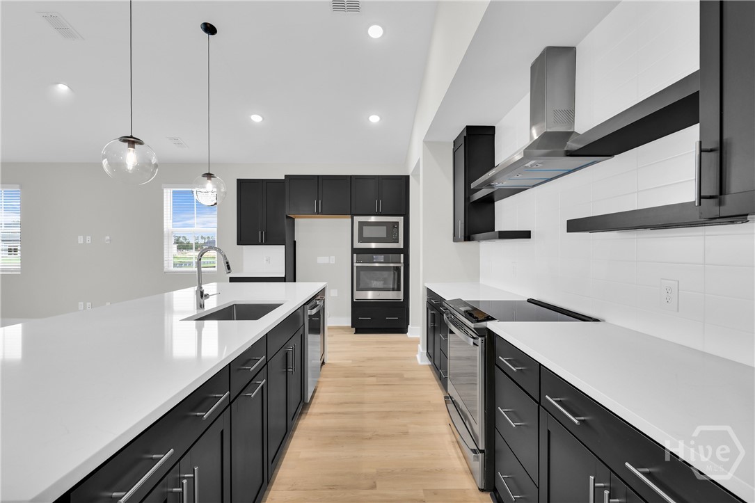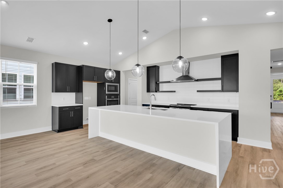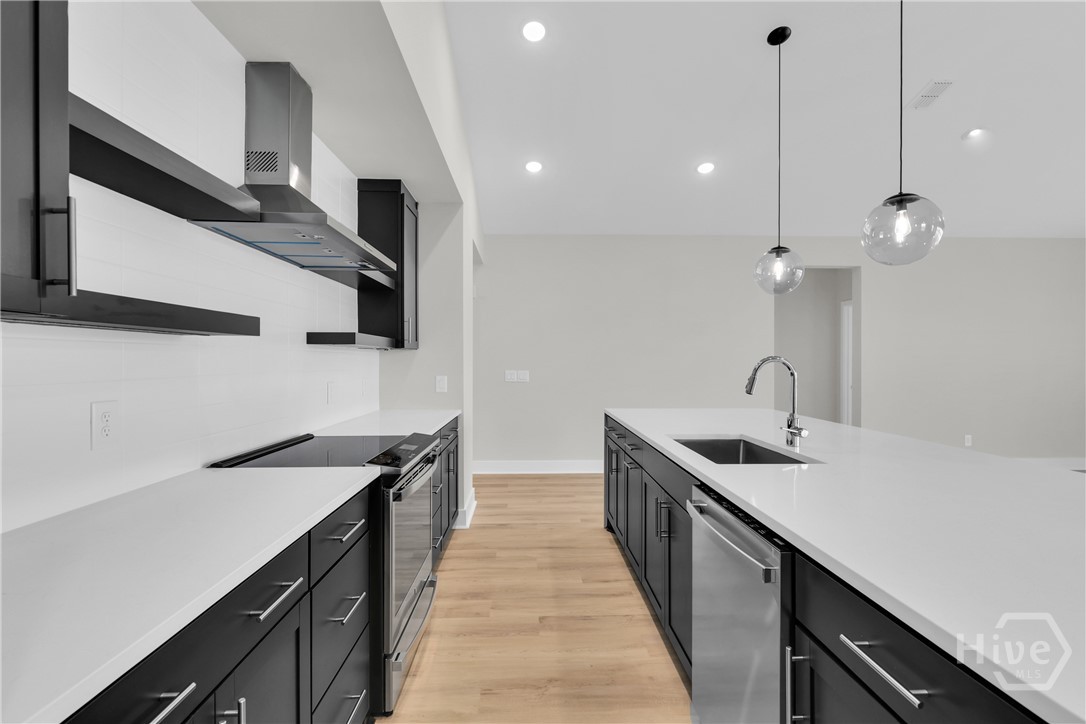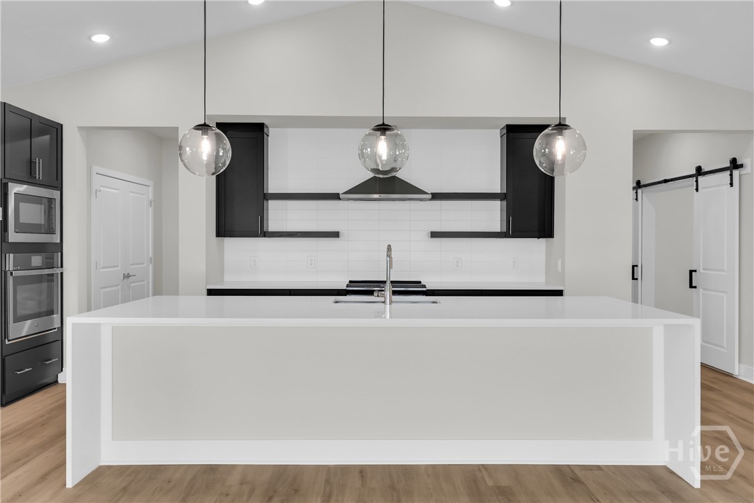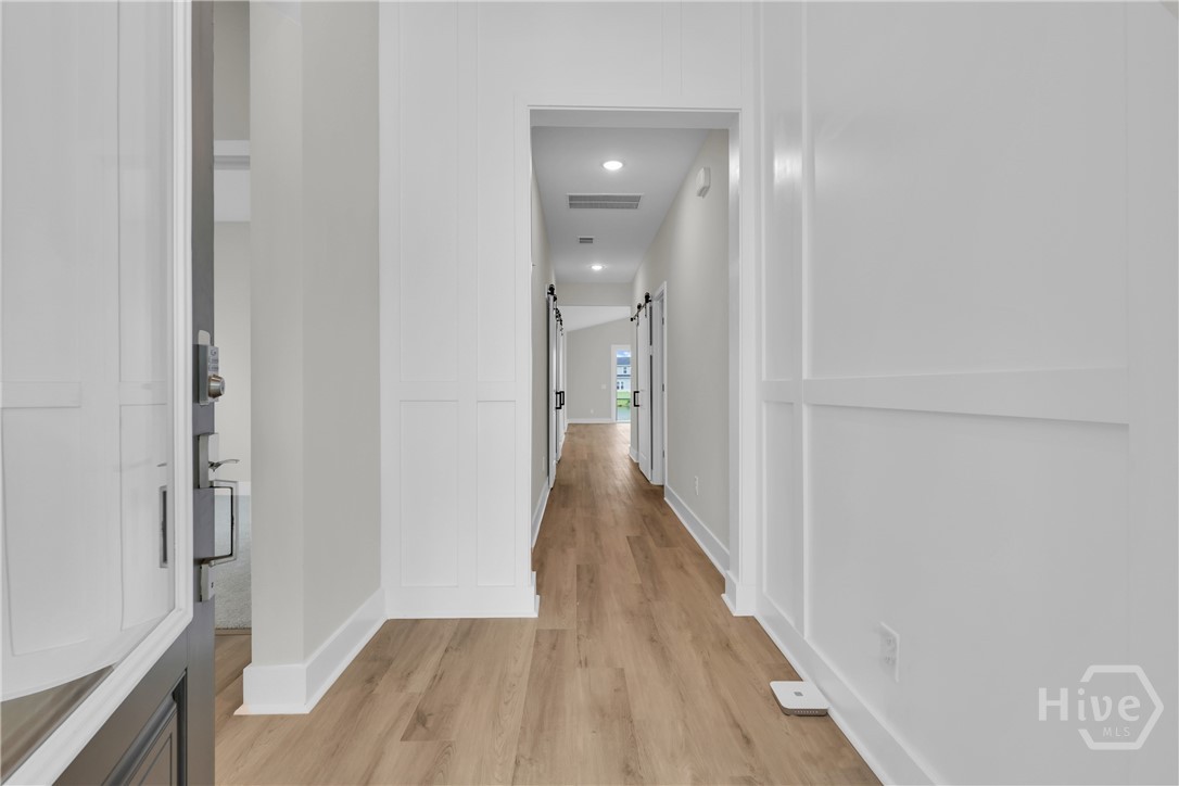 This beautifully designed one-story home welcomes you with an impressive 8-foot front door and opens into a spacious family room with soaring vaulted ceilings, creating a bright and airy feel. Offering three comfortable bedrooms and a dedicated office, it's ideal for remote work or study. The chef-inspired kitchen boasts a stunning 11 ft quartz island, stainless steel appliances, and ample workspace. Thoughtful details like rustic barn doors, decorative trim, and durable LVP flooring throughout elevate the home’s charm and durability. Enjoy effortless indoor-outdoor living with a 15-foot multi-slide glass door leading to a vaulted covered patio — perfect for relaxing or entertaining. Generous storage is included to meet all your needs. Just 15 minutes to the Hyundai Metaplant, Costco, and Pooler Outlets. Don't miss your opportunity to call this gem home! *pictures are of model homes and details may vary*