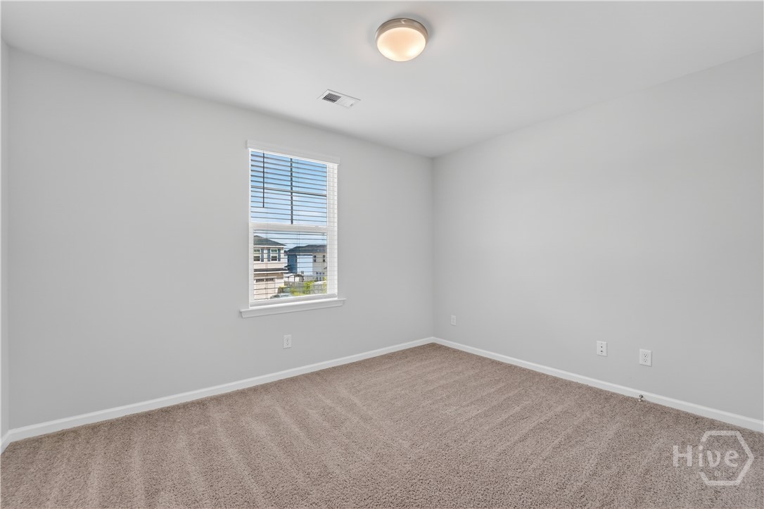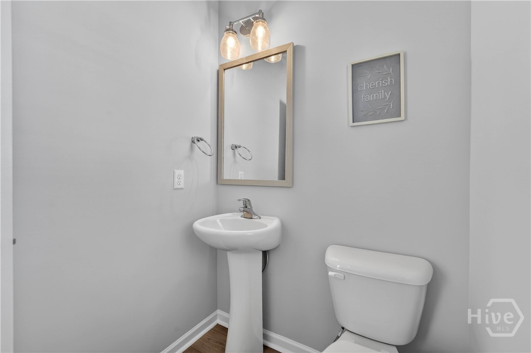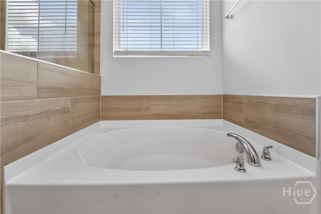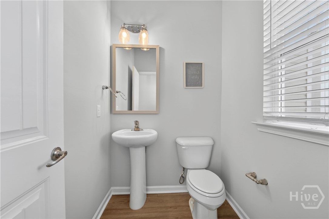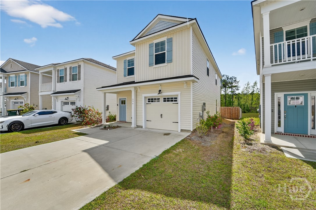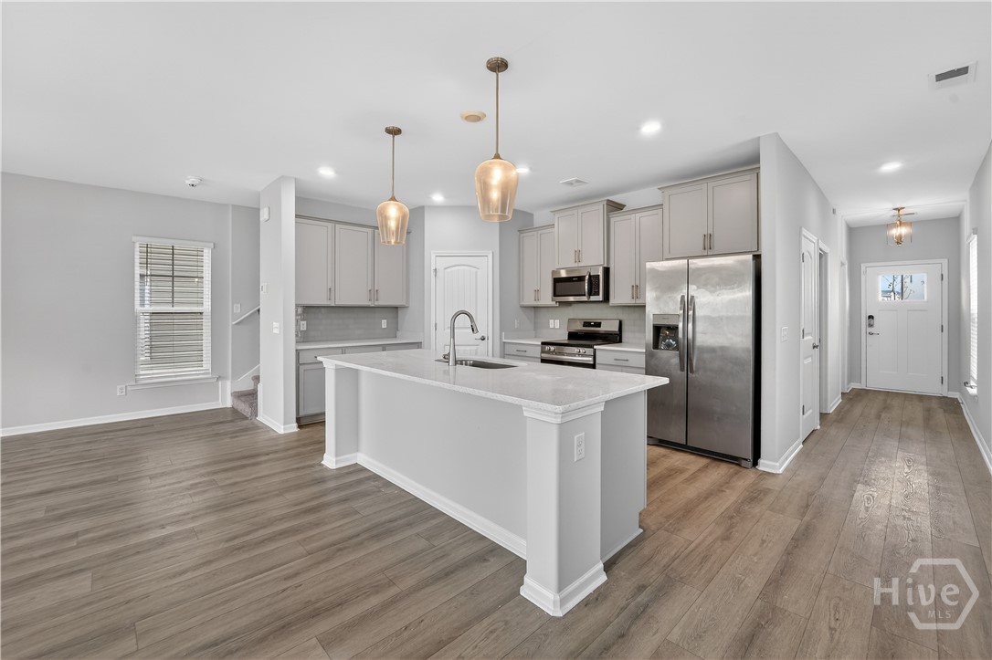 This beautifully designed 4-bedroom, 2.5-bath home offers a bright, open layout filled with natural light and thoughtful upgrades throughout. Freshly painted throughout, the main level features durable vinyl flooring, creating a seamless and inviting space for both everyday living and entertaining. The kitchen is a standout with stylish gray cabinetry, quartz countertops, a single-bowl sink, tiled backsplash, and stainless steel appliances. Upstairs, all four bedrooms provide comfort and privacy, along with two full bathrooms and generous closet space. The spacious primary suite includes a well-appointed bath with a separate tiled shower and soaking tub, plus a dual-sink quartz vanity. Enjoy outdoor living in the fully sodded yard with an irrigation system already in place. Conveniently located near Ft. Stewart and Hunter Army Airfield, this home offers easy access to work, shopping, and dining while maintaining a comfortable residential setting.