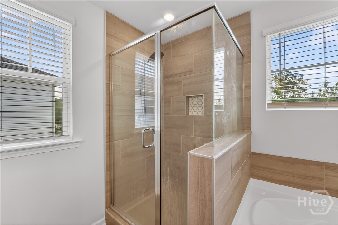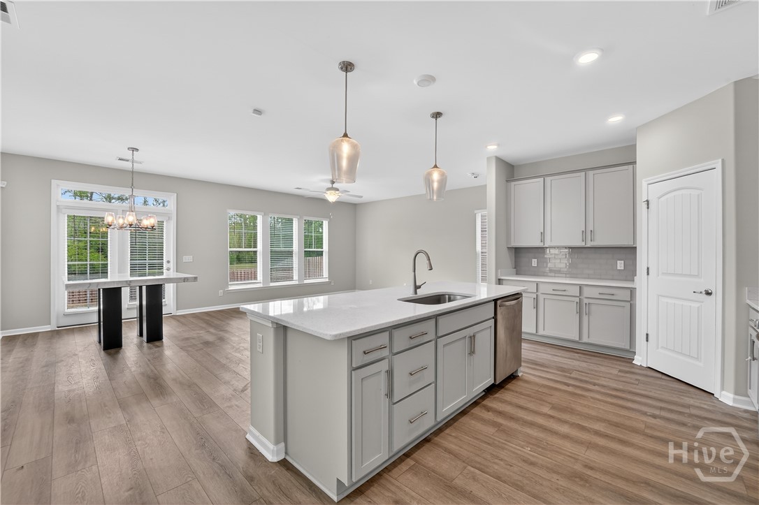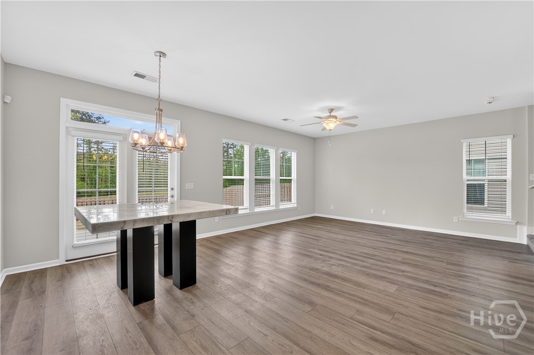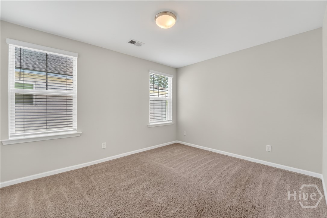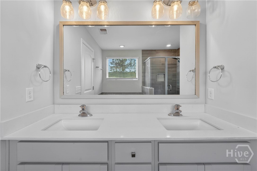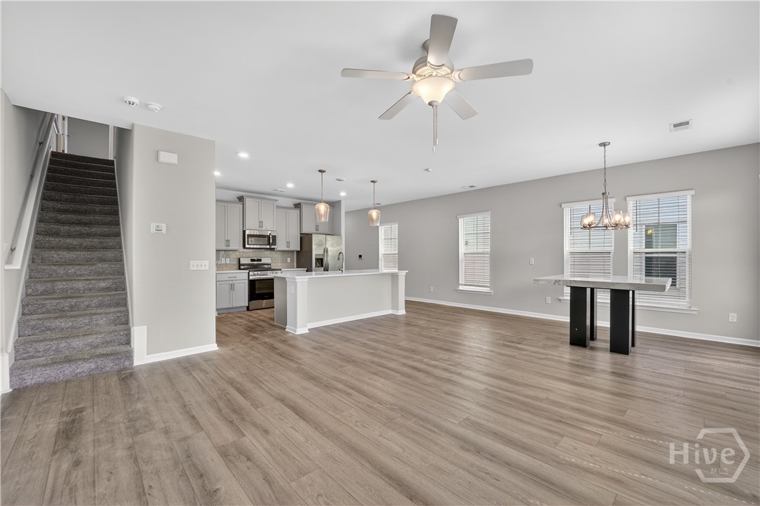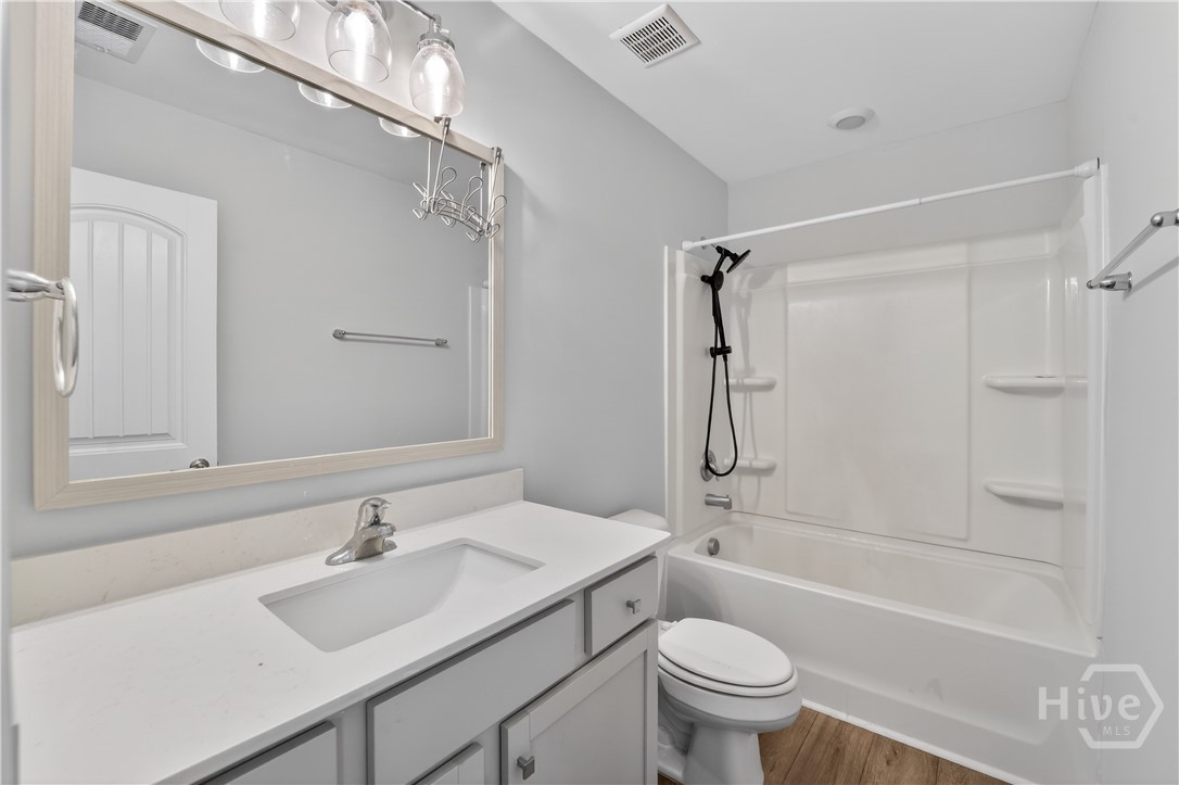 This beautifully designed 4-bedroom, 2.5-bath home offers a bright, open layout filled with natural light and thoughtful upgrades throughout. Freshly painted throughout, the main level features durable vinyl flooring, creating a seamless and inviting space for both everyday living and entertaining. The kitchen is a standout with stylish gray cabinetry, quartz countertops, a single-bowl sink, tiled backsplash, and stainless steel appliances. Upstairs, all four bedrooms provide comfort and privacy, along with two full bathrooms and generous closet space. The spacious primary suite includes a well-appointed bath with a separate tiled shower and soaking tub, plus a dual-sink quartz vanity. Enjoy outdoor living in the fully sodded yard with an irrigation system already in place. Conveniently located near Ft. Stewart and Hunter Army Airfield, this home offers easy access to work, shopping, and dining while maintaining a comfortable residential setting.