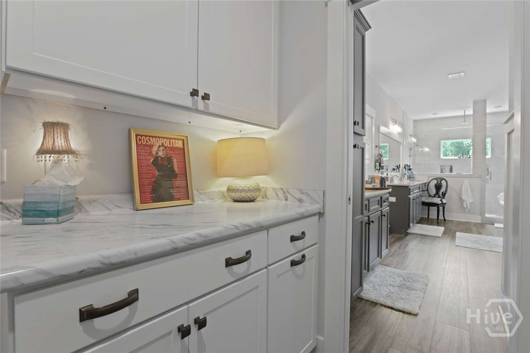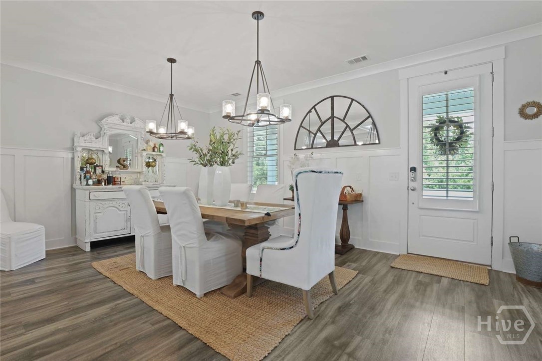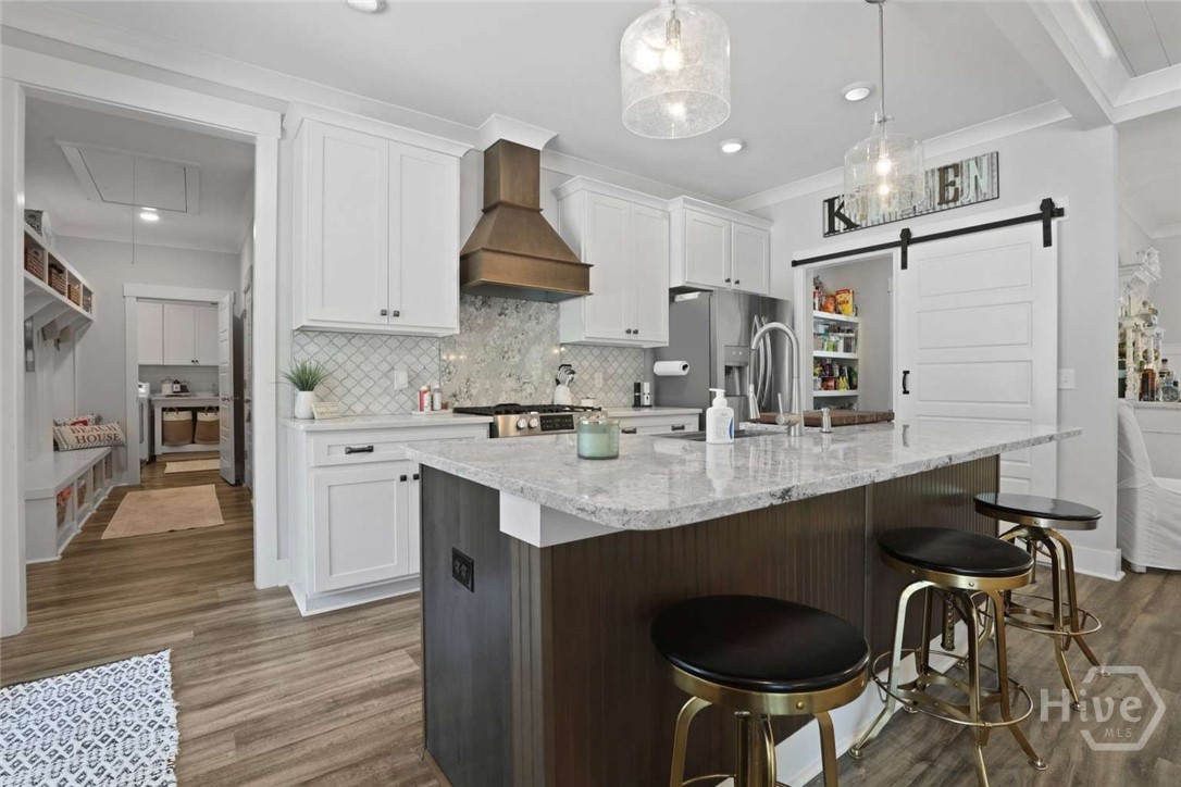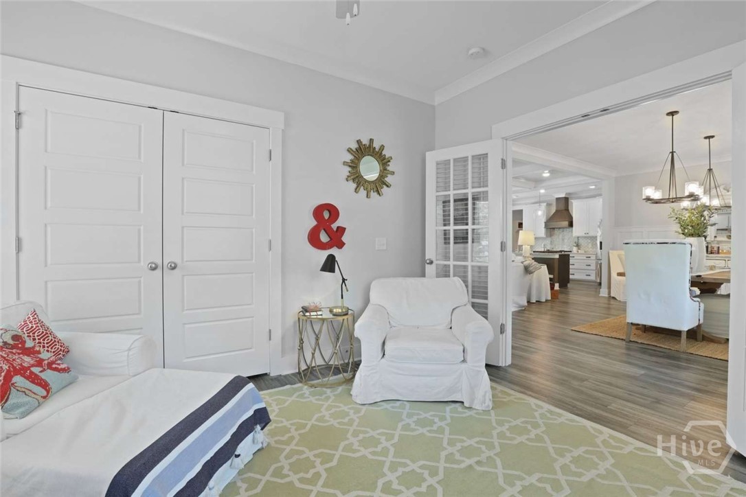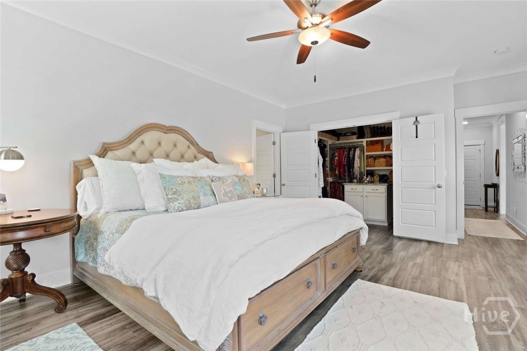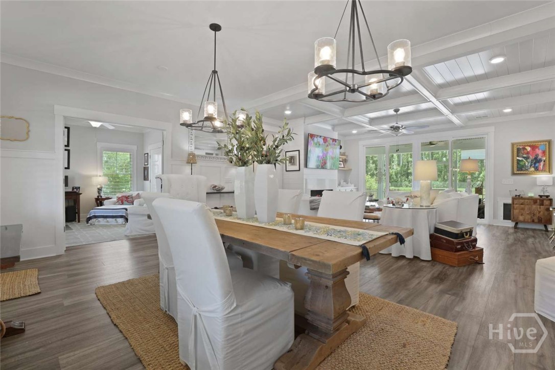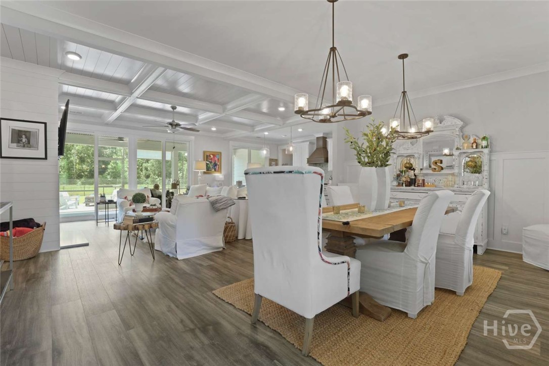 Welcome to this stunning 3-bedroom, 2.5-bath custom-built coastal cottage home located in a highly desirable gated community in the heart of Richmond Hill, GA, minutes from I-95, US-17 and a short drive to Savannah. Built in 2019, this luxury custom home blends timeless coastal design with high-end finishes and thoughtful craftsmanship throughout. Step into an open-concept living space designed for both comfort and entertaining, featuring an abundance of natural light, extensive custom woodwork, and a show-stopping coffered ceiling in the main living area. The home is elevated by custom moldings, wainscoting, and built-in cabinetry, creating a refined yet relaxed coastal aesthetic. The gourmet kitchen flows seamlessly into the Living and dining areas and is complemented by a custom walk-in pantry/butler’s pantry. Split floor plan, large primary bedroom, walk in shower and stand alone tub, Tankless Water Heater, Huge screened Lanai, Lg paver patio, Custom 4.5 " shutters throughout.