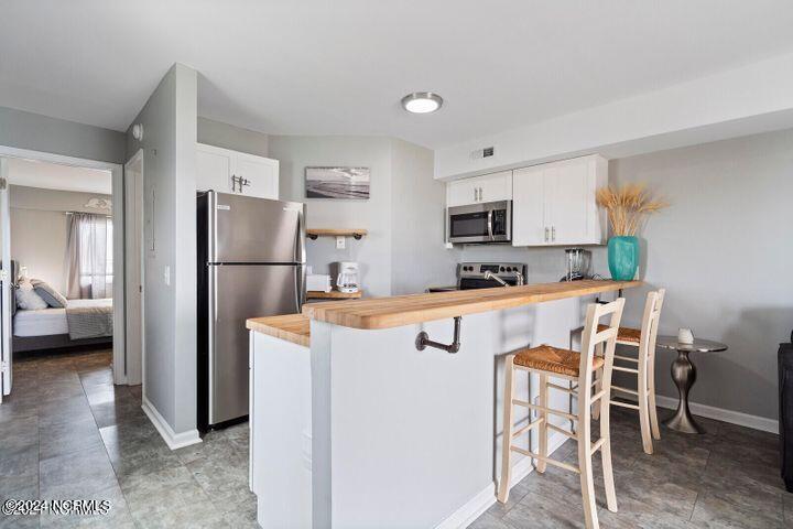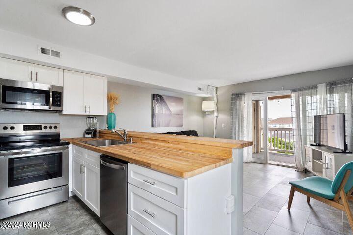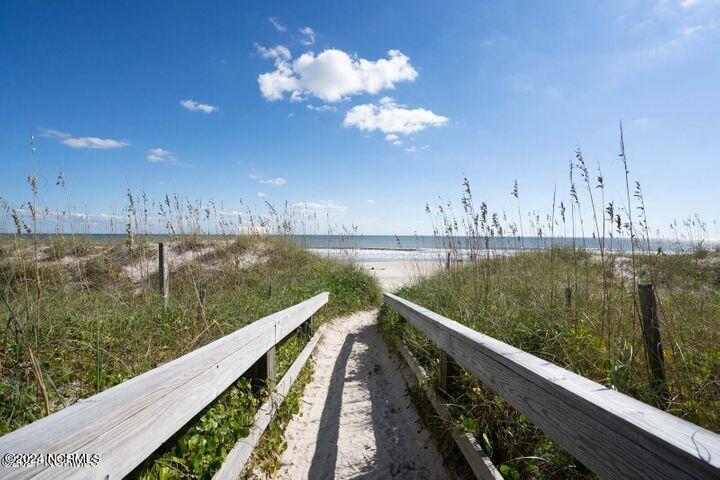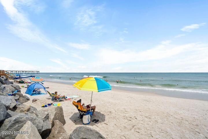 Beautifully updated and fully furnished condo just steps away from the ocean, the Carolina Beach pier, and Freeman Park. This property is ideal for use as an investment opportunity or a second home. Featuring luxury vinyl flooring throughout, stainless steel appliances, and a modern kitchen with shaker cabinets, a butcher block counter/bar, and industrial pipe shelving. The living area is designed for a comfort with a sleeper sofa and a 50'' smart 4K TV, while the bedroom offers a cozy queen-sized upholstered platform bed and a spacious five-drawer chest. Impact windows and sliding glass doors bring in abundant natural light. Enjoy ocean breezes from the balcony with a 3-piece bistro set. Sunskipper offers two pools and convenient beach access just across the street. With its prime location attractions and beach access, this condo is a fantastic coastal retreat!