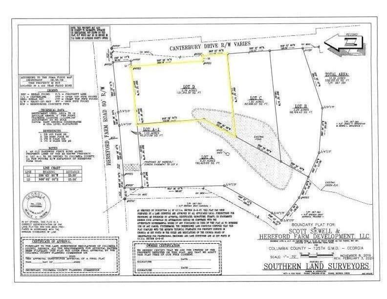 This beautiful 2.78 acre waterfront lot in the heart of highly desirable Evans, GA is a RARITY and ready for you to build your dream home!! A stunning custom-designed home featuring all bedrooms on the main has been designed for this lot by a local builder and is available and completely customizable!! This property features a wooded lot of hardwoods and pines with a beautiful LONG VIEW of the lake, sunsets filtering through the trees and abundant wildlife! If fishing is your passion, then this lot is perfect for your next home! The pond is loaded with bass, bluegill, shellcracker, crappie, grass carp and more! Whitetail deer, geese and numerous birds also frequent the surroundings. Nestled on one of the shared lakes in the well-established Canterbury neighborhood, it grants easy access to Fort Gordon, medical facilities, shopping, dining, recreation and entertainment options, yet has that rural, country-living feel. The quiet Canterbury neighborhood located off of Hereford Farm Rd boasts large lots and NO HOA! The lot is zoned Residential (R1) and has paved road frontage with power (electricity, water, internet/cable). A soil survey and septic engineering report have been completed and can be made available to the buyer.