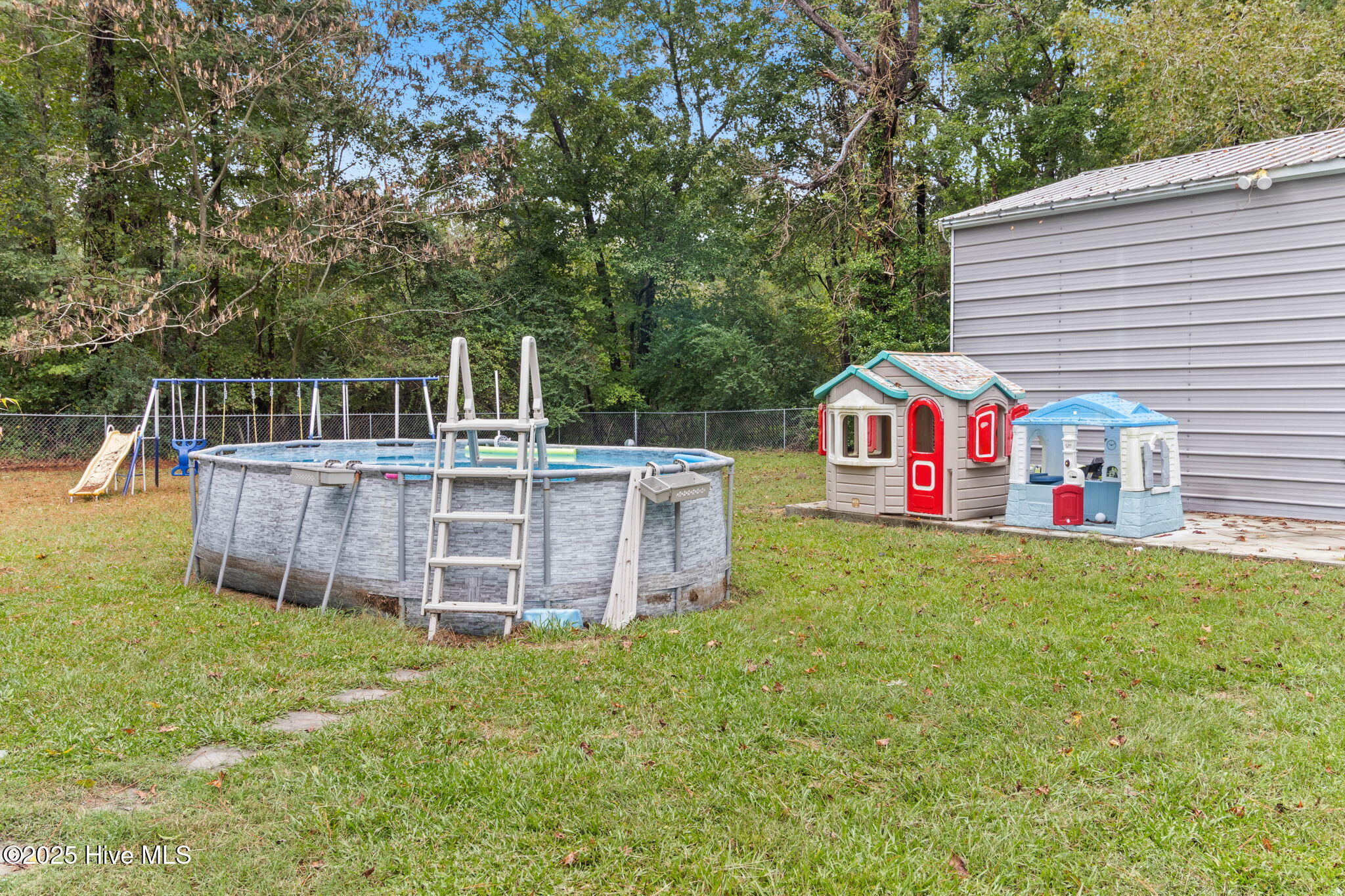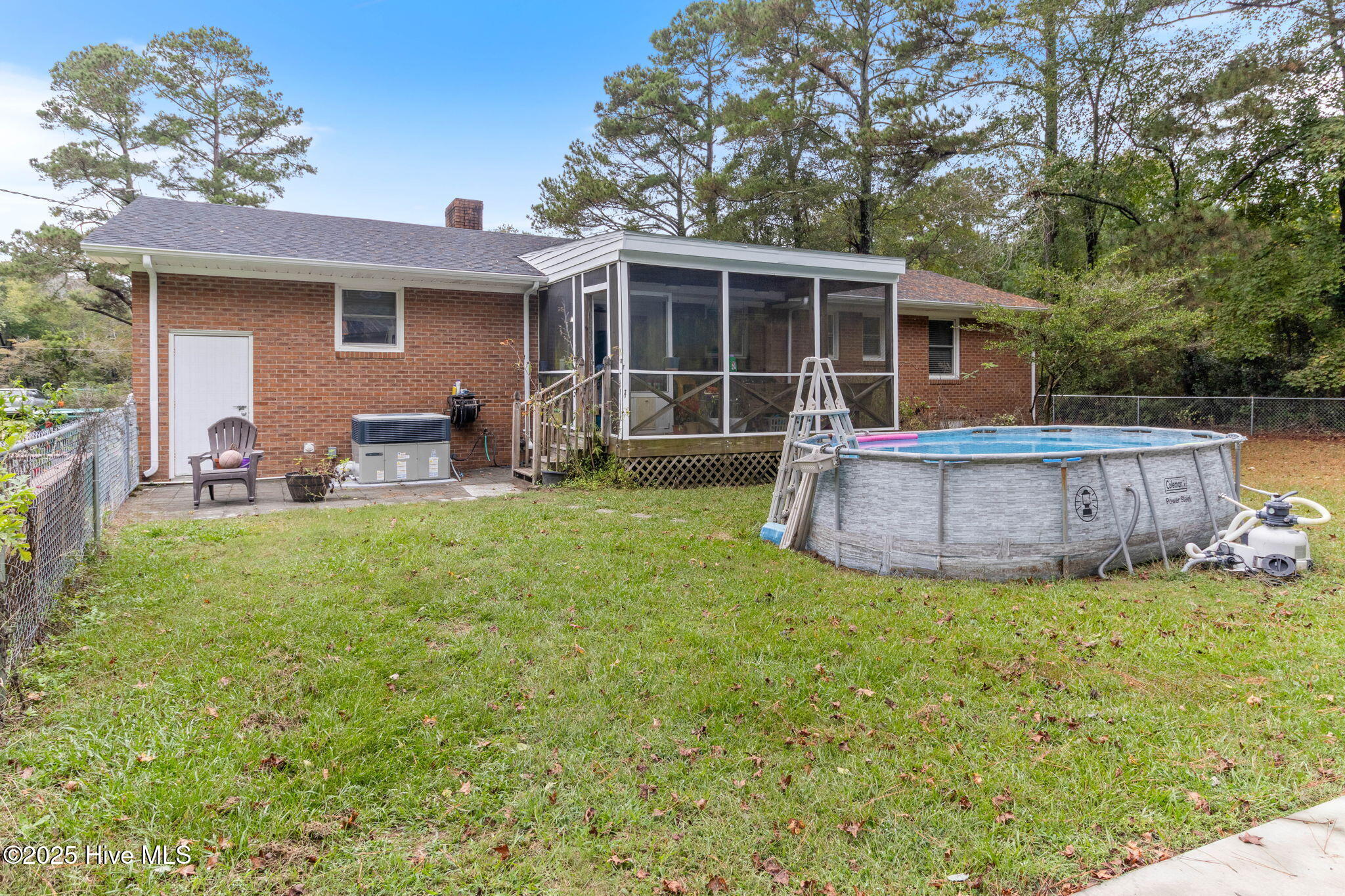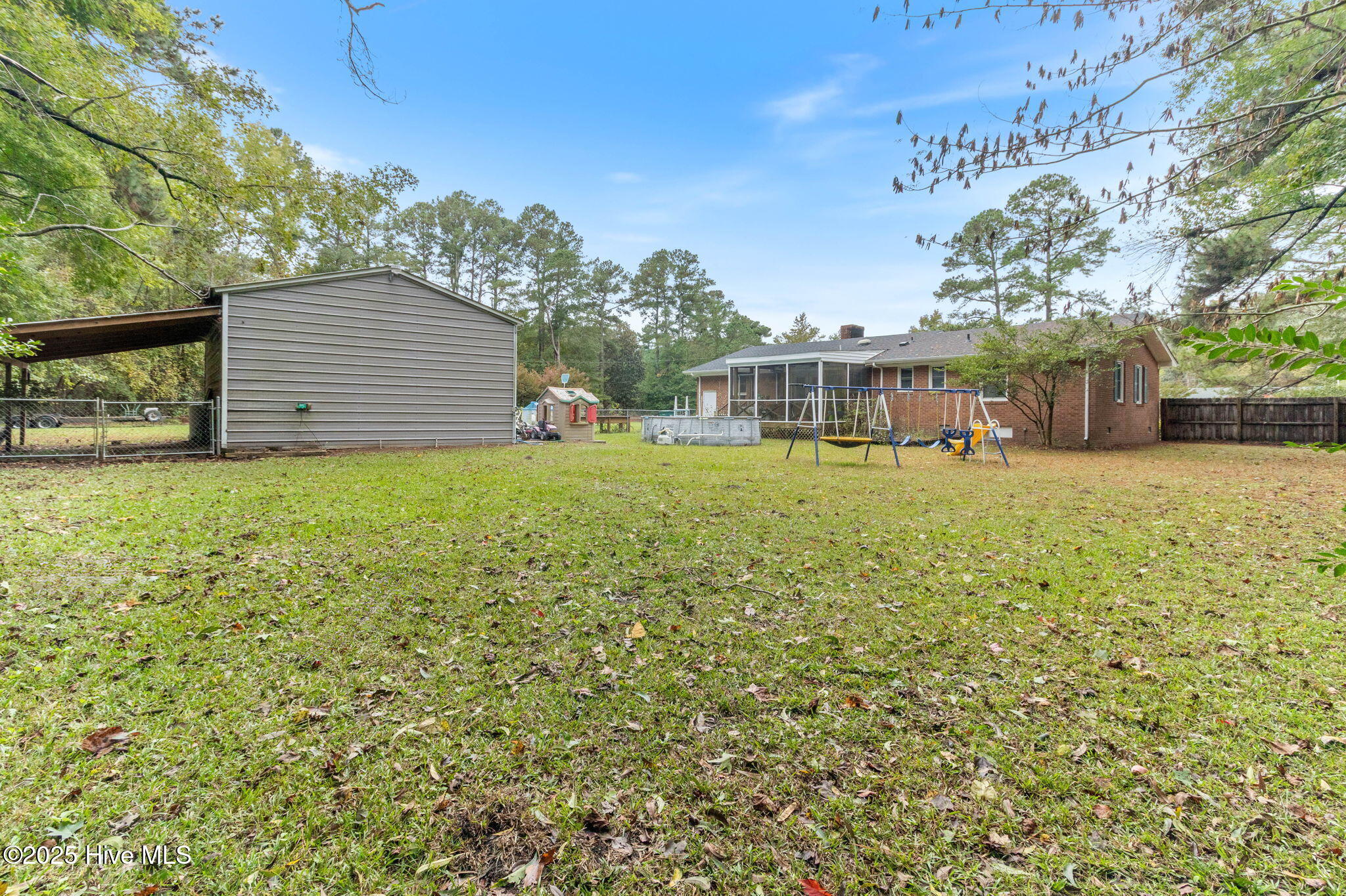 Welcome home to this lovely 3 bedroom, 2 full bathroom residence perfectly situated within the city limits on approximately one acre of land. You'll have peace of mind knowing the home features a newly installed roof and recently painted rooms throughout, offering a fresh, move-in-ready appeal. As you enter, you are greeted by a welcoming front living room. The home offers fantastic separate living spaces, including a large, cozy step-down den, ideal for entertaining or a relaxed movie night. A major convenience is the dedicated laundry room which includes a utility sink. Enjoy the outdoors year-round from the comfortable screened-in porch. The fully fenced-in backyard is your private oasis, featuring a refreshing above-ground pool for summer fun. A major bonus is the substantial 24' x 25' metal building! This workshop includes electricity and a convenient lean-to for additional covered storage, offering endless possibilities for a workshop, hobbies, or extra vehicle/equipment storage. With a great layout, peace-of-mind upgrades, and fantastic outdoor amenities on a generous lot, this home offers convenience, comfort, and spaceāall within the city!