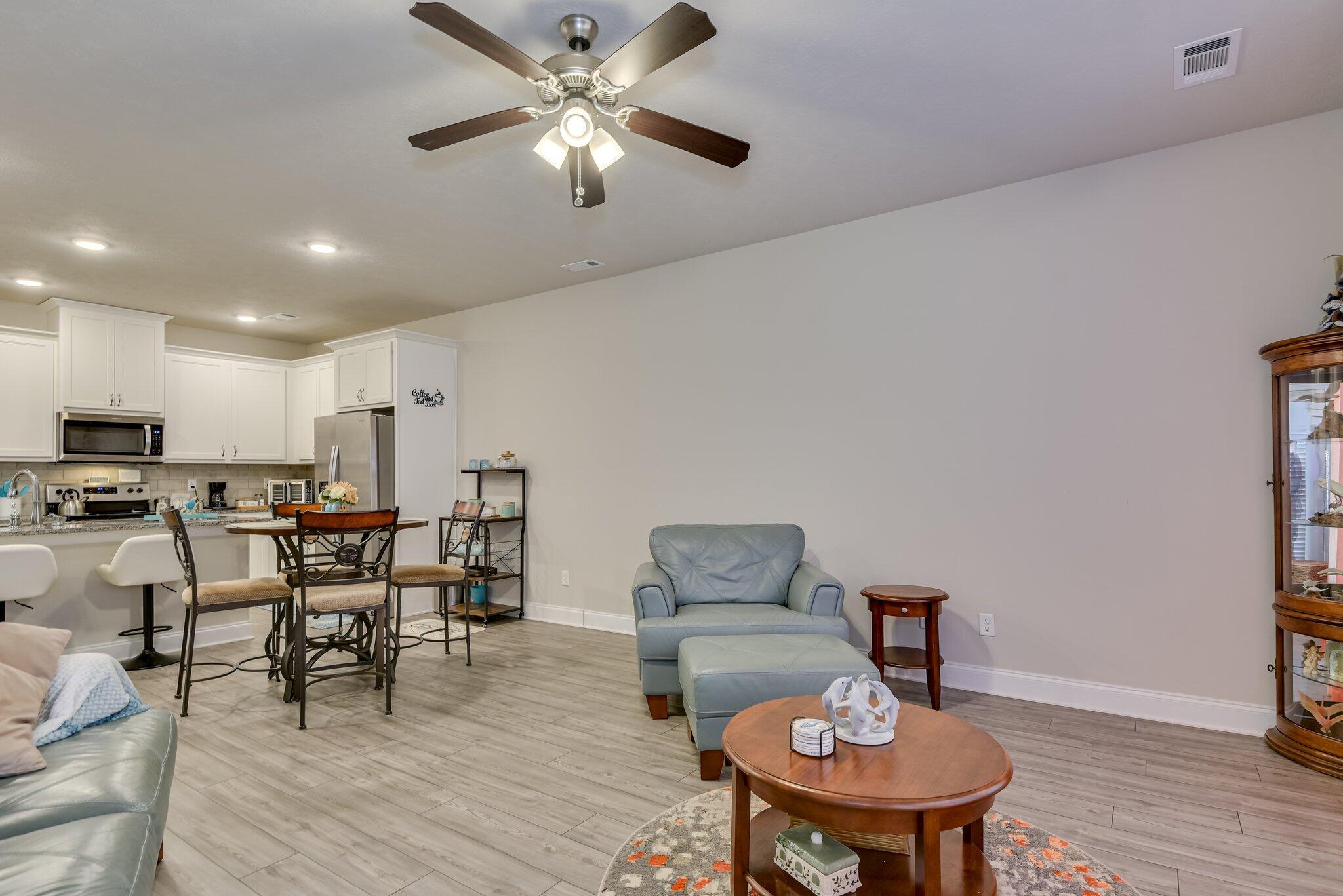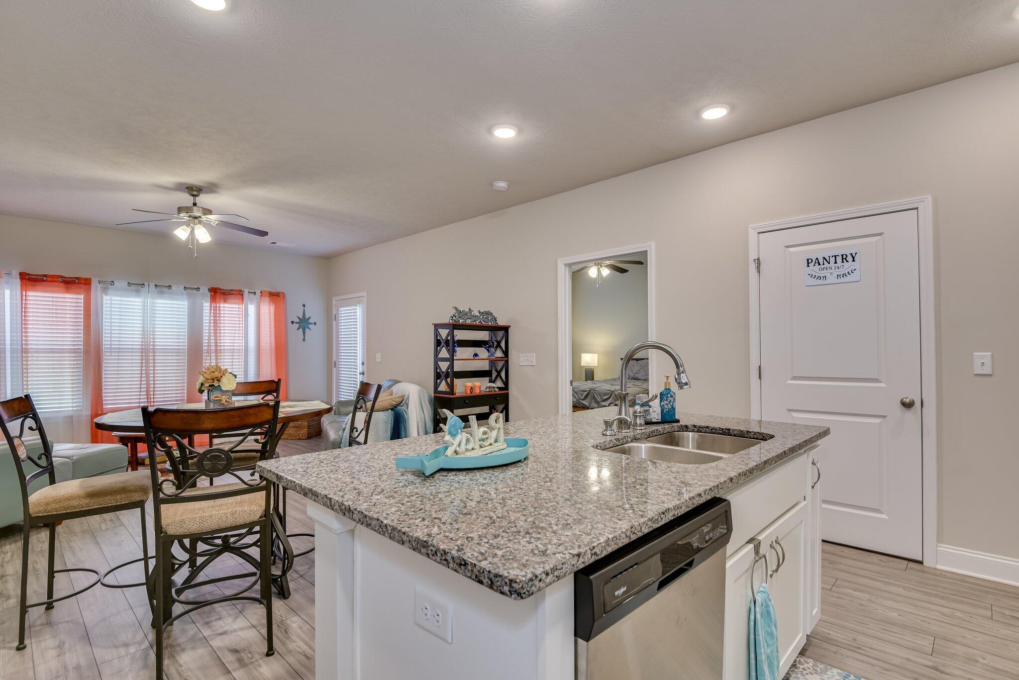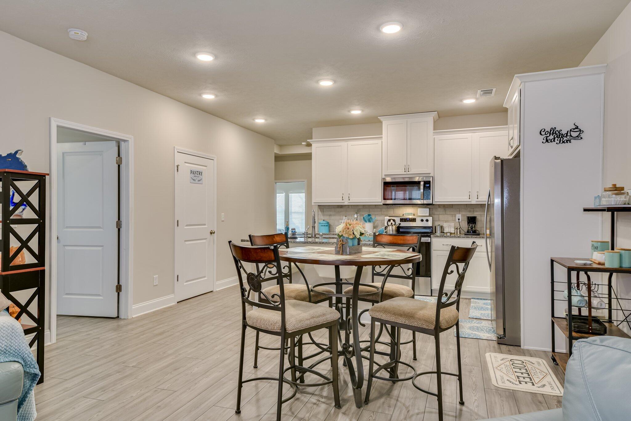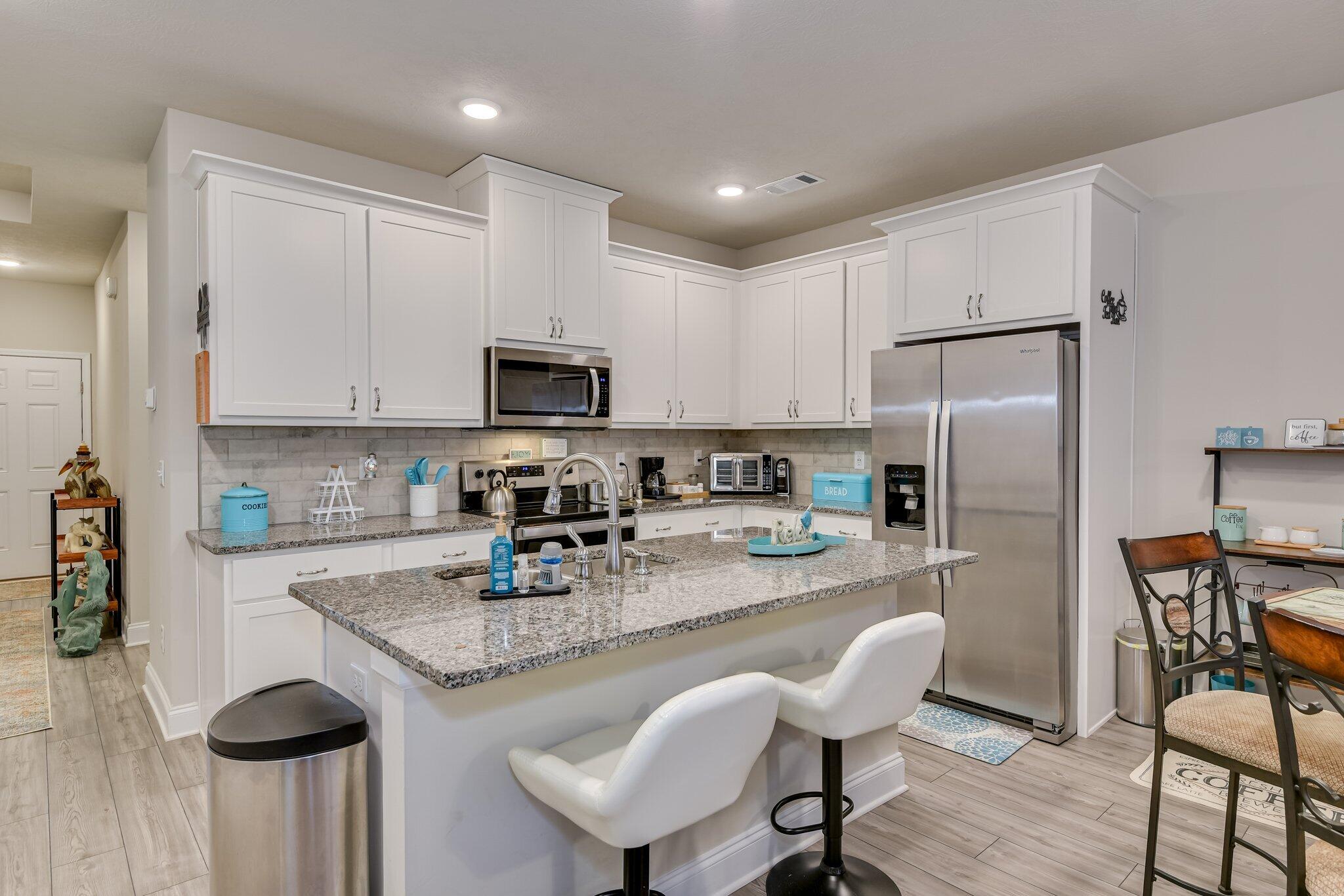 This beautiful 2-bedroom, 2-bathroom townhome is ideally located just minutes from the heart of Grovetown. Designed with comfort and convenience in mind, the home features a spacious open floorplan that enhances both flow and functionality. A welcoming front porch provides the perfect spot for relaxing, offering plenty of room for classic rocking-chair enjoyment. The main living areas are highlighted by stunning vinyl flooring. The secondary bedroom, situated at the front of the home, includes carpet and a generous closet. Adjacent is the second full bathroom, complete with tile flooring, a granite-topped single vanity, and a tub/shower combination. The laundry room is conveniently located off the foyer. The open kitchen boasts granite countertops, a built-in dishwasher, microwave, electric range, and a large island with a split sink and bar seating. An inviting eat-in café sits just off the kitchen, ideal for casual dining. The spacious living room overlooks the backyard and offers an ideal setting for relaxation or entertainment. The primary suite, located just off the main living area, features carpet flooring, a well-appointed bathroom with a granite single vanity, a walk-in shower, and a large walk-in closet. A covered back patio provides a peaceful outdoor retreat. Schedule your showing today!