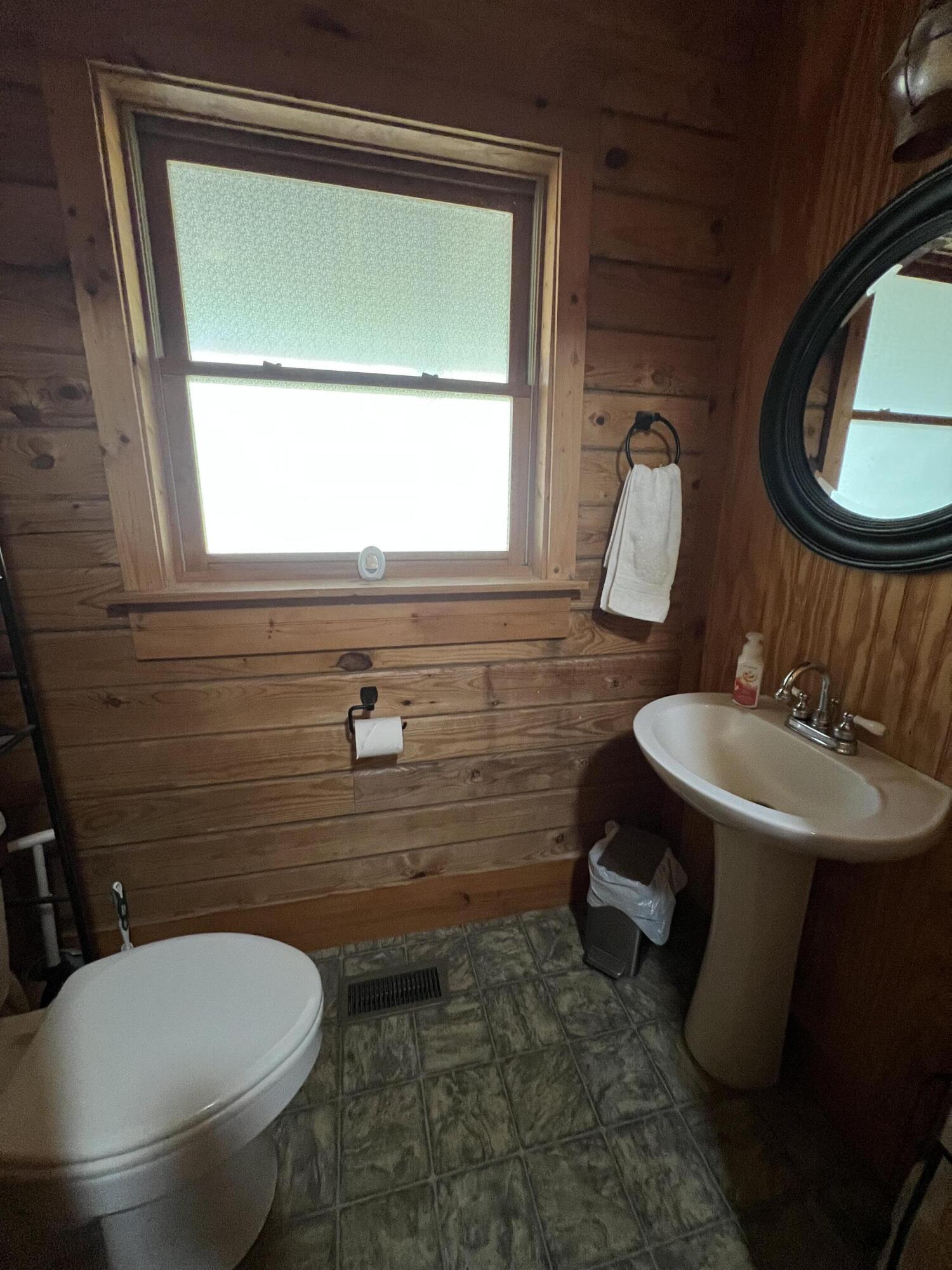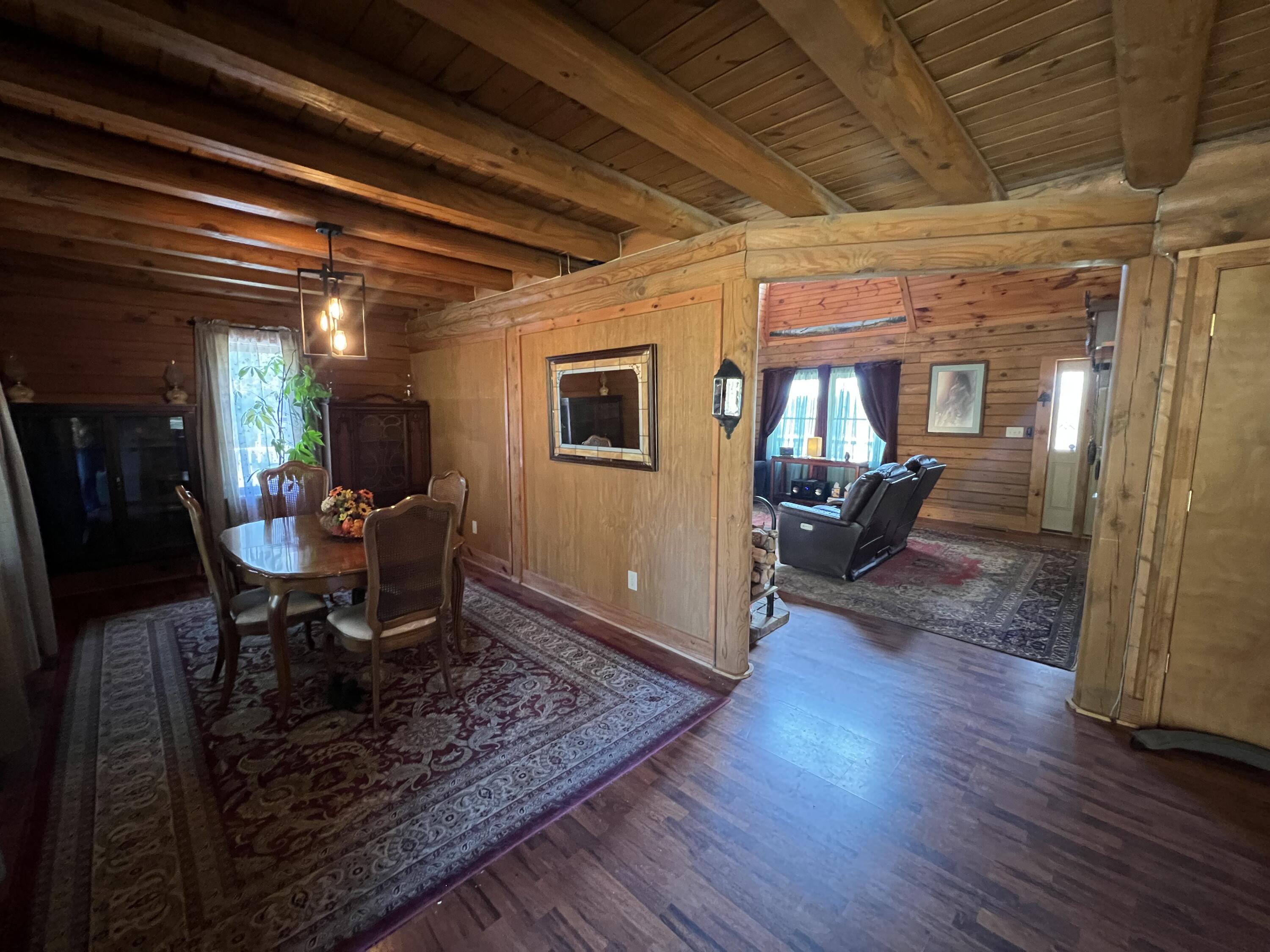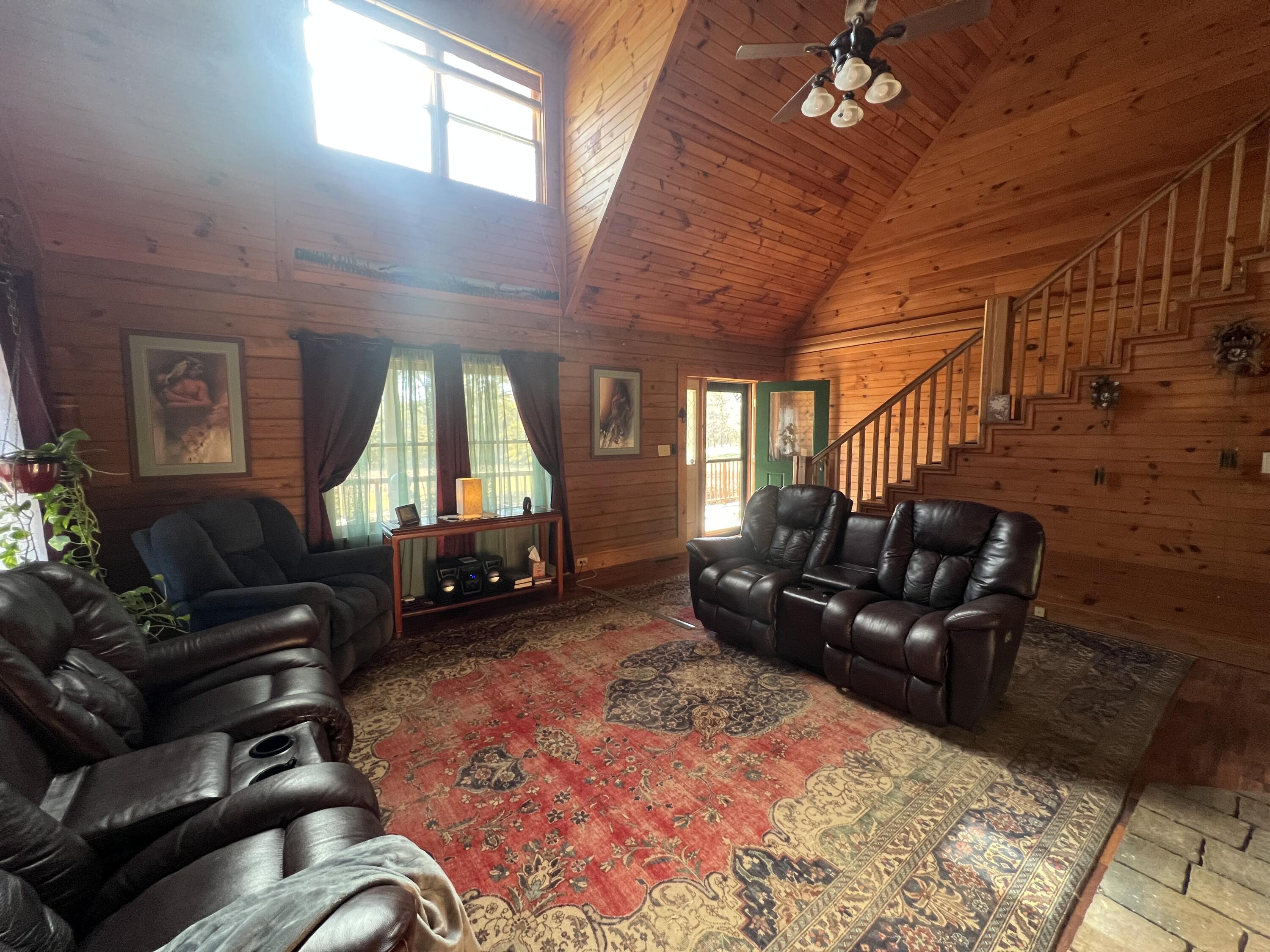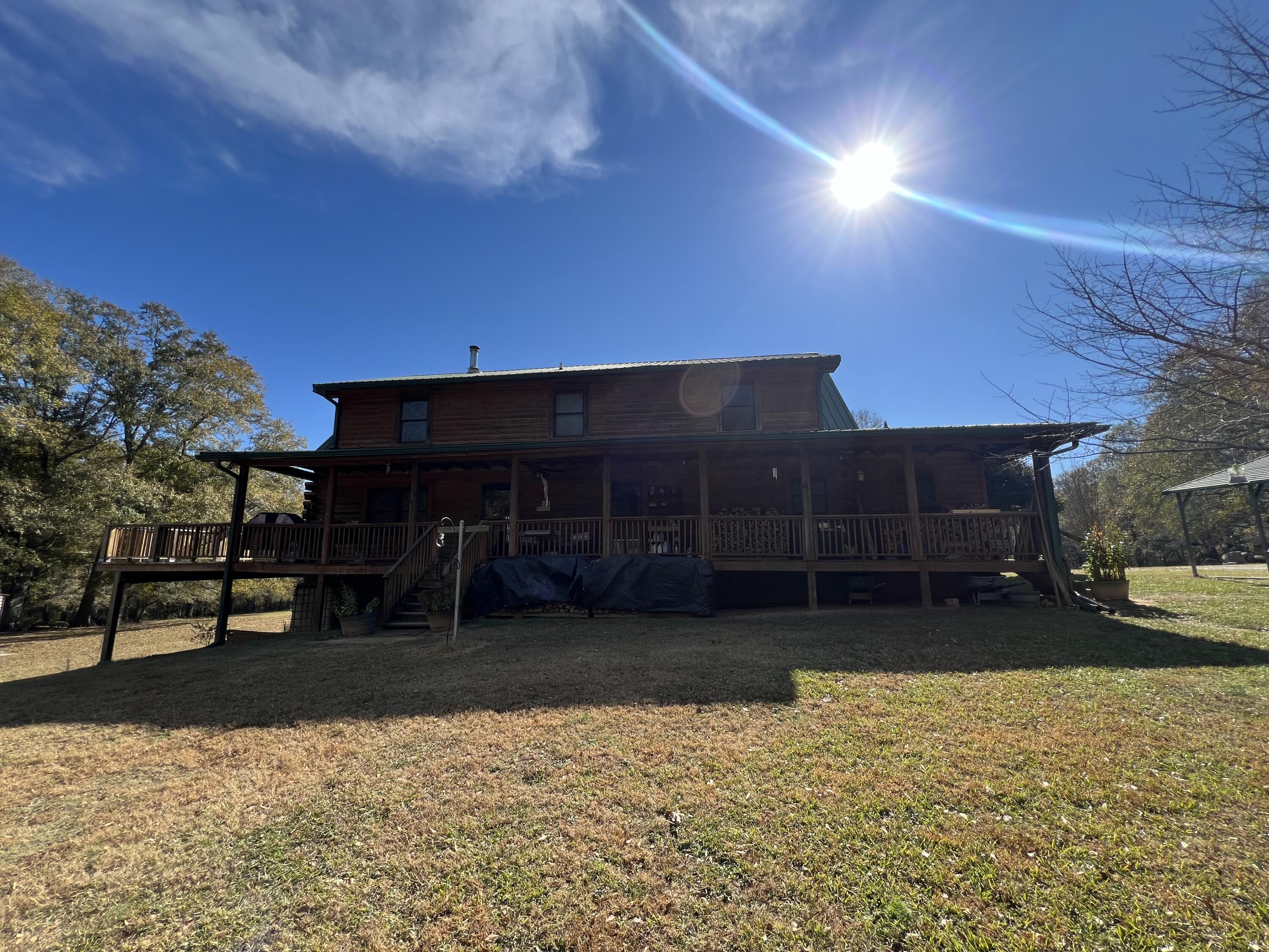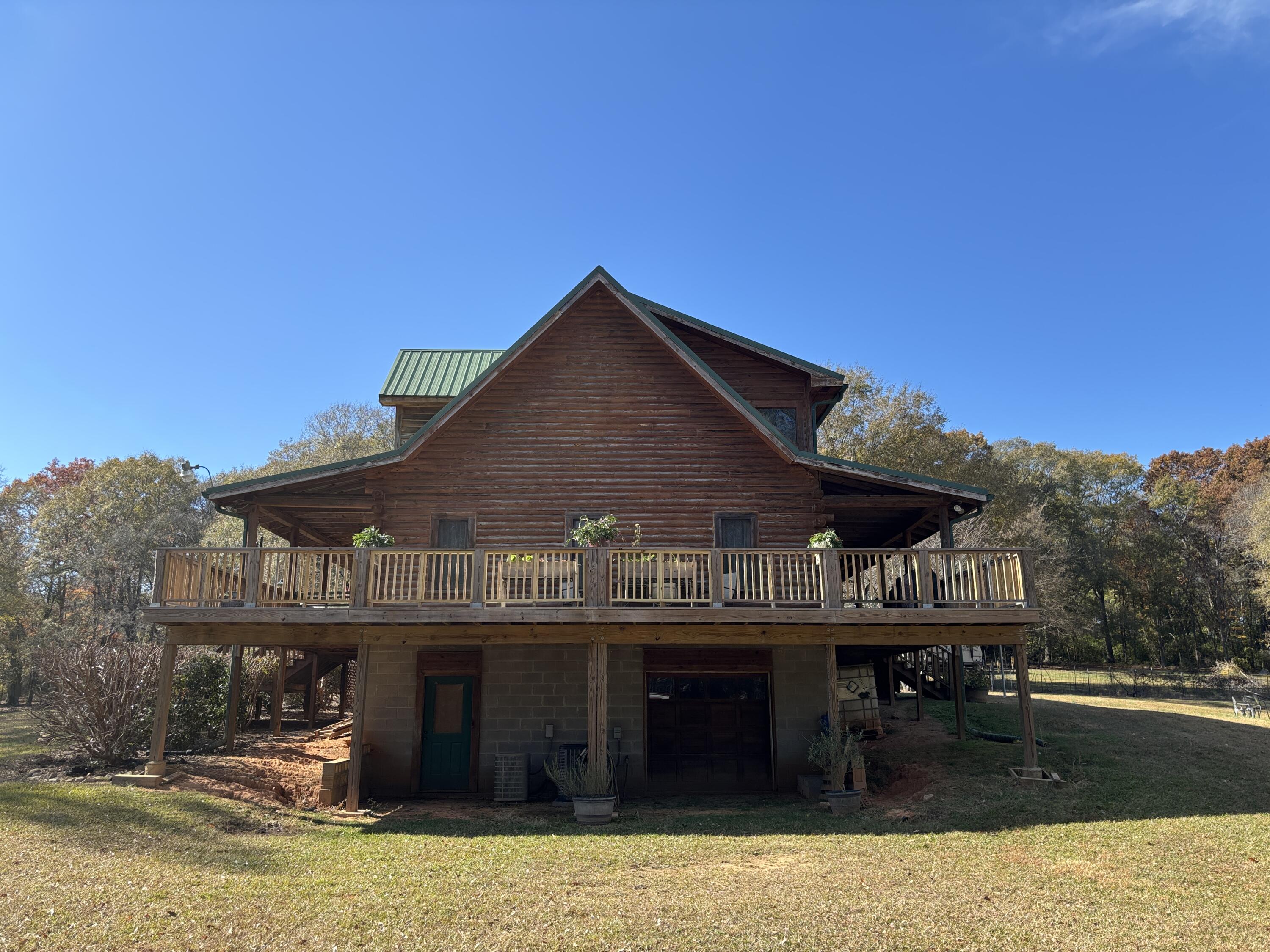 Welcome to your private slice of paradise! Nestled on just over 12 serene acres, this stunning 2,900 sq. ft. traditional log cabin offers the perfect blend of rustic charm and modern comfort. Step into the inviting living room, complete with soaring ceilings and a cozy wood-burning stove, ideal for chilly evenings. The open-concept dining area flows seamlessly into a well-appointed kitchen featuring abundant cabinetry, generous counter space, a breakfast bar, and two spacious pantries. The main-level owner's suite is a true retreat, boasting a luxurious ensuite bath with a jacuzzi tub, walk-in shower, large vanity, and private water closet. Convenience meets functionality with a side-entry mudroom connected to the laundry room and a handy half bath. Upstairs, a loft overlooks the living room and leads to three additional bedrooms and a full bath—perfect for family or guests. The heated basement offers over 1,500 sq. ft. of potential, ready to be finished to suit your needs. Enjoy peaceful mornings and relaxing evenings on the wraparound porch, surrounded by nature's beauty. The property also includes a detached garage/workshop with 200-amp service, a chicken coop with electricity, and a flourishing garden area with muscadines, blackberries, grapes, and a variety of fruit trees scattered throughout the property. Despite its tranquil rural setting, the property is equipped with high-speed fiber optic internet—ideal for remote work, streaming, or staying connected with ease. This one-of-a-kind property offers space, privacy, and endless possibilities—don't miss your chance to make it yours!