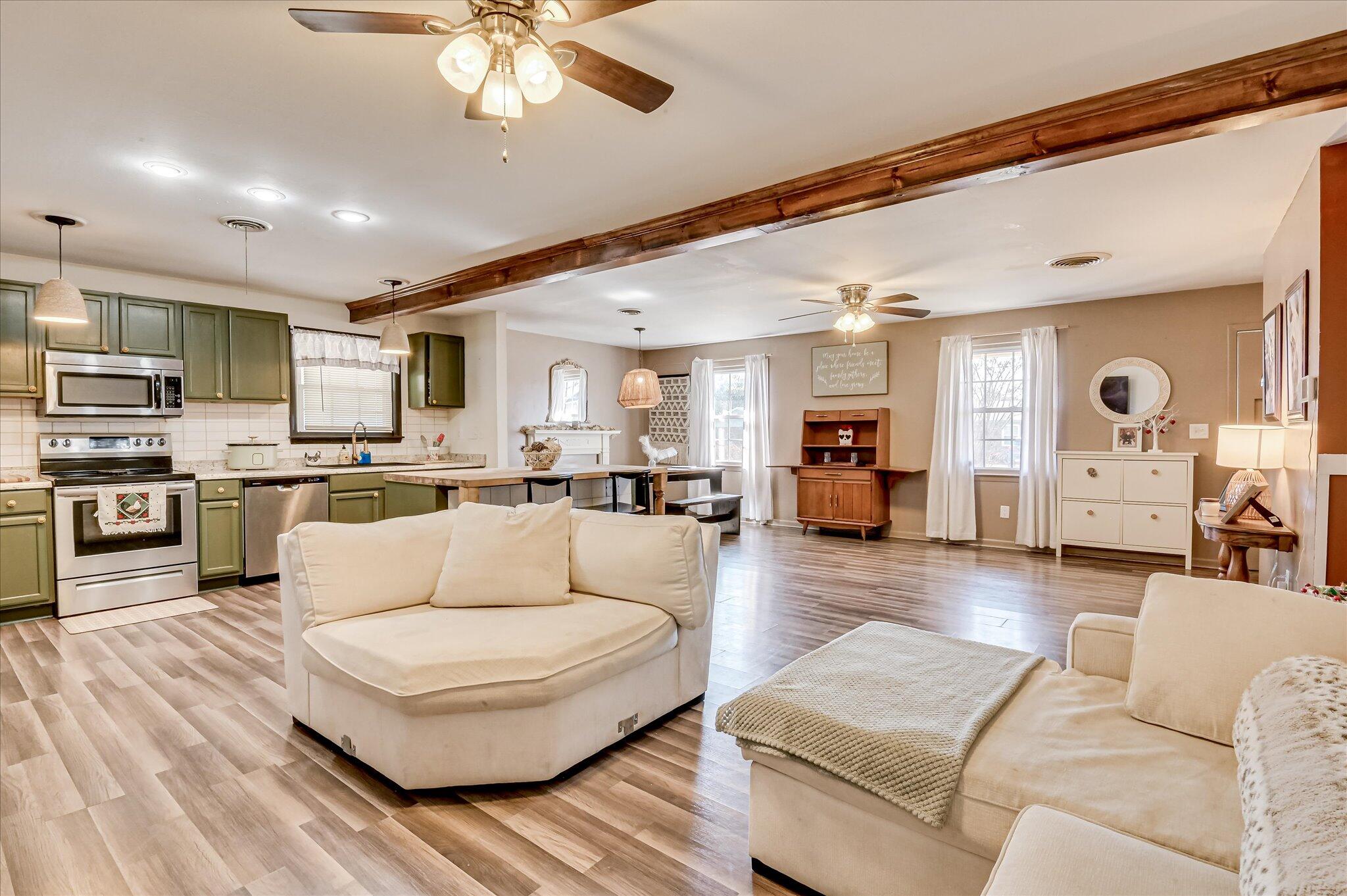This beautifully refreshed brick ranch-style home offers 3 bedrooms and 2 full bathrooms, thoughtfully open designed to blend comfort, functionality, and inviting charm. Recent upgrades include a newer roof, a young HVAC system, and sleek stainless-steel appliances. Both bathrooms feature tile flooring, while the owner's suite boasts an oversized, fully tiled shower that adds a spa-like touch. The updated kitchen shines with tasteful renovations, highlighted by an all-wood countertop island that brings warmth, character, and additional prep space. A spacious, light-filled sunroom provides versatile year-round living, perfect for a home office, playroom, or hobby space. Step outside to the covered front porch before heading into a backyard built for entertaining, complete with a fire pit, surrounding privacy fencing, and a storage shed. Additional highlights include an attached carport and concrete parking pad. SOLD AS IS.