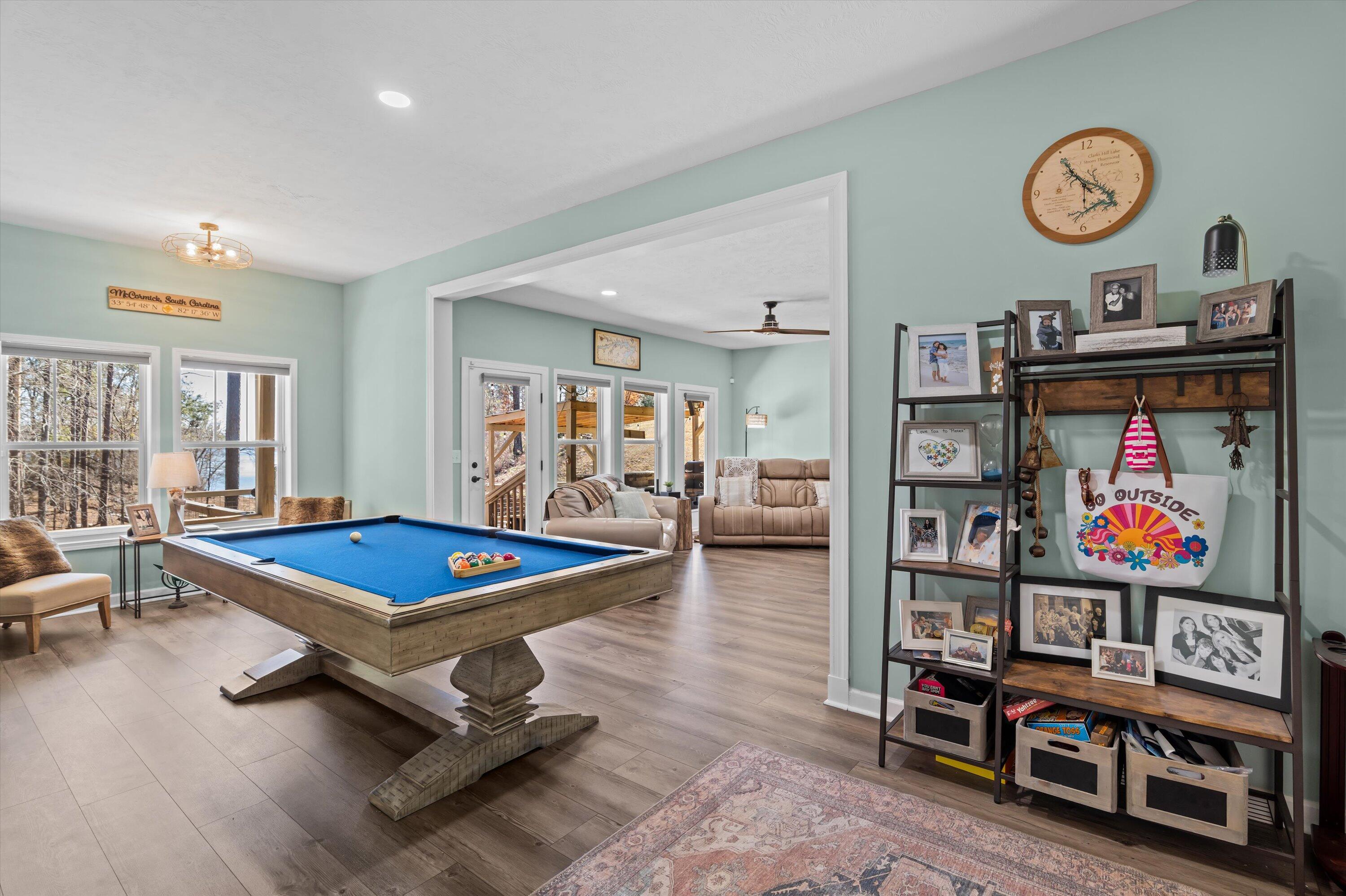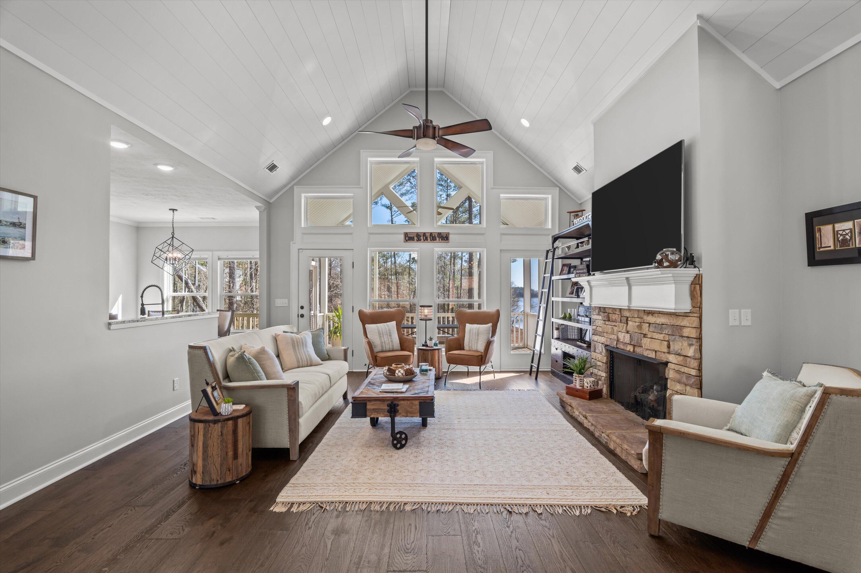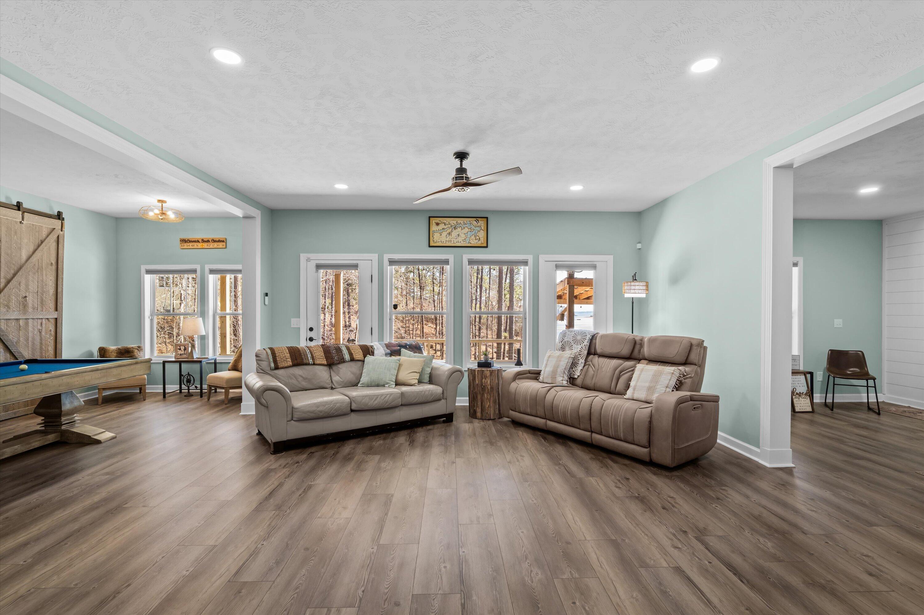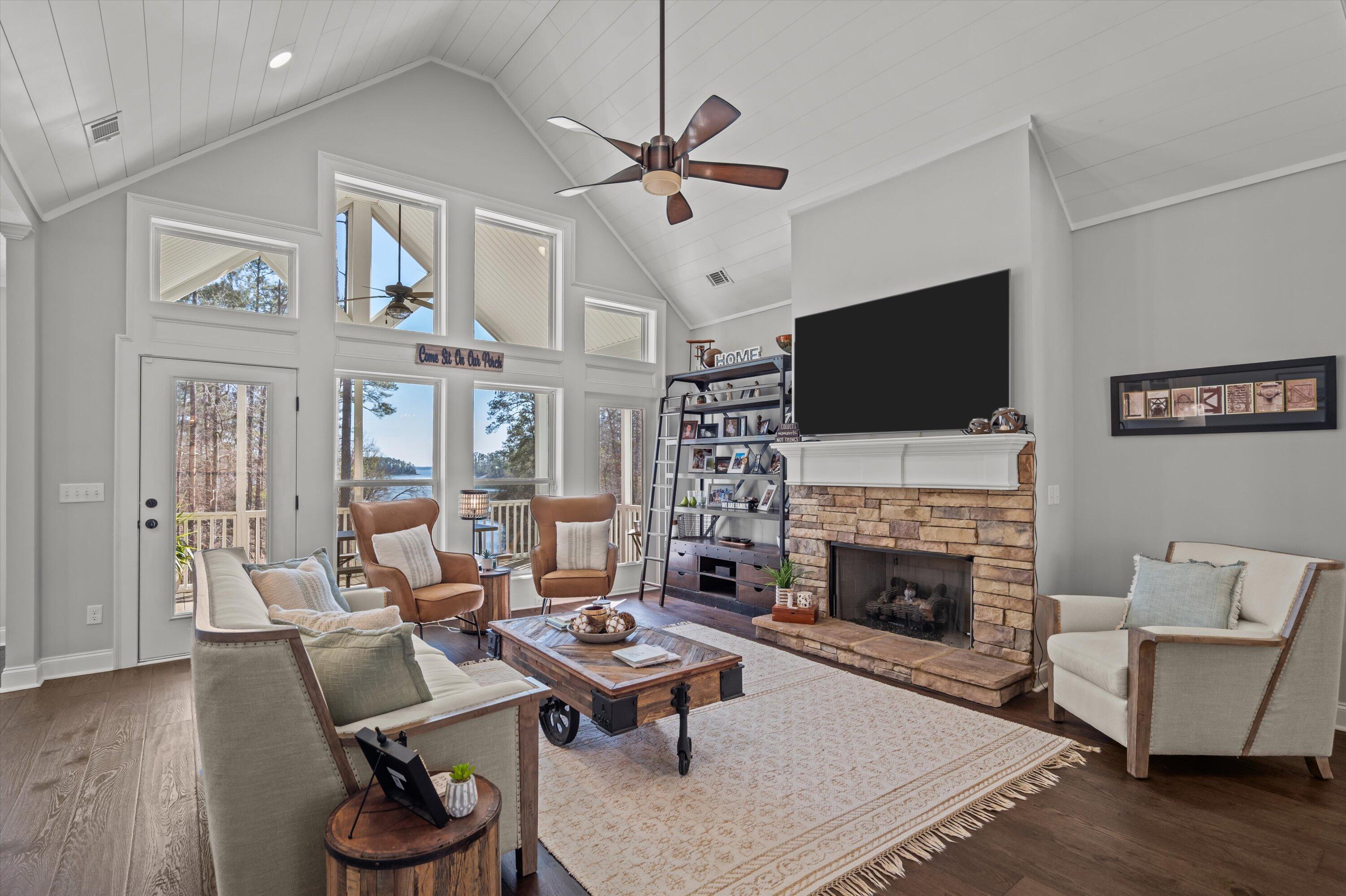 STUNNING LAKE FRONT HOME with PRIVATE DOCK and BOAT PARKING Nestled on a one-acre lot in a hidden cove, this 3,500-square-foot lakefront home offers unparalleled tranquility and breathtaking views of the Savannah River at the mouth of Carolina's Little River. The main level features a spacious open floor plan with engineered hardwood floors, a great room with vaulted ceilings, a cozy fireplace, and expansive windows framing the stunning lake views. The gourmet kitchen is a chef's dream, featuring granite countertops, stainless steel appliances, double ovens, and shaker-style cabinets. It seamlessly connects to a breakfast nook and a dining area, leading out to a large screened porch and a vaulted ceiling rear deck. The owner's suite includes private deck access, a luxurious en-suite bath with double vanities, a large glass shower, a soaking tub, and a walk-in closet filled with natural light. The main level also includes two additional bedrooms and a full bath, along with a convenient laundry room adjacent to the kitchen and pantry. Descend to the lower level, designed for entertainment and extended living. This level features a billiard room, a massive entertainment room with a 98-inch TV, theater seating, and a large wet bar. The fully furnished lower-level kitchen is complete with a stove/range combination, microwave, stainless steel sink, dishwasher, and ample cabinet space, Corian countertops and a massive walk-in pantry with double refrigerators and bakers shelving. A large 4th bedroom and a private office that can serve as a fifth bedroom as well as a full bath with large walk-in shower. Just mere steps away from the home, you'll find a private dock complete with a boat slip, offering easy access to the water for boating and leisurely activities. Step outside to a 500-square-foot covered patio with ceiling fans and a flat-screen TV, leading to a 240-square-foot covered outdoor kitchen and bar area, perfect for al fresco dining. Adjacent to the patio is a 340-square-foot deck, ideal for soaking up the sun or stargazing at night. This exceptional home combines luxury, comfort, and natural beauty, offering the perfect blend of family living and entertainment.