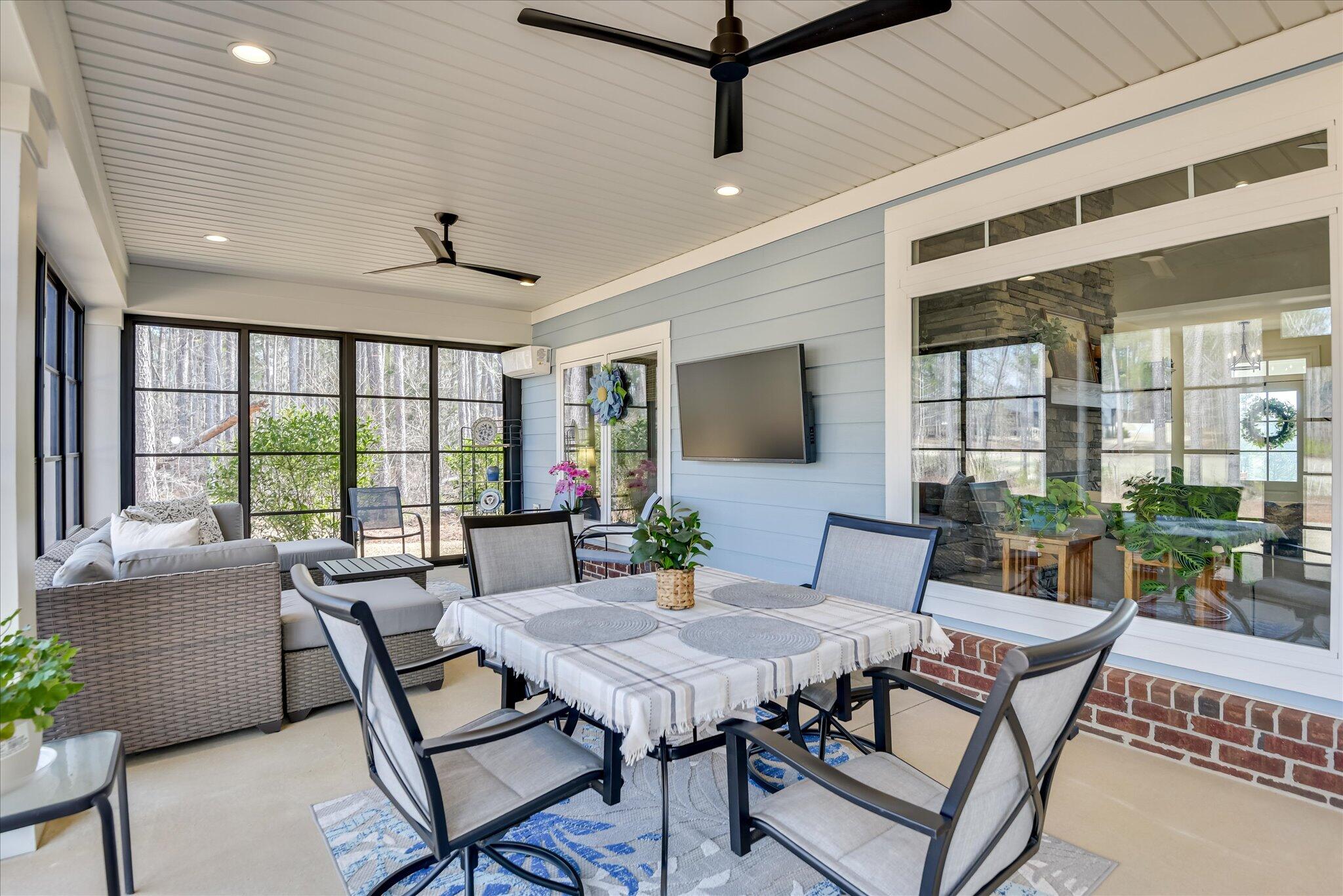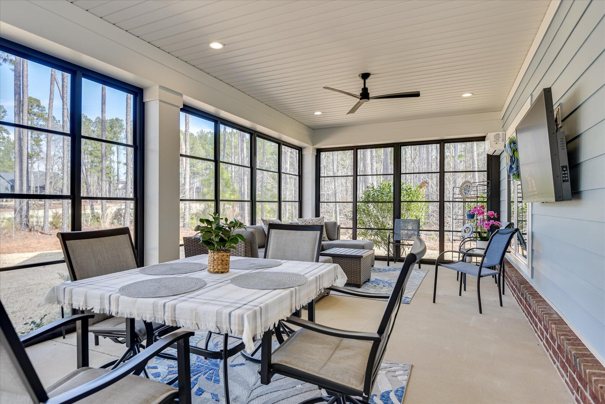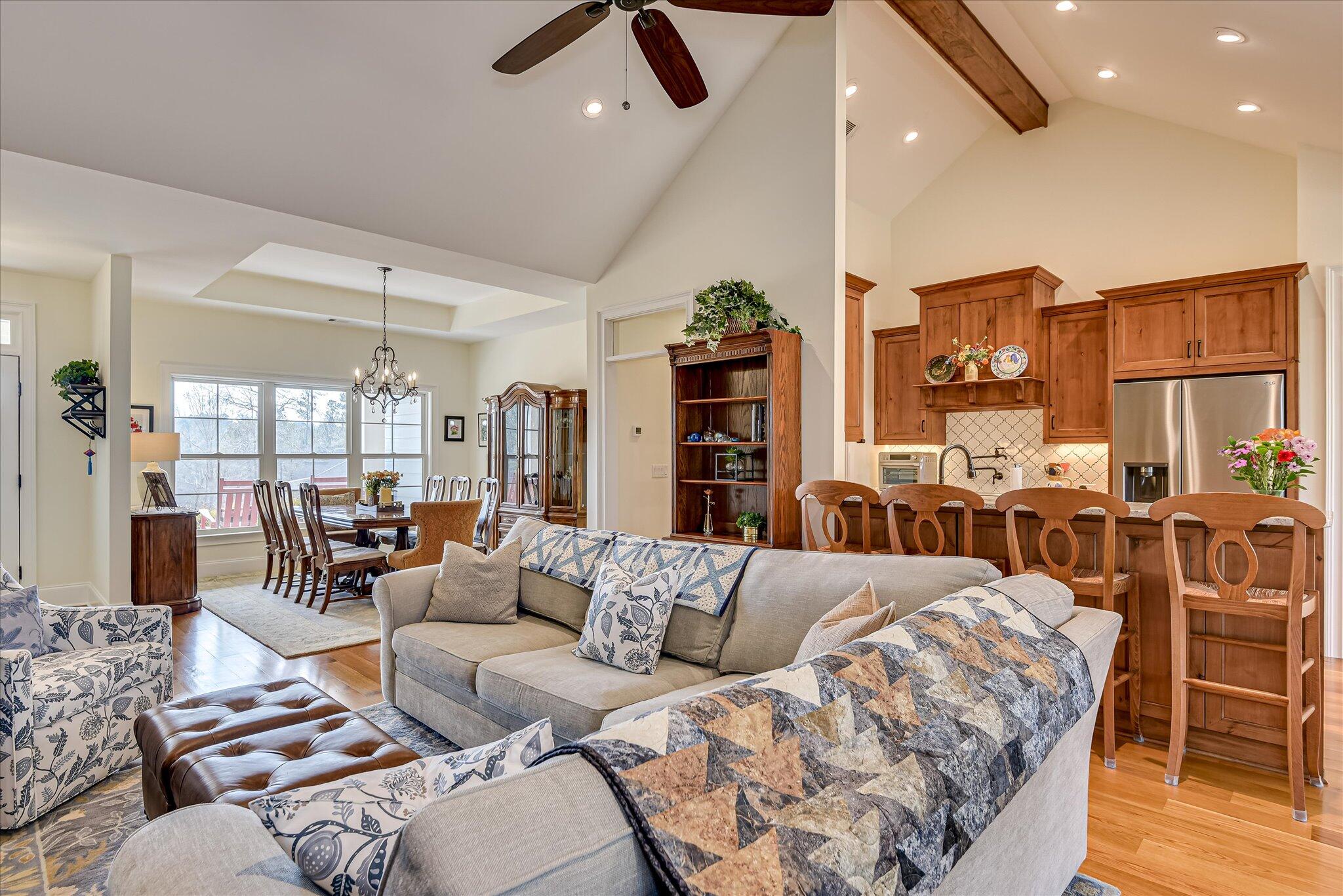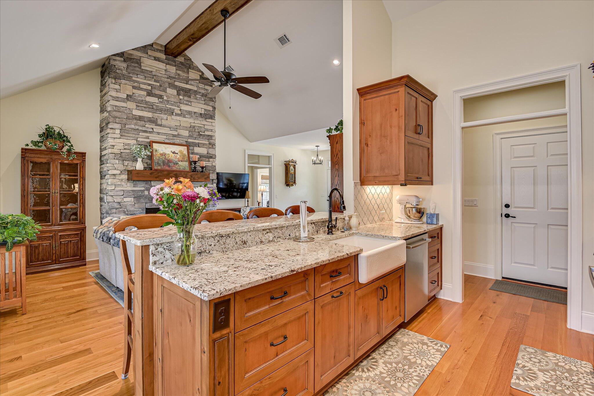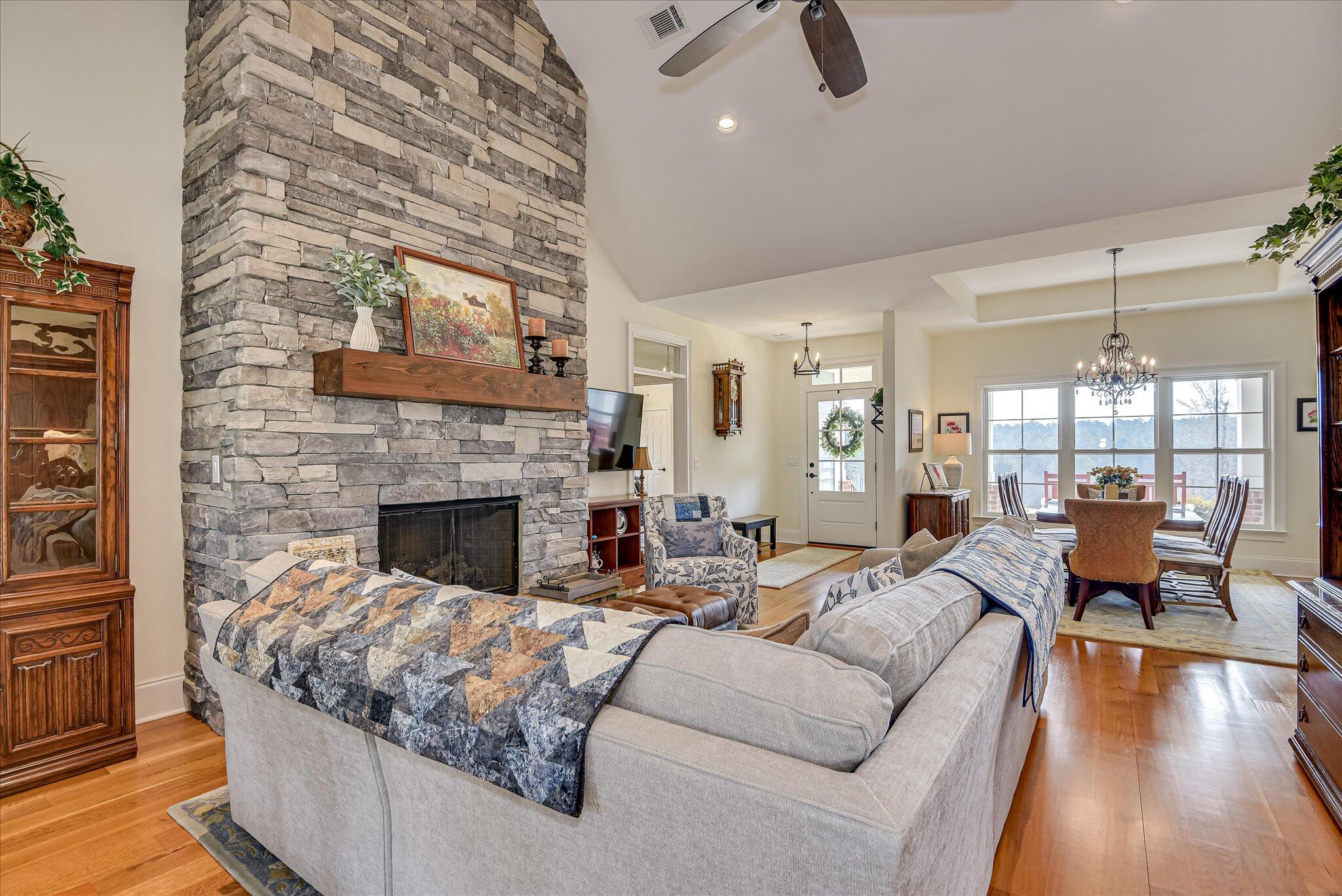 Located in the sought-after golf course community of Mt. Vintage and built by one of the area's premier custom builders, this exceptional home offers stunning golf course views from both the front and back of the property, overlooking the signature 8th hole and 7th fairway of the Independent Golf Course. The covered front porch is the perfect spot to enjoy your morning coffee while taking in the scenic surroundings. Inside, the main level features custom wide-plank wood flooring throughout, a spacious family room with a floor-to-ceiling stacked stone gas fireplace, raised hearth, and wood mantle, and a beautifully appointed kitchen with custom knotty alder stained cabinetry, granite countertops, Kohler farmhouse sink, pot filler, custom wood hood, Bosch glass cooktop and oven, Bosch dishwasher, microwave cabinet, and LG refrigerator. The laundry room is equally impressive with Kohler sink, custom cabinetry, and stylish hexagon tile flooring. The primary suite offers a peaceful retreat with a bay window overlooking the woods and golf course, a custom walk-in closet, and a luxurious bath featuring a Kohler jetted tub, double sinks, and linen cabinet. Wood stairs lead to a versatile bonus room complete with roller shades, three storage closets, and a full bathroom. Enjoy year-round comfort in the enclosed 3-season room with mini-split heating and cooling--ideal for additional living and dining space while watching golfers pass by. Additional highlights include a top-of-the-line Rheem heat pump and air conditioning system, Rinnai tankless water heater, 21 owned solar panels (no lease), and a dedicated outlet for electric vehicle charging.