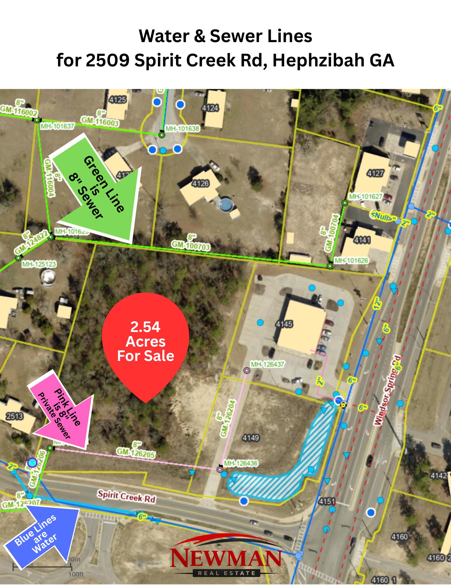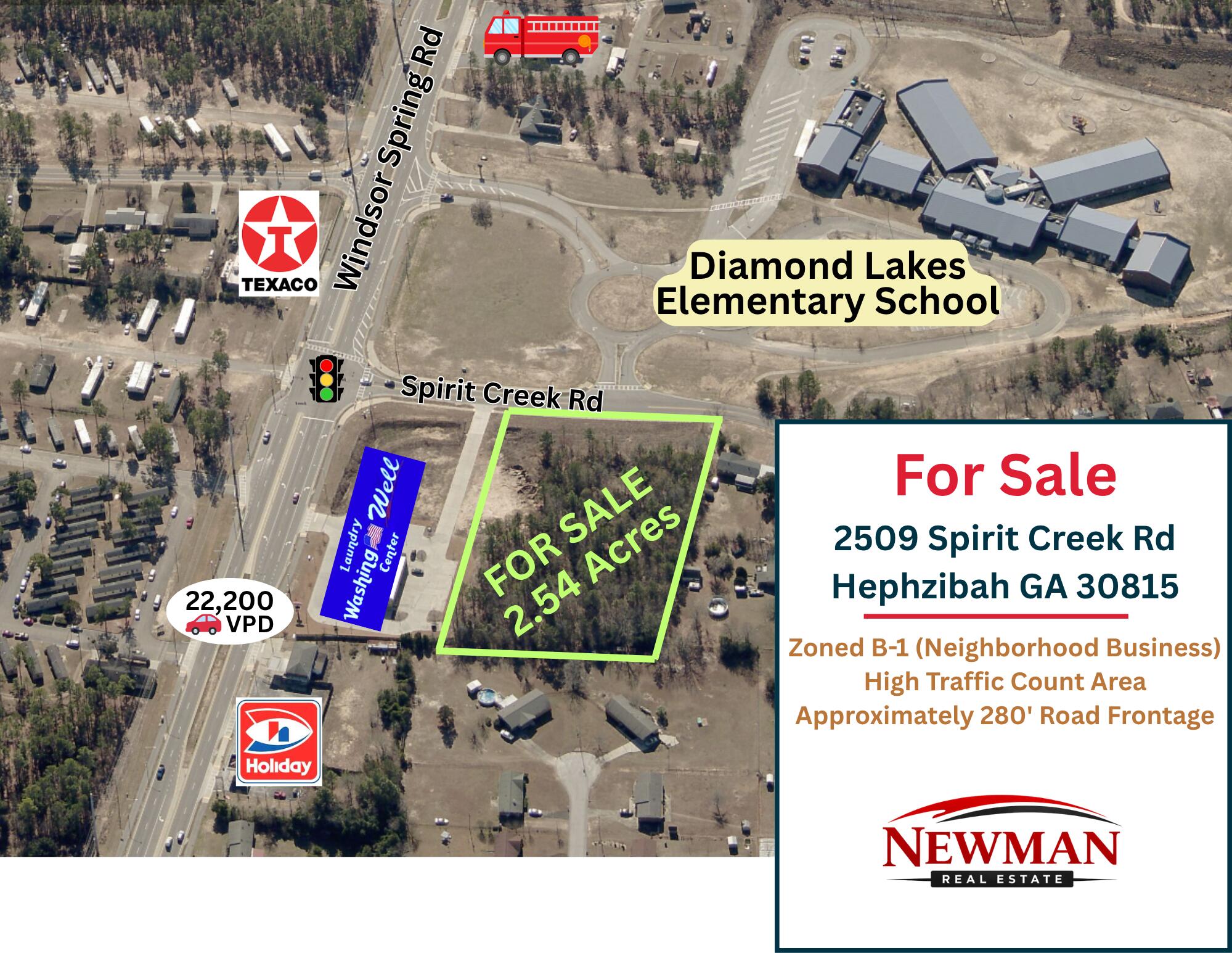 Newman Real Estate is proud to offer this beautiful 2.54 acre parcel well located in south Augusta just off highly traveled Windsor Spring Road. This lot offers all utilities and would be easy to develop into any commercial venture that fits into B-1 (neighborhood business) zoning. Fronting the property on Windsor Spring Road is a coin operated laundry. The property sits right across the street from Diamond Lakes Elementary School and might be ideal for a children's day care facility. Just a few hundred yards up Windsor Spring Road is the intersection with Tobacco Road, which is a very high visibility section of south Augusta. Fort Eisenhower/Gordon is only four miles away as is Augusta Regional Airport. With approximately 280' feet of frontage on Spirit Creek Drive the property offers excellent access. 2509 Spirit Creek Drive is just off Windsor Spring Road, directly across the street from Diamond Lakes Elementary School, in South Augusta. It is only one-half-mile from Tobacco Road and the Walmart Neighborhood Market and 4 miles from Fort Eisenhower. The area surrounding the property boasts a dynamic mixture of commercial and residential spaces, making it an ideal location for developers.