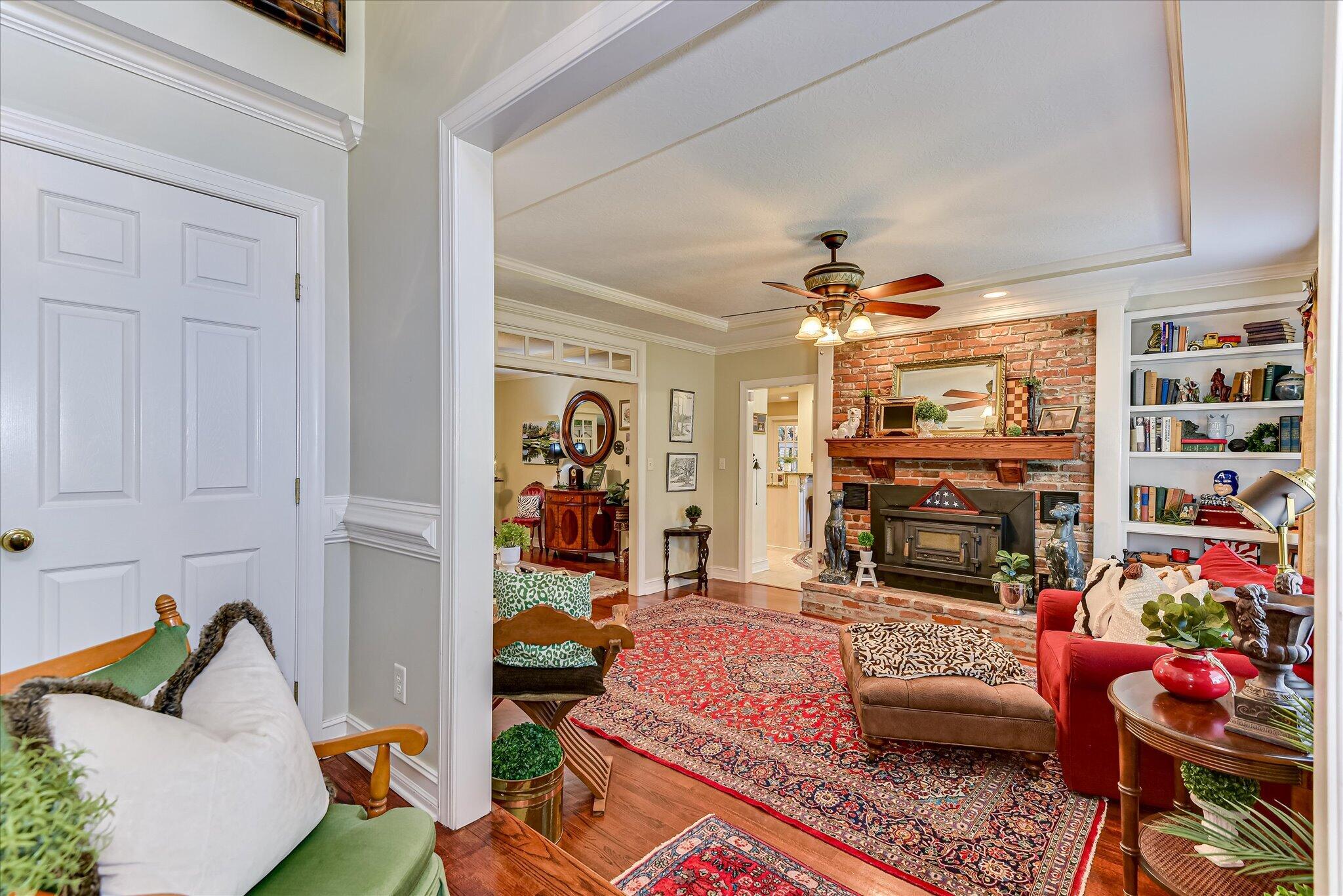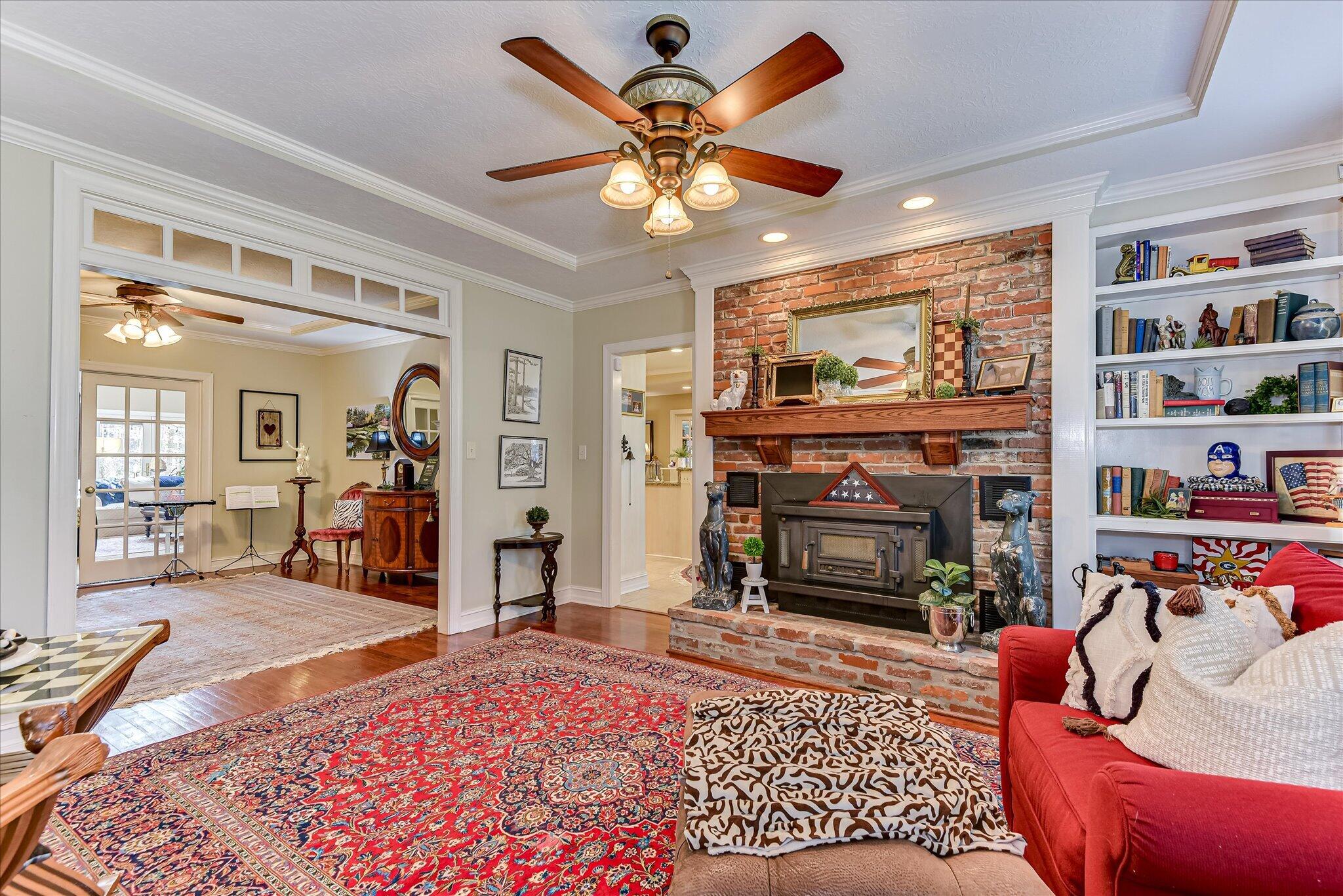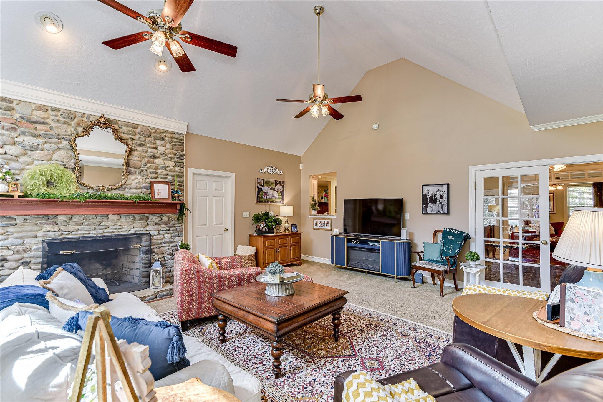 Welcome to this beautifully designed 6-bedroom, 4.5-bath custom home situated on a full acre at the end of a quiet cul-de-sac in Woodbridge. Enjoy the convenience of being just a short walk to neighborhood amenities including the pool, tennis courts, and park. From the moment you arrive, the long driveway, well-maintained landscaping, and inviting front porch create a warm welcome. Inside, the foyer opens to stunning hardwood floors that carry throughout the main living spaces. Just off the entry is a cozy sitting room featuring a masonry fireplace and custom built-in bookcases--perfect for relaxing or entertaining. The layout flows effortlessly into the main living areas, including a spacious great room with vaulted ceilings, plush carpeting, and a striking stone fireplace. The kitchen offers both style and function with new stainless steel appliances, granite countertops, a breakfast bar, and a convenient pass-through that leads to a butler's pantry and additional pantry. The bright breakfast area is filled with natural light from a large window. The main level includes the primary suite along with an additional bedroom. The primary suite features vaulted ceilings, a sitting area with a bay window, and a spacious ensuite bath complete with a garden tub, walk-in glass shower, and ample vanity space. Upstairs, you'll find four generously sized bedrooms. Two bedrooms include sitting areas, while the others feature unique built-in shelving with access to attic storage. All bedrooms offer custom walk-in closets. There is also a large climate-controlled storage room on this level, along with additional built-ins throughout the home. Out back, the private yard is ideal for entertaining or everyday living. The cabana creates the perfect setting for gatherings, complete with ceiling fans for warm summer days, and there's an additional storage shed for lawn equipment. This home offers space, character, and a layout designed for both comfort and functionality--all in a highly desirable community setting.