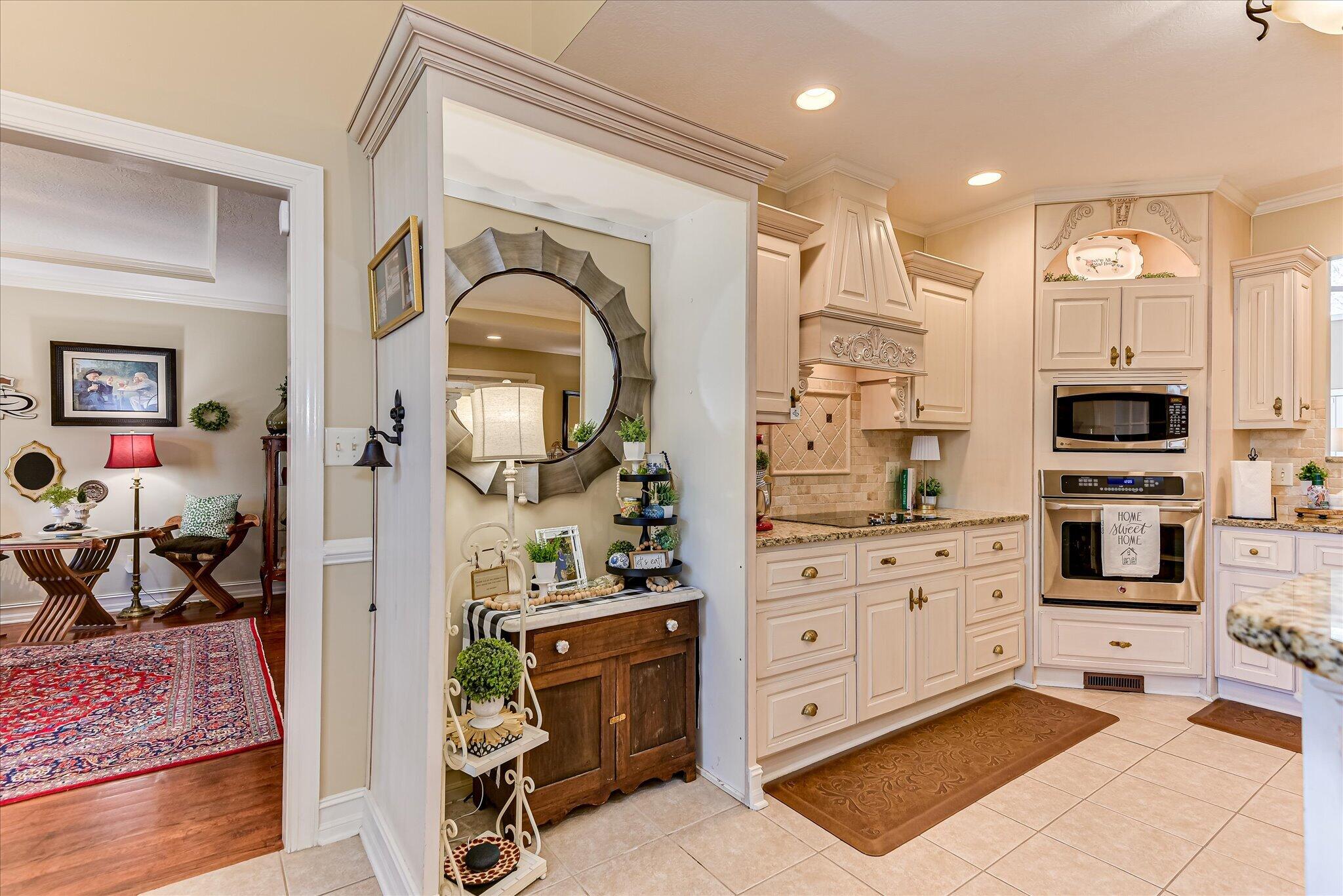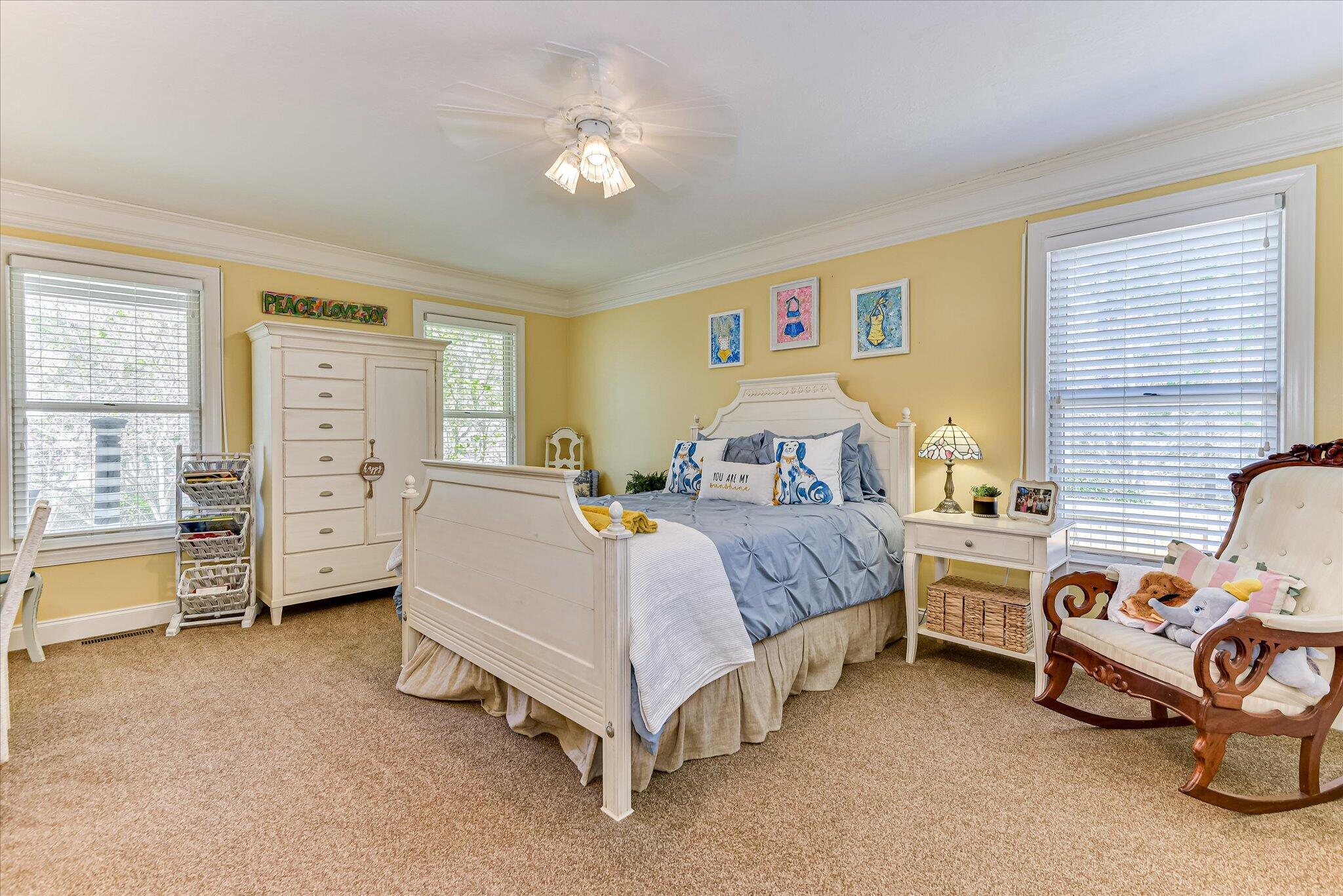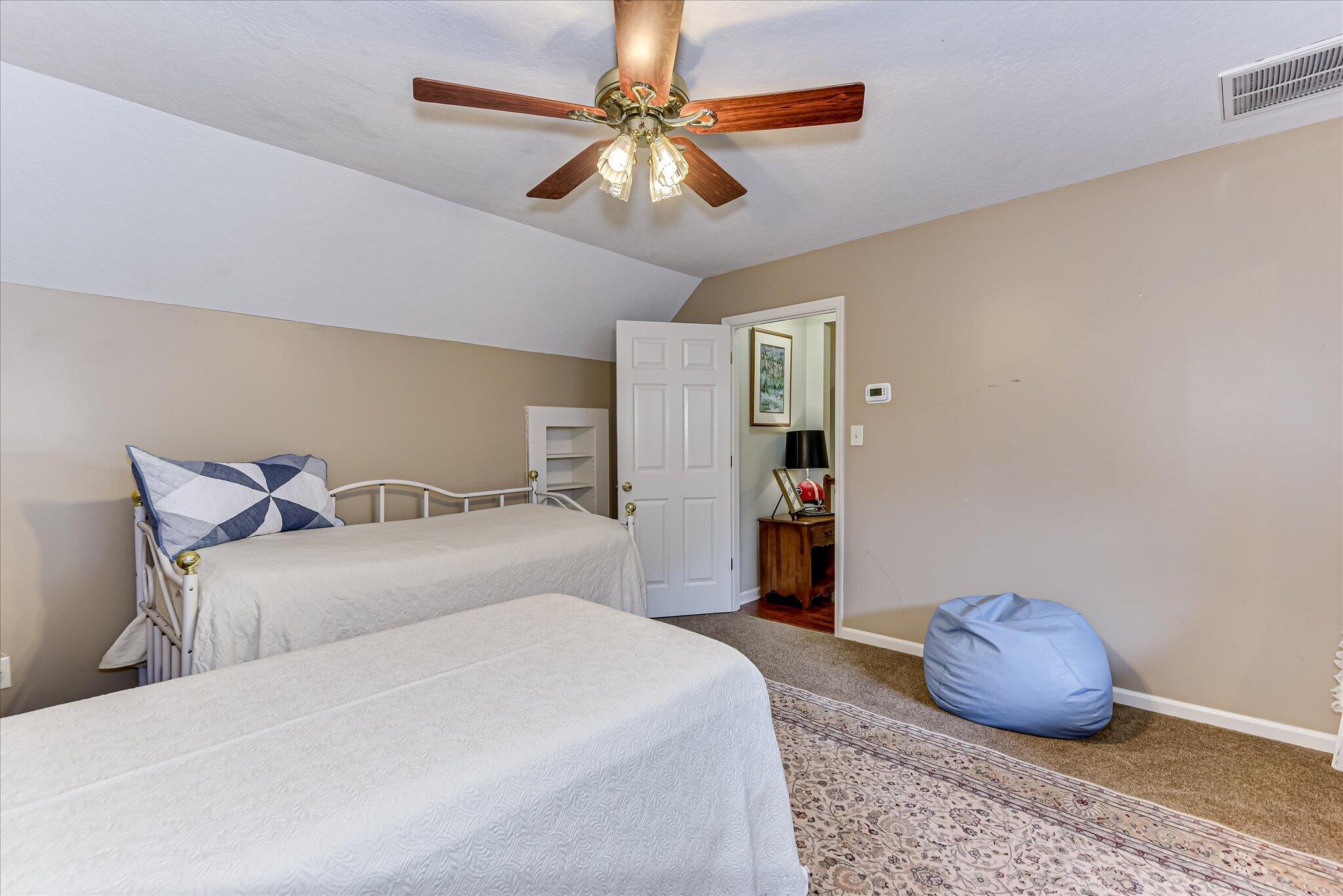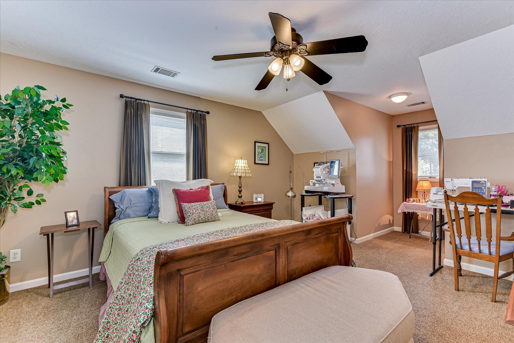 Welcome to this beautifully designed 6-bedroom, 4.5-bath custom home situated on a full acre at the end of a quiet cul-de-sac in Woodbridge. Enjoy the convenience of being just a short walk to neighborhood amenities including the pool, tennis courts, and park. From the moment you arrive, the long driveway, well-maintained landscaping, and inviting front porch create a warm welcome. Inside, the foyer opens to stunning hardwood floors that carry throughout the main living spaces. Just off the entry is a cozy sitting room featuring a masonry fireplace and custom built-in bookcases--perfect for relaxing or entertaining. The layout flows effortlessly into the main living areas, including a spacious great room with vaulted ceilings, plush carpeting, and a striking stone fireplace. The kitchen offers both style and function with new stainless steel appliances, granite countertops, a breakfast bar, and a convenient pass-through that leads to a butler's pantry and additional pantry. The bright breakfast area is filled with natural light from a large window. The main level includes the primary suite along with an additional bedroom. The primary suite features vaulted ceilings, a sitting area with a bay window, and a spacious ensuite bath complete with a garden tub, walk-in glass shower, and ample vanity space. Upstairs, you'll find four generously sized bedrooms. Two bedrooms include sitting areas, while the others feature unique built-in shelving with access to attic storage. All bedrooms offer custom walk-in closets. There is also a large climate-controlled storage room on this level, along with additional built-ins throughout the home. Out back, the private yard is ideal for entertaining or everyday living. The cabana creates the perfect setting for gatherings, complete with ceiling fans for warm summer days, and there's an additional storage shed for lawn equipment. This home offers space, character, and a layout designed for both comfort and functionality--all in a highly desirable community setting.