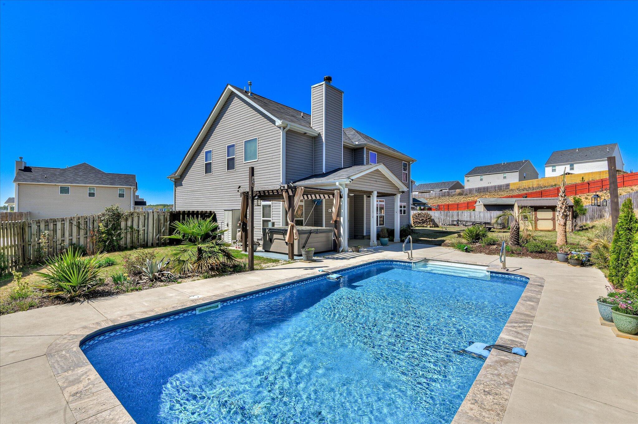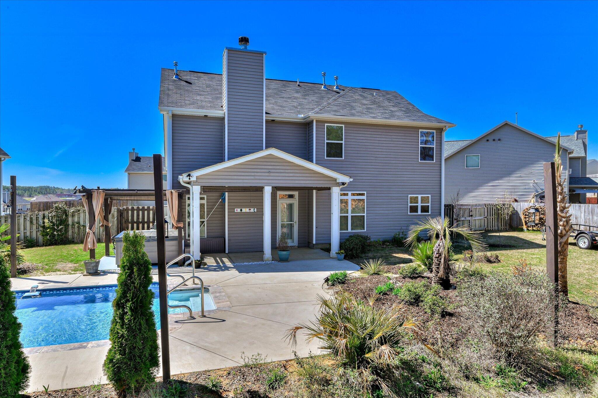 Welcome to your private backyard retreat in Graniteville! Situated on a rare .52-acre lot -- much larger than most homes in the neighborhood -- this beautiful 4-bedroom, 2.5-bath home offers space, privacy, and an outdoor lifestyle that's hard to find. The fully fenced backyard is a true highlight featuring an in-ground saltwater pool, pergola-covered patio, saltwater hot tub that conveys, and tropical landscaping with fruit trees, creating your own private oasis perfect for entertaining or relaxing. Inside, the open floor plan offers a spacious kitchen with granite countertops, white cabinets with crown molding, stainless steel appliances, pantry, breakfast bar, and breakfast nook, all open to the large family room with a wood-burning fireplace and access to the covered back porch. A formal dining room provides additional flex space. Upstairs, the oversized owner's suite features custom his-and-hers walk-in closets, dual vanities, soaking tub, separate shower, and private water closet. Three additional bedrooms, full bath, and laundry room complete the upper level. Located less than a mile from I-20 and convenient to SRS, Fort Gordon, Bridgestone, Aiken Regional, USC Aiken, and University Hospital. Homes with lots this size, pools, and outdoor living like this are hard to find -- don't miss this one.